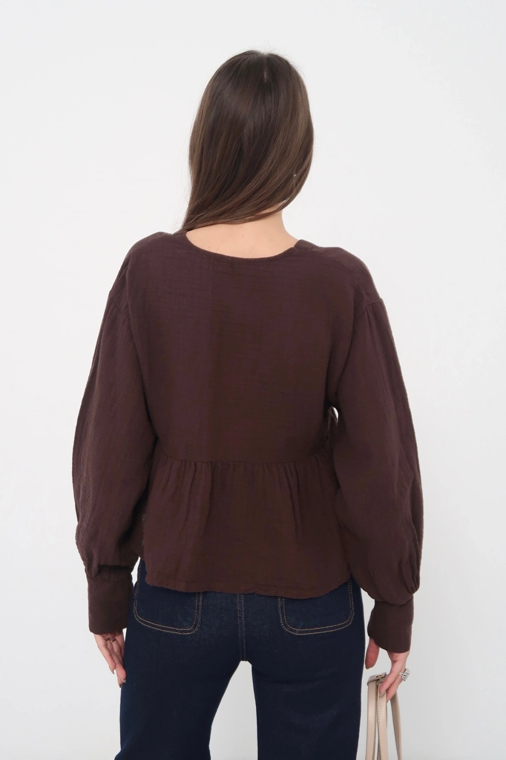 Kadın Kahverengi Bohem Tarz Önden Bağlamalı Bebe Yaka Uzun Kol Müslin Bluz