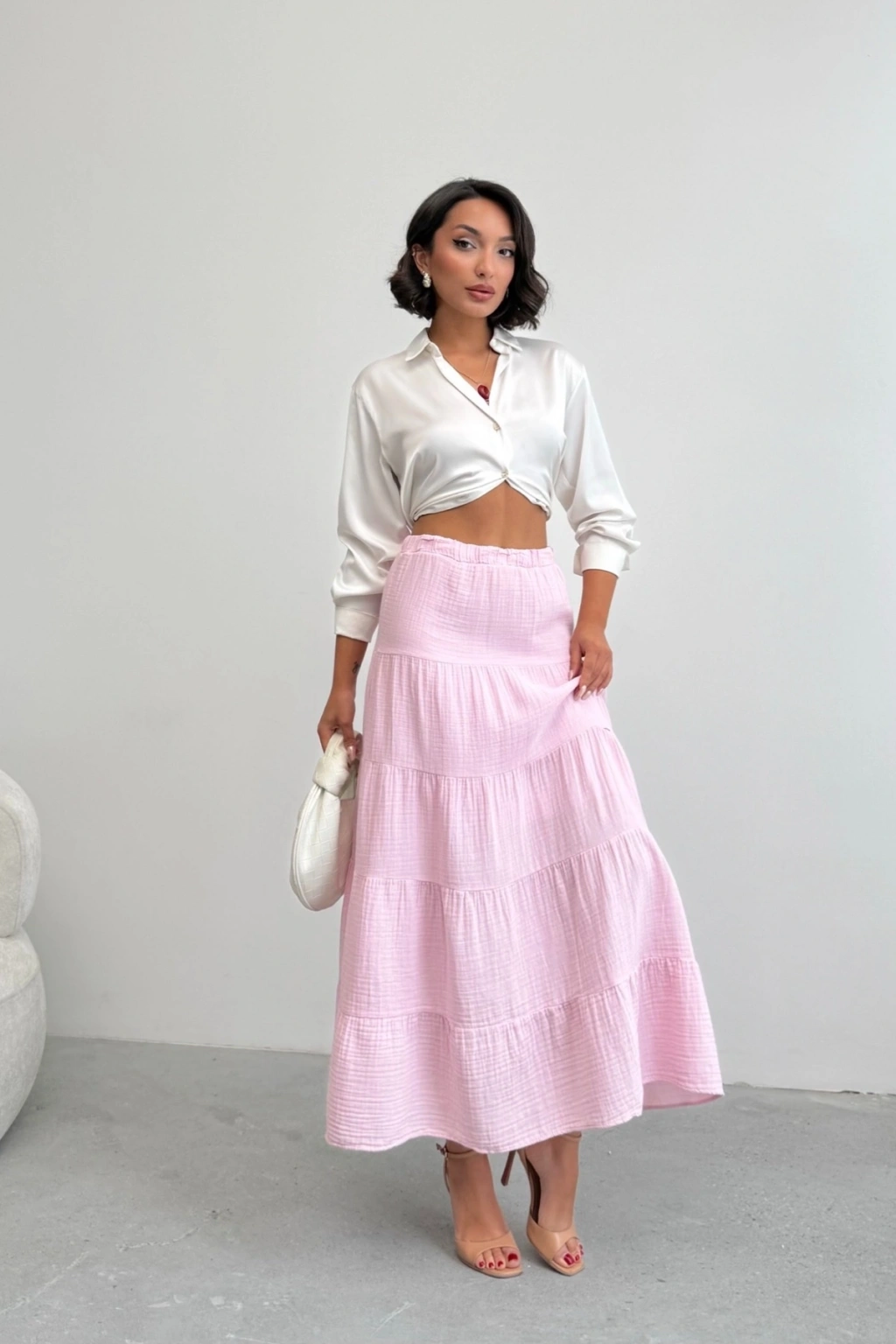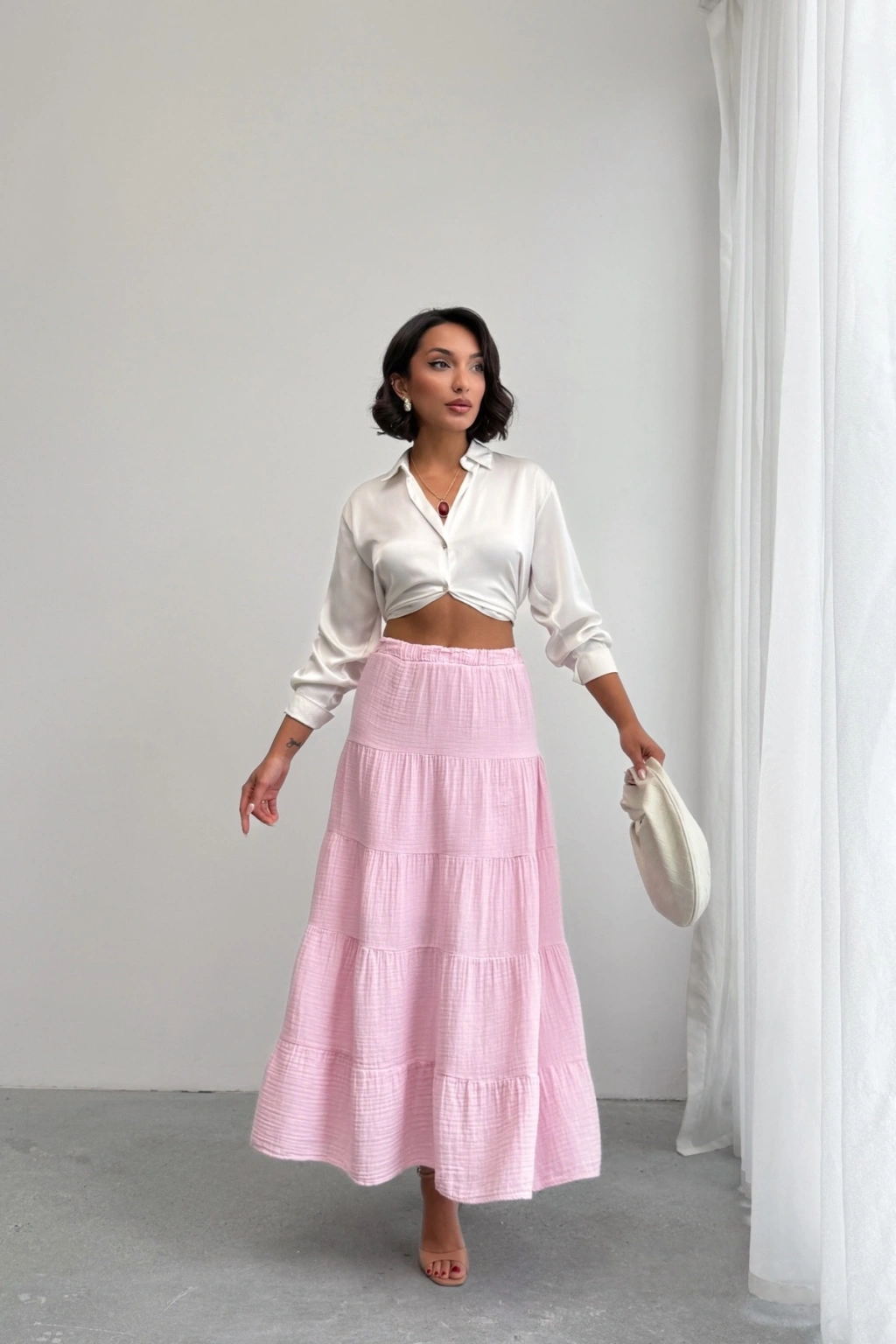 Kadın Şeker Pembe Müslin Kumaş Premium Uzun Etek