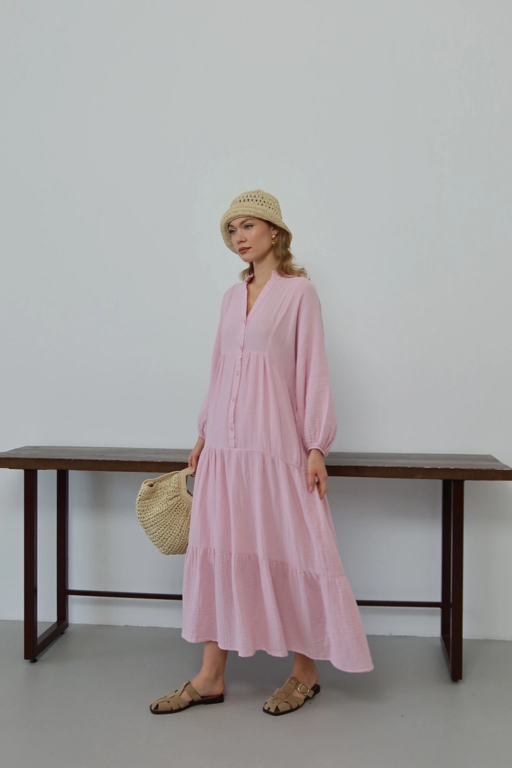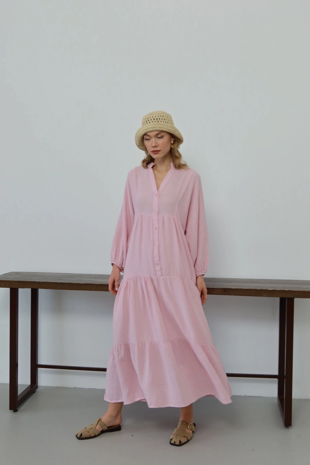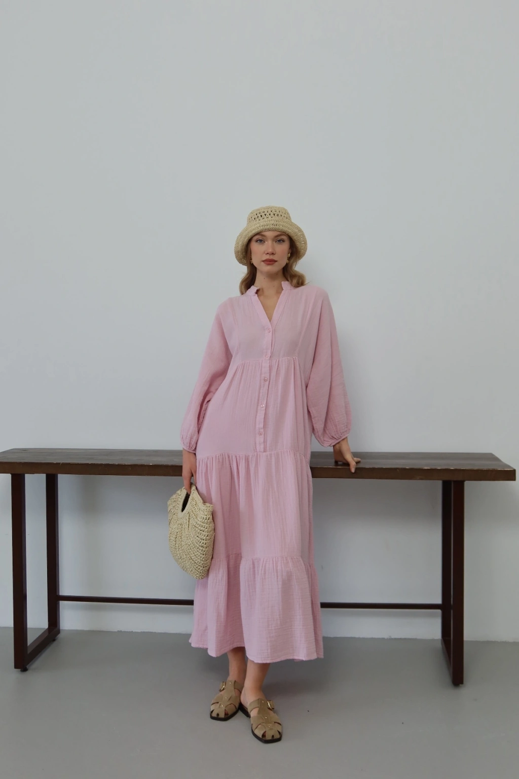 Kadın Şeker Pembe Bohem Tarz Müslin Kumaş Rahat Kalıp Astarlı Uzun Şık Bayramlık Elbise