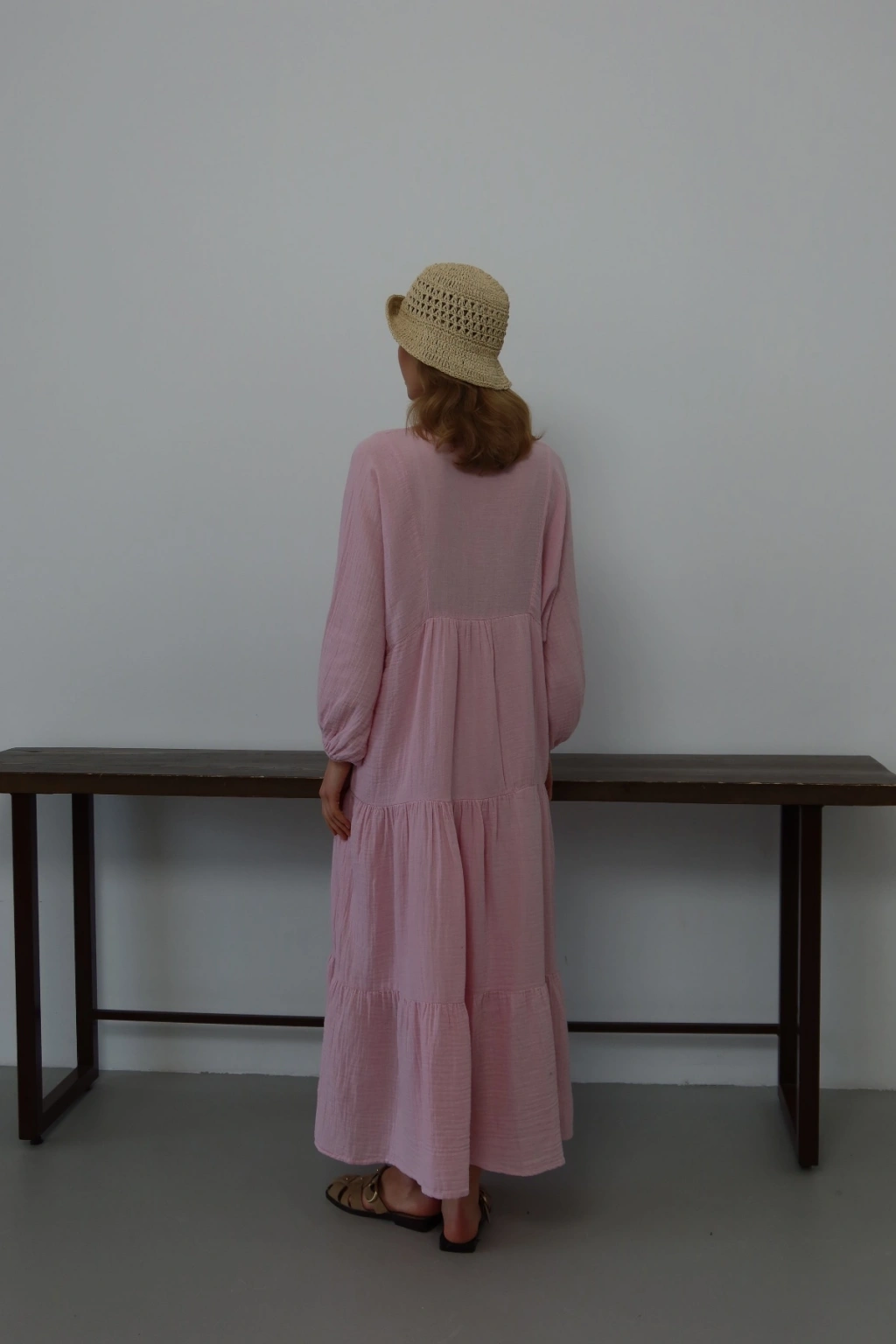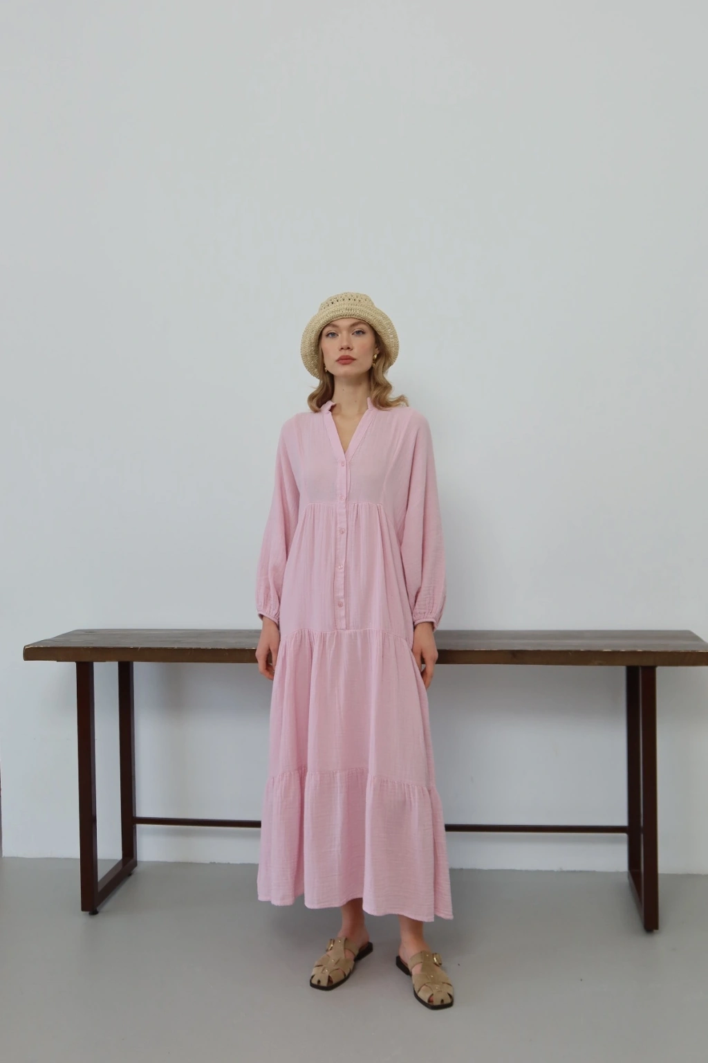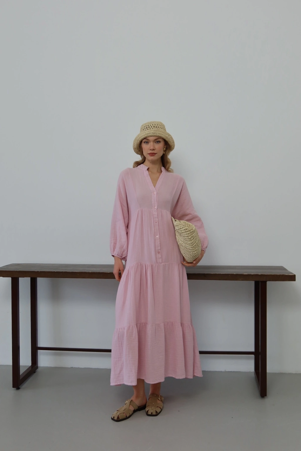 Kadın Şeker Pembe Bohem Tarz Müslin Kumaş Rahat Kalıp Astarlı Uzun Şık Bayramlık Elbise