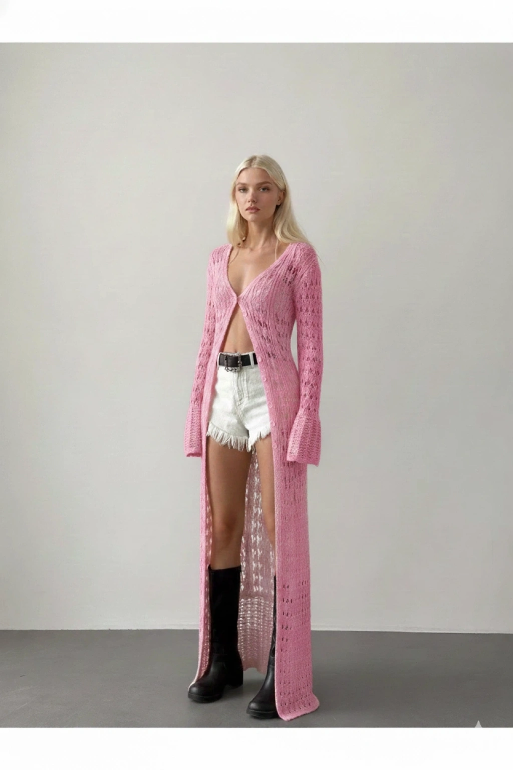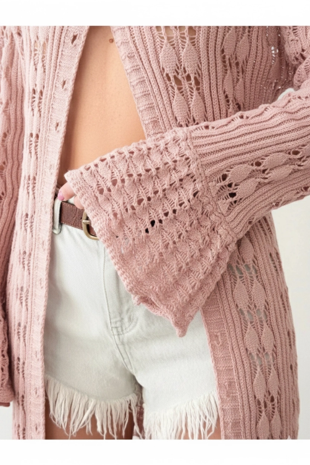 Kadın Şeker Pembe Boydan Düğmeli Ajurlu İspanyol Kol Uzun Triko Hırka
