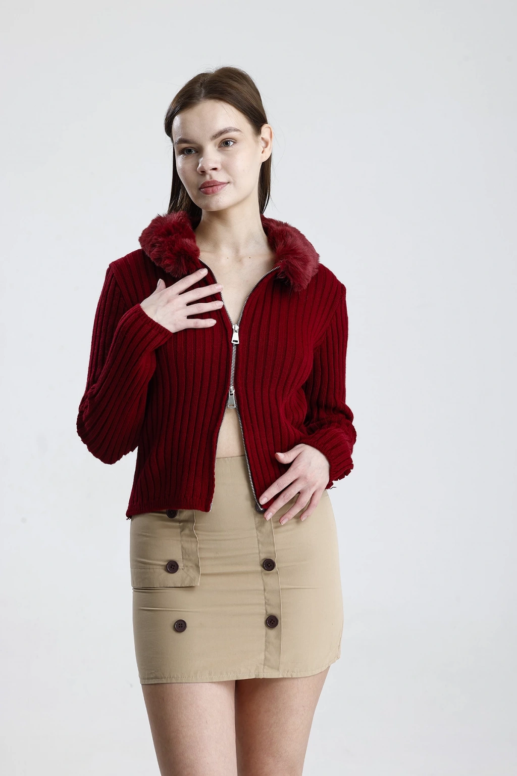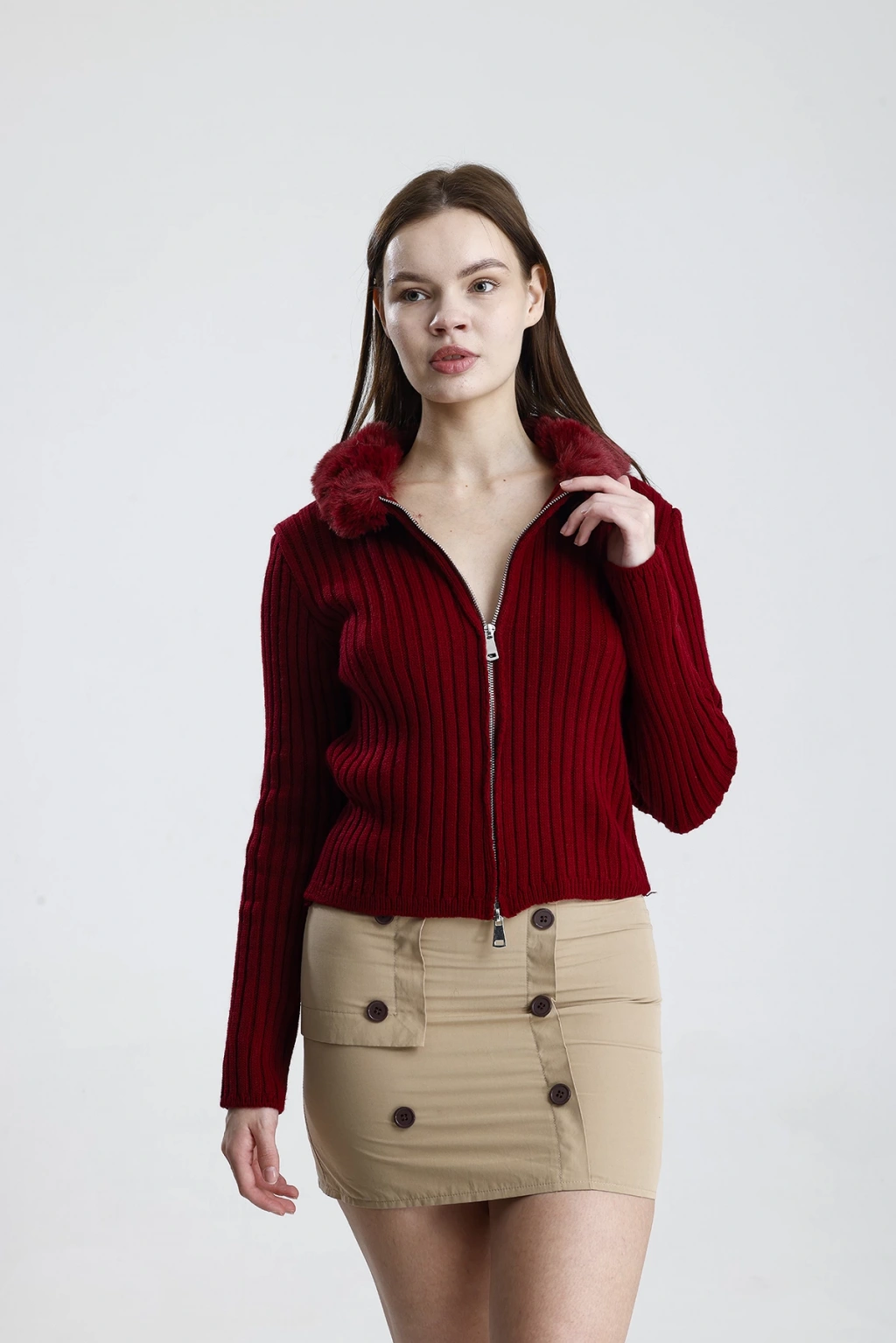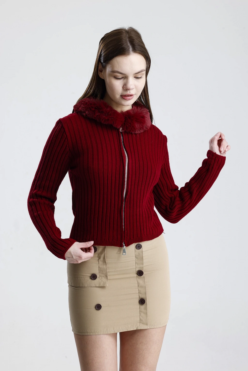 Model: Çift fermuarlı, kürk yaka detaylı kadın triko hırka