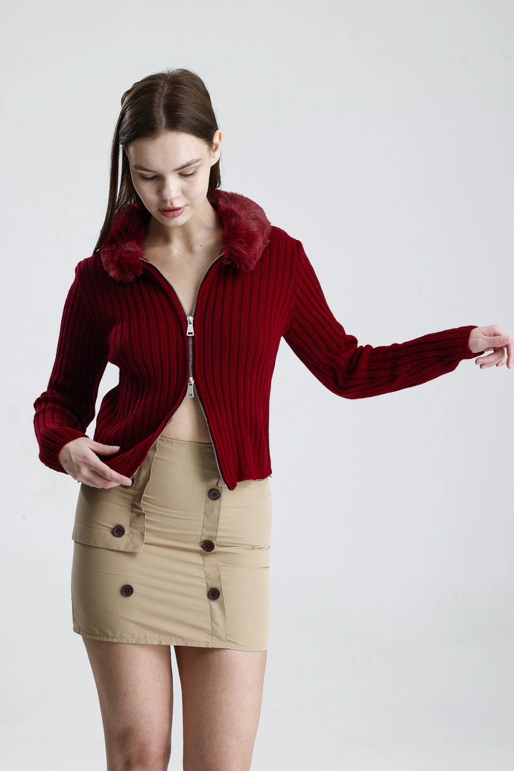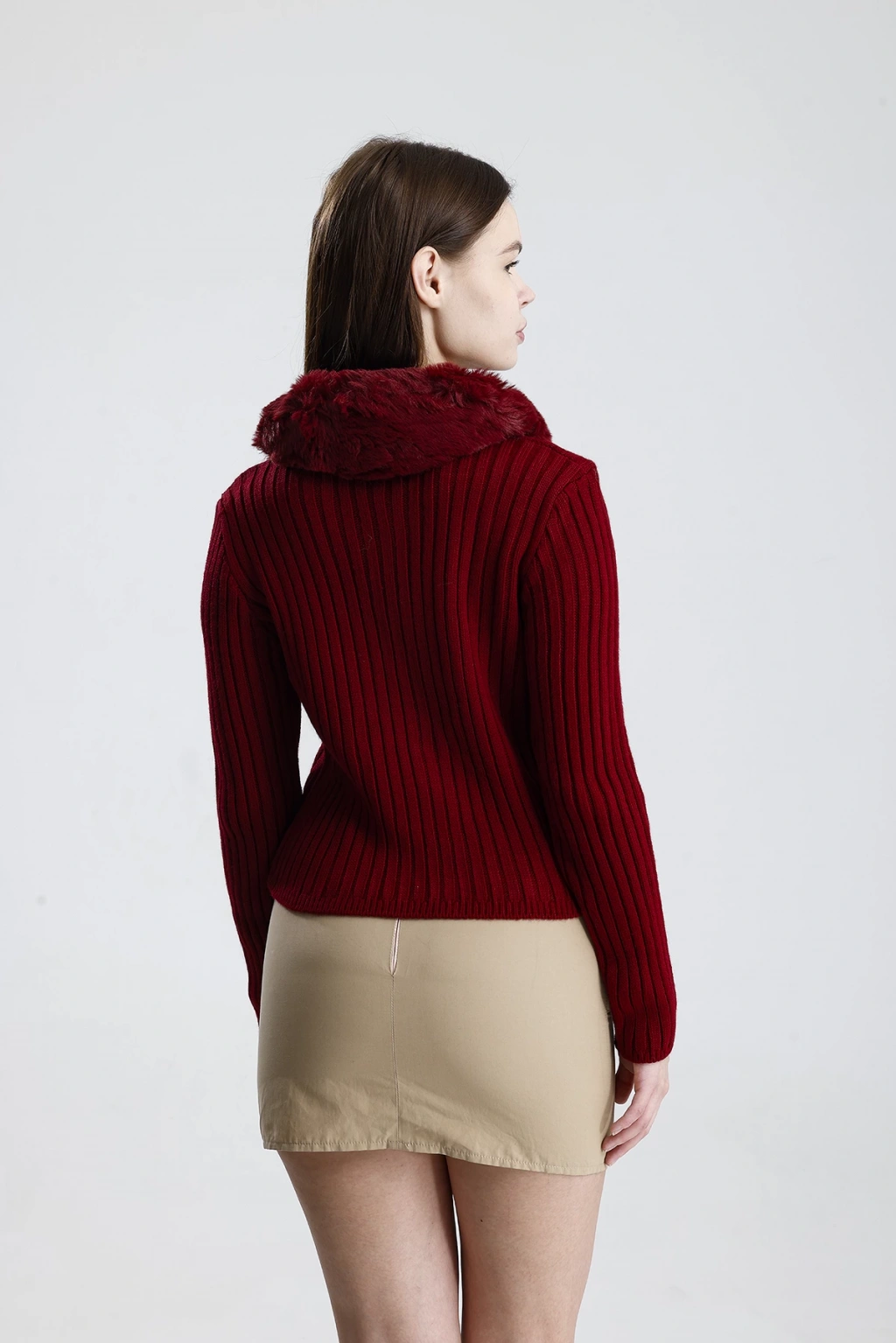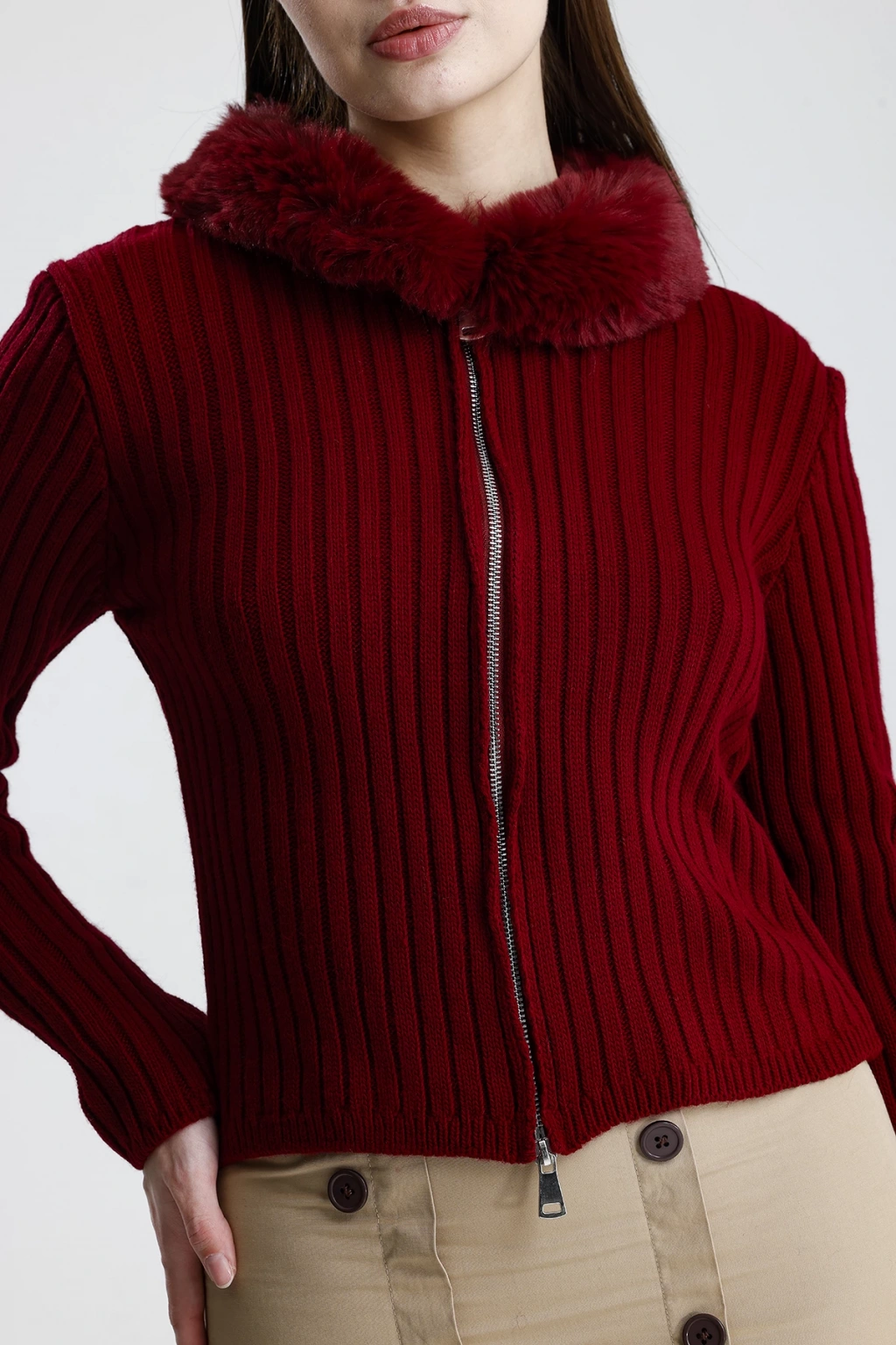 Model: Çift fermuarlı, kürk yaka detaylı kadın triko hırka