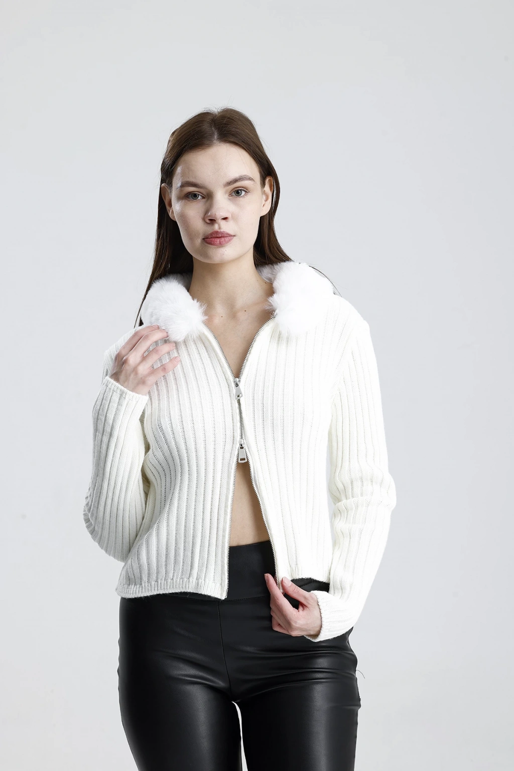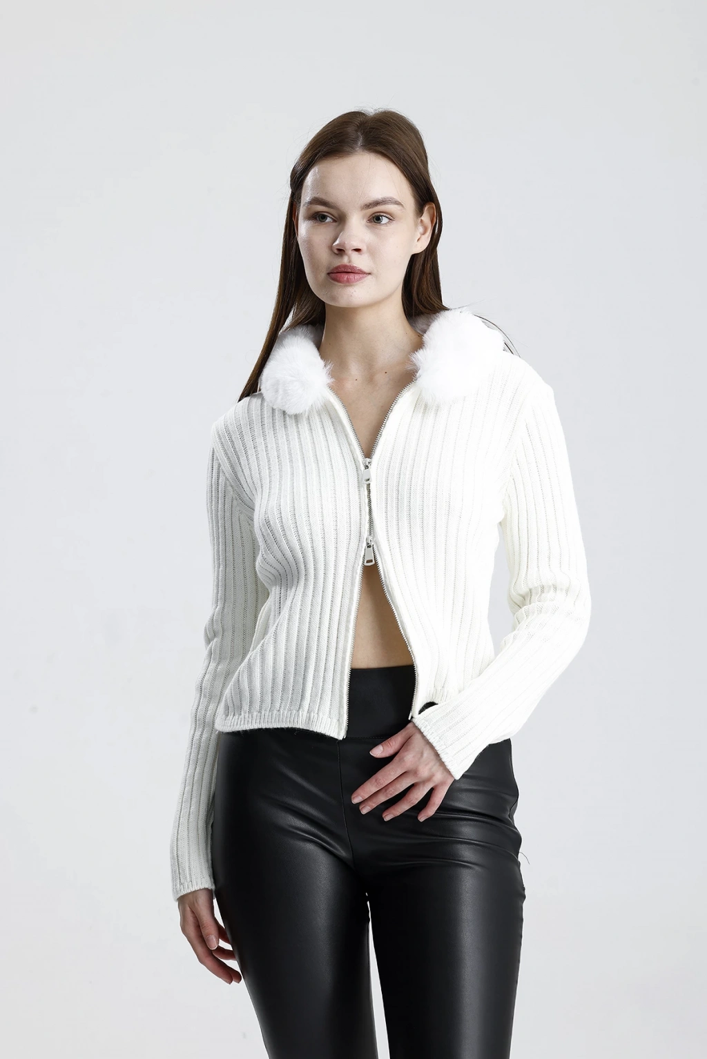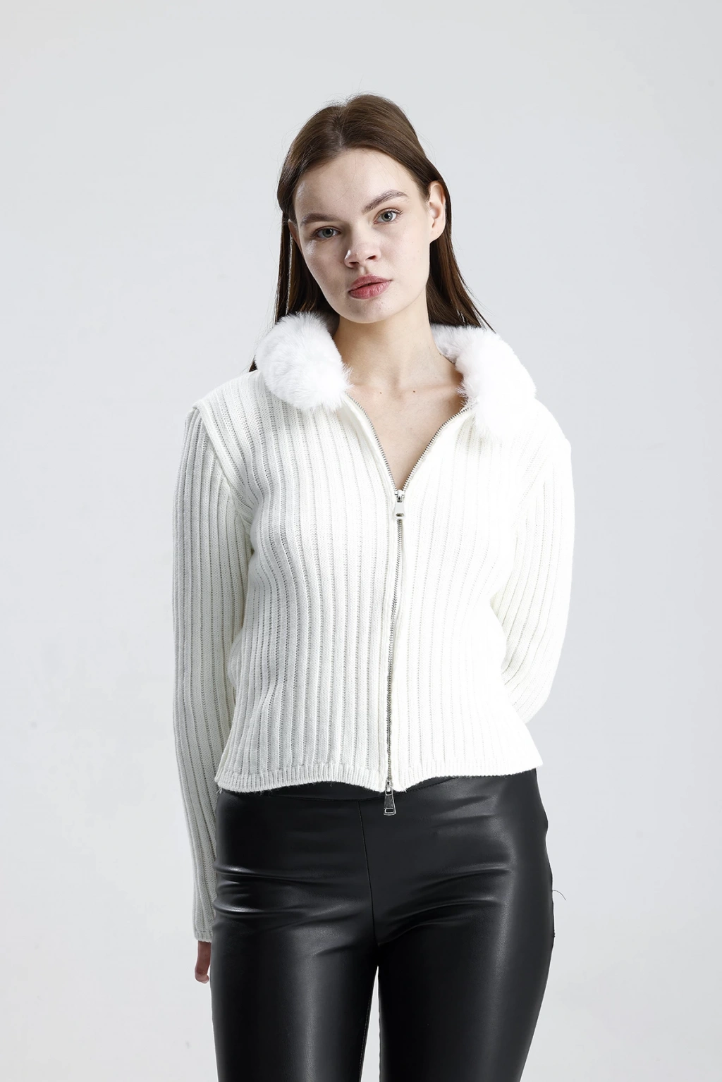 Model: Çift fermuarlı, kürk yaka detaylı kadın triko hırka