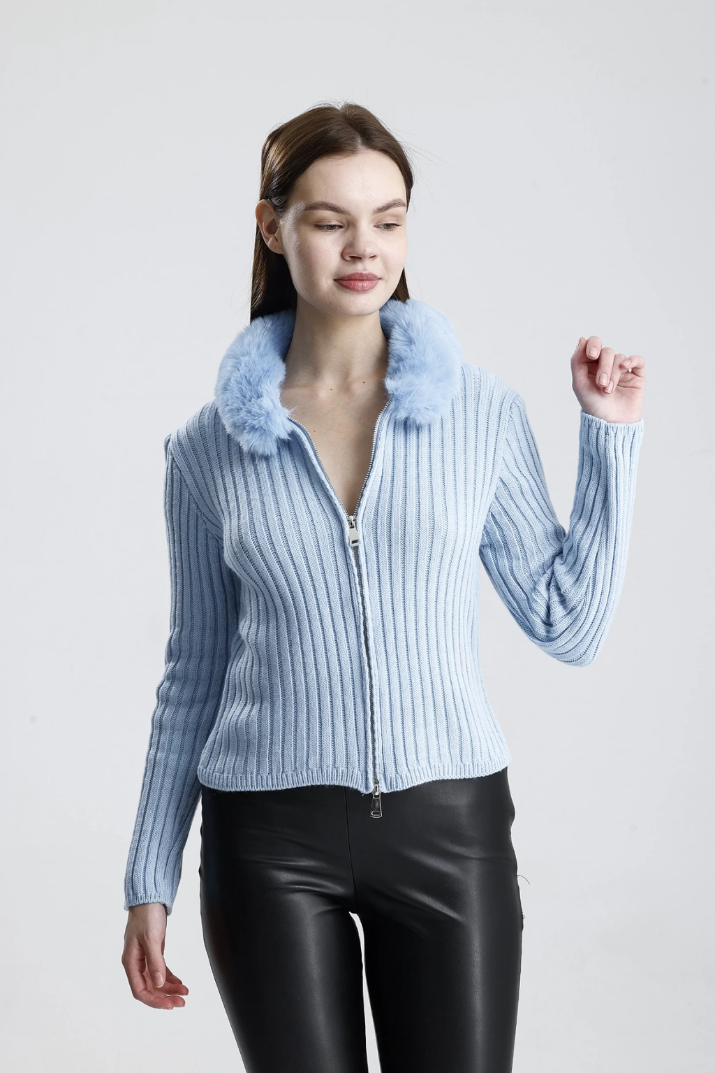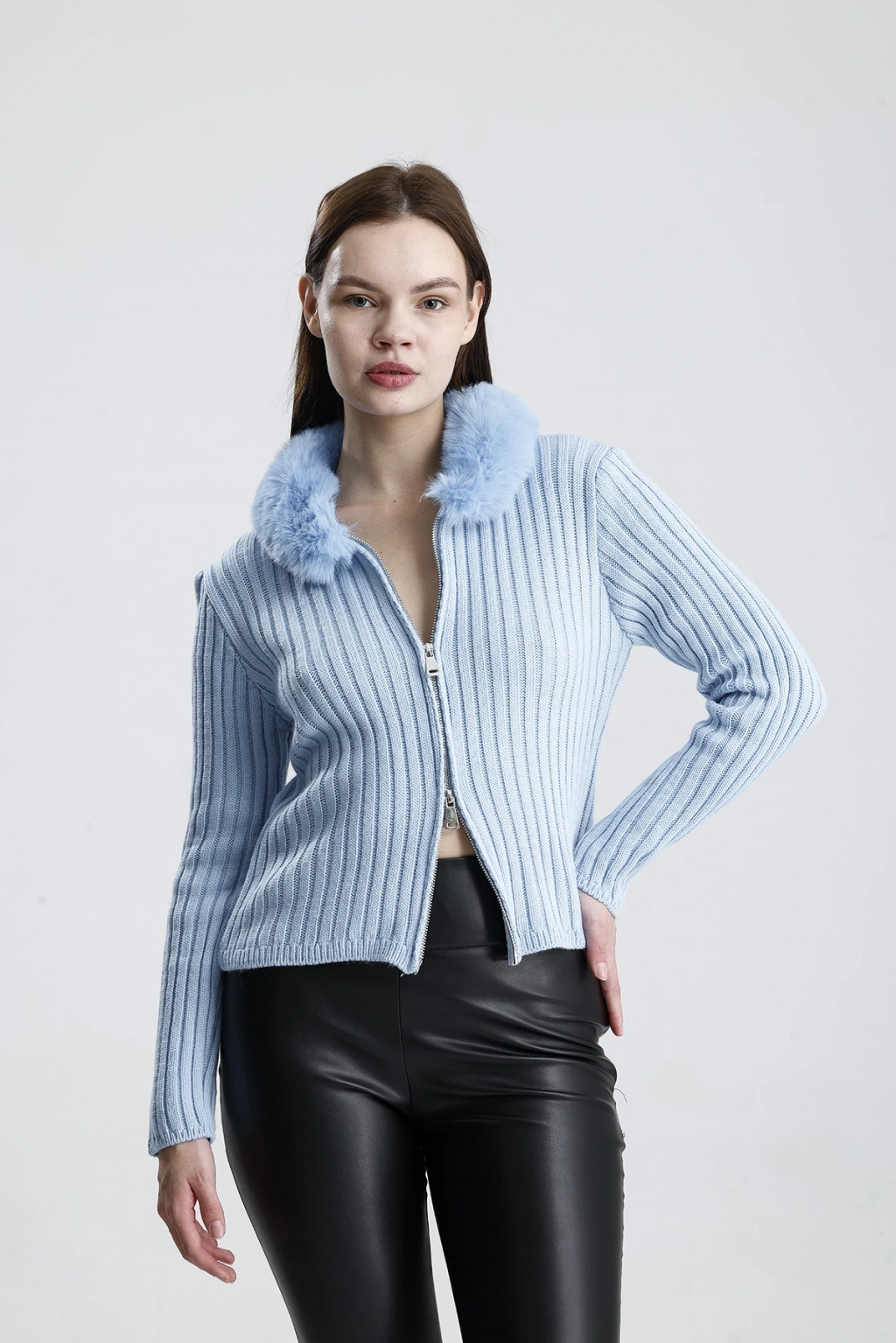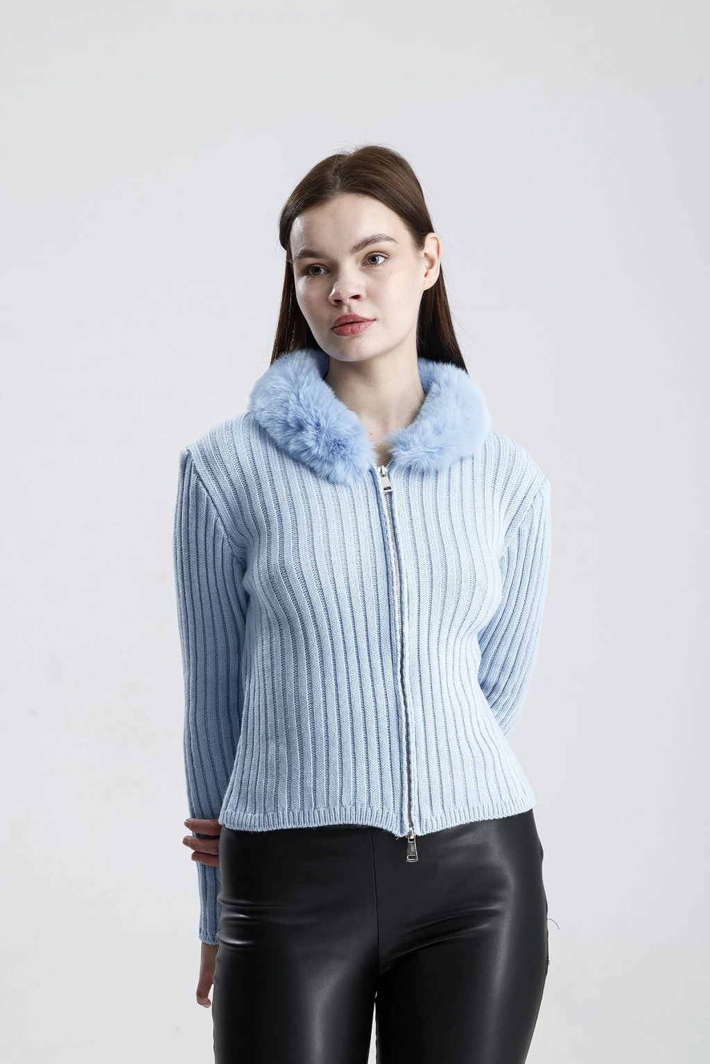 Model: Çift fermuarlı, kürk yaka detaylı kadın triko hırka