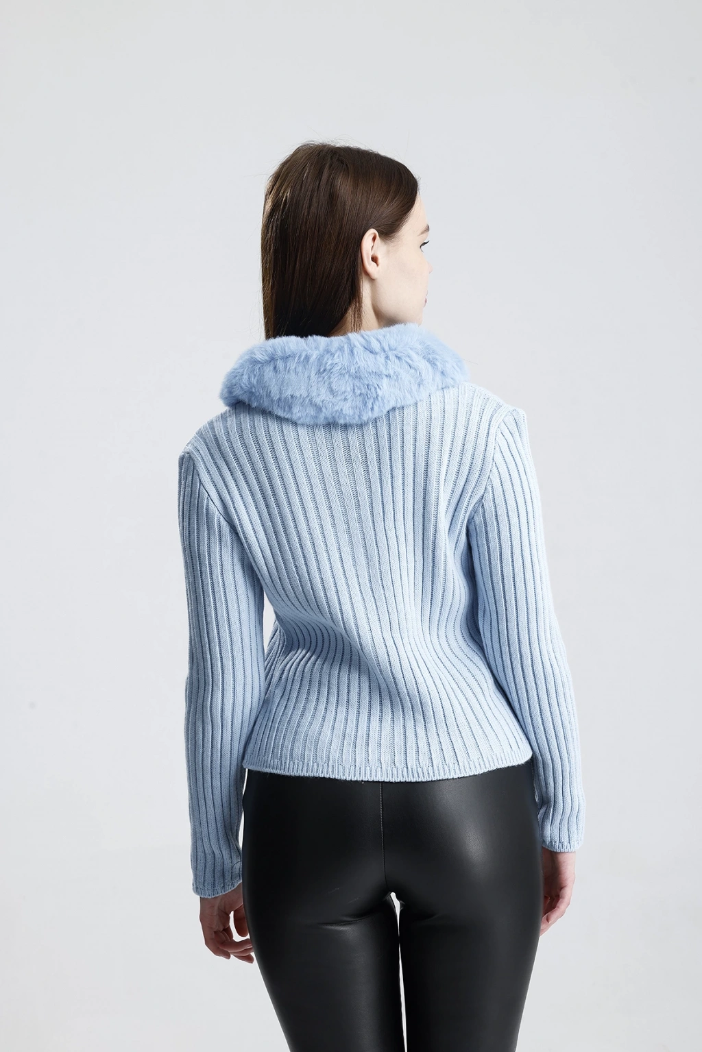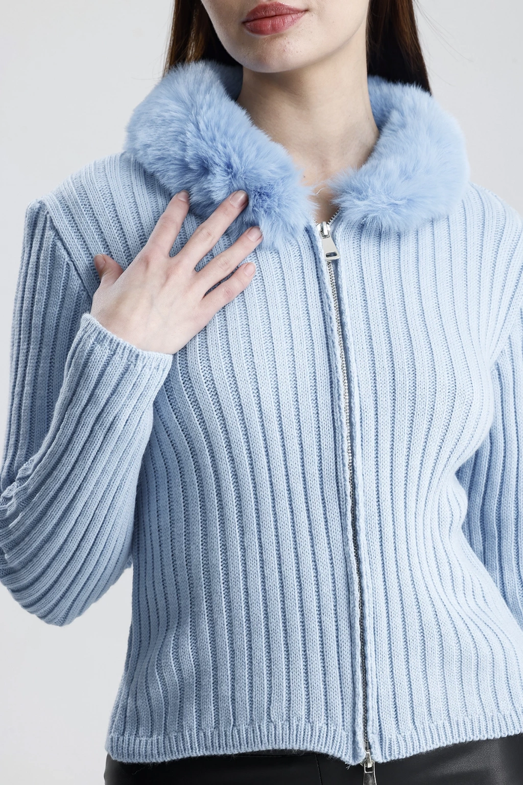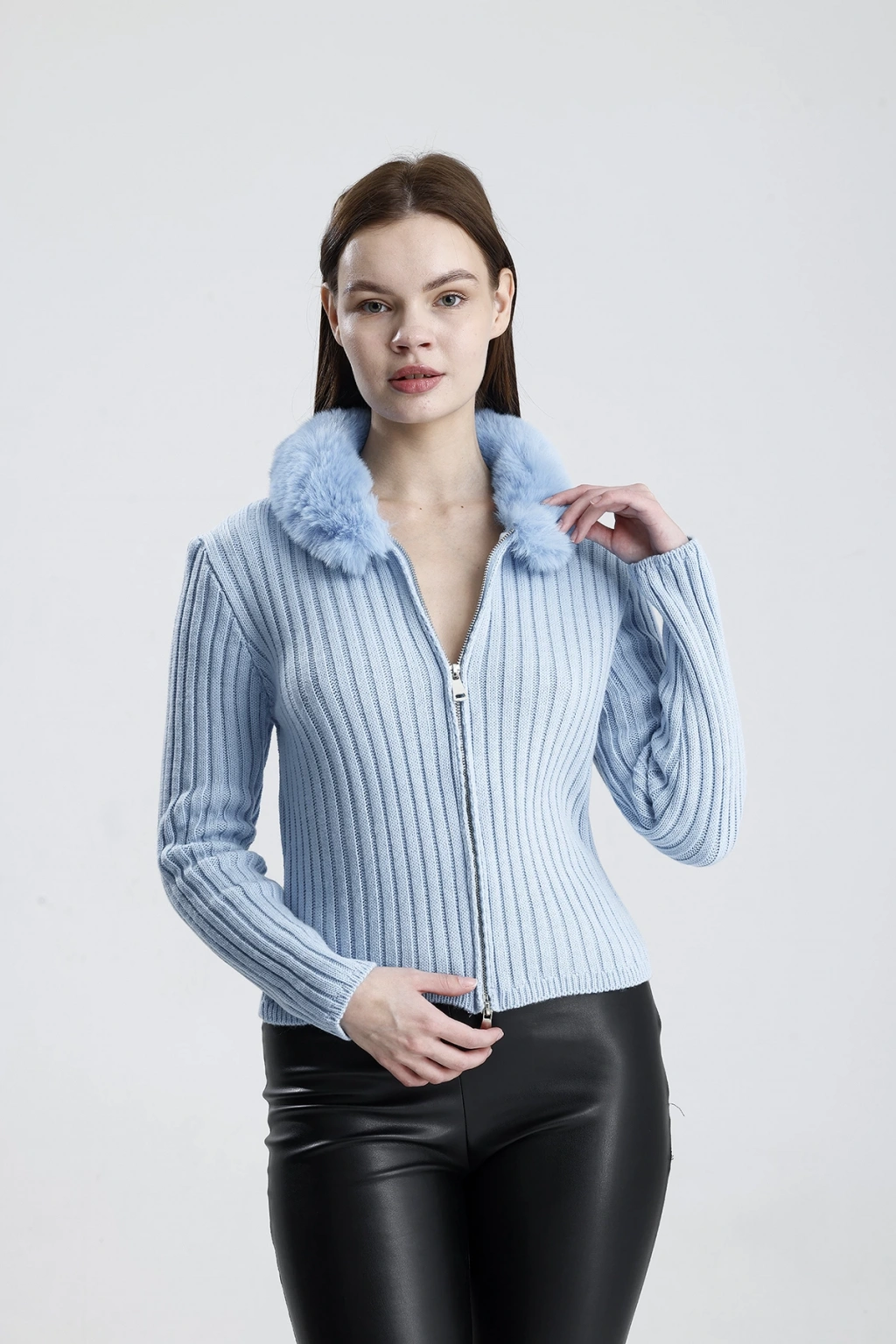 Model: Çift fermuarlı, kürk yaka detaylı kadın triko hırka