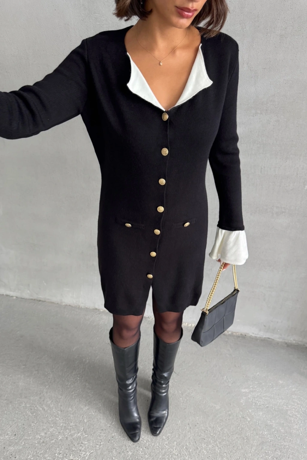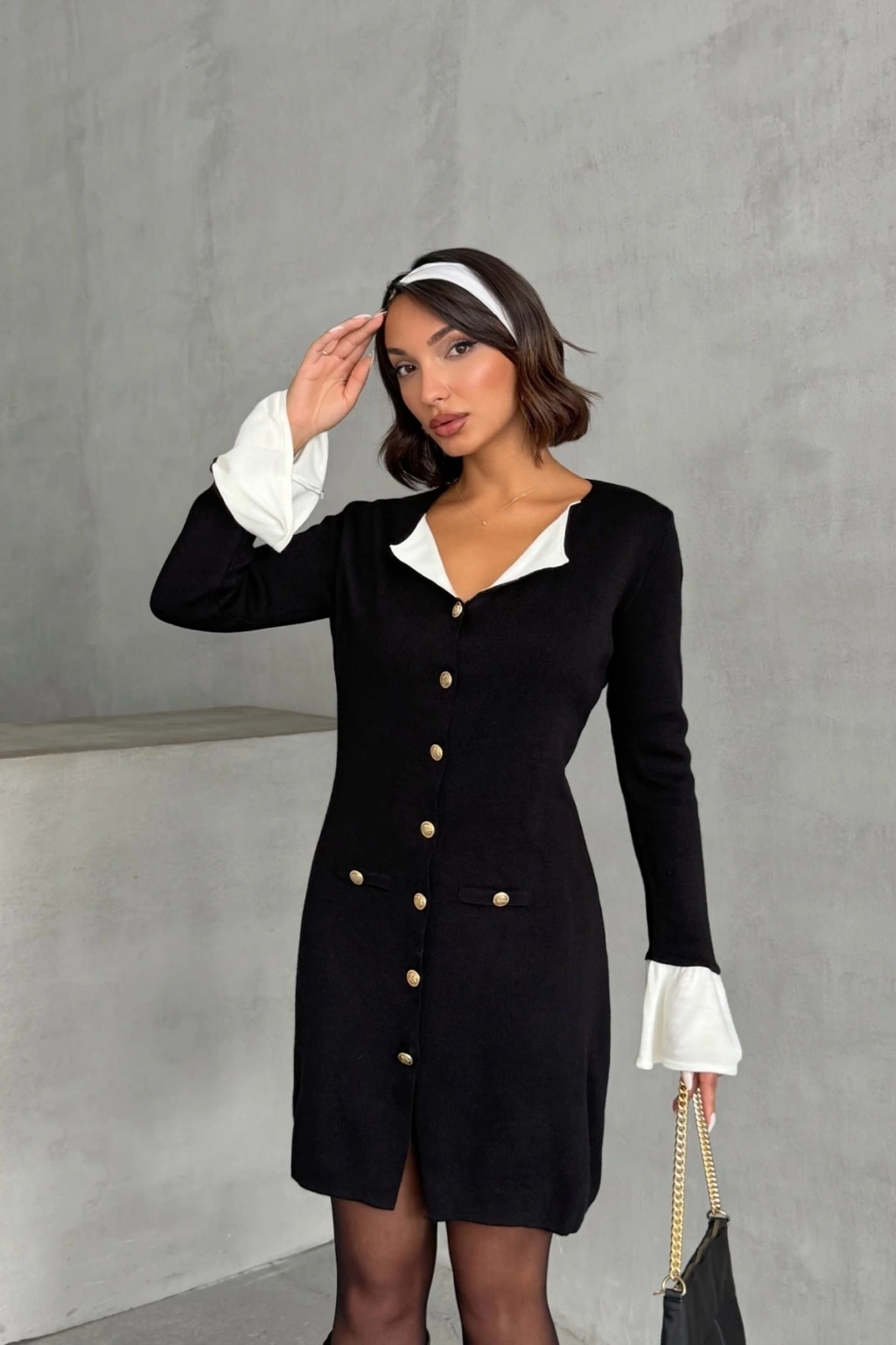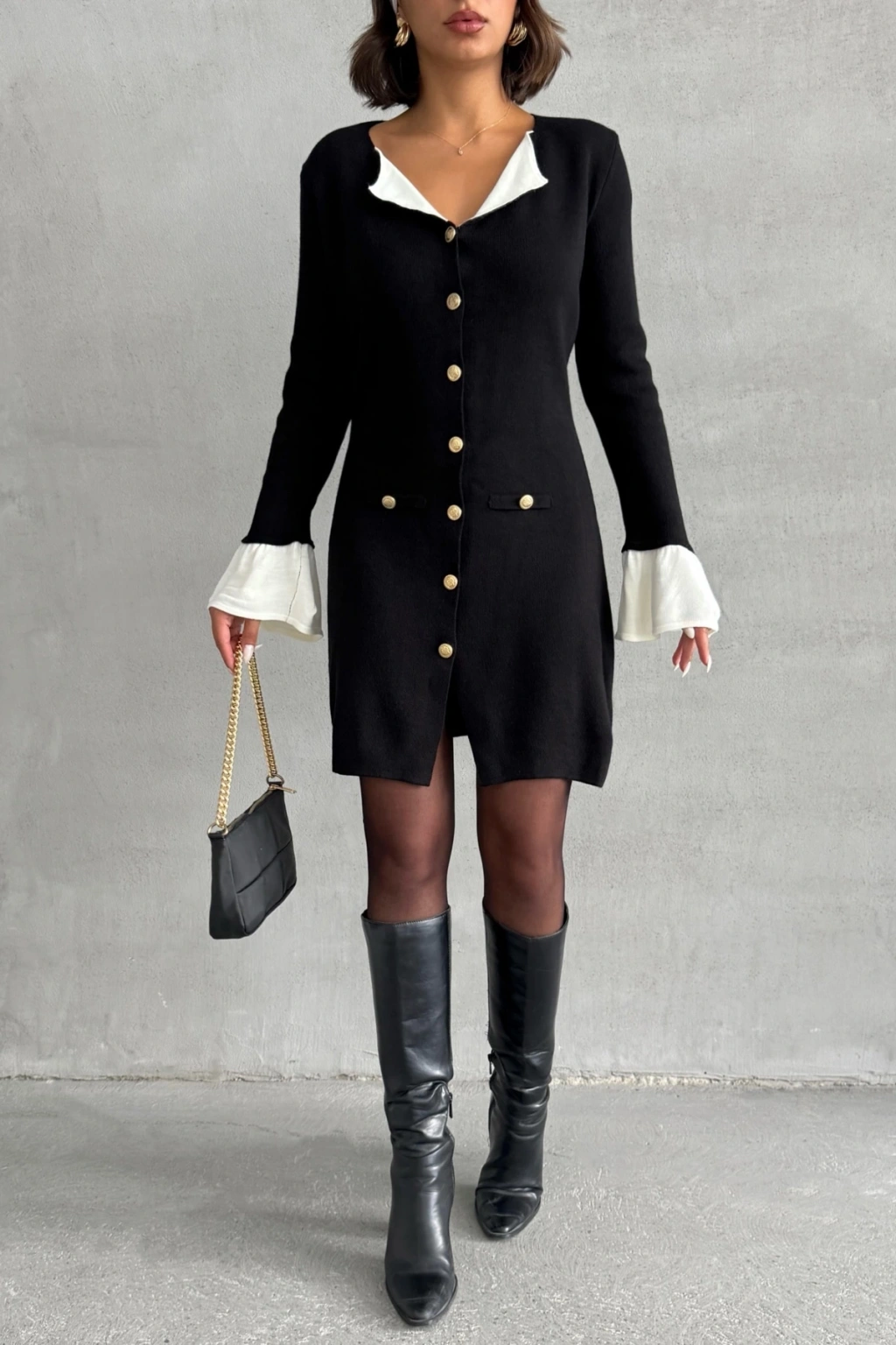 Kadın Siyah Şık Kol ve Yaka Detaylı Düğmeli Zarif Mini Triko Elbise