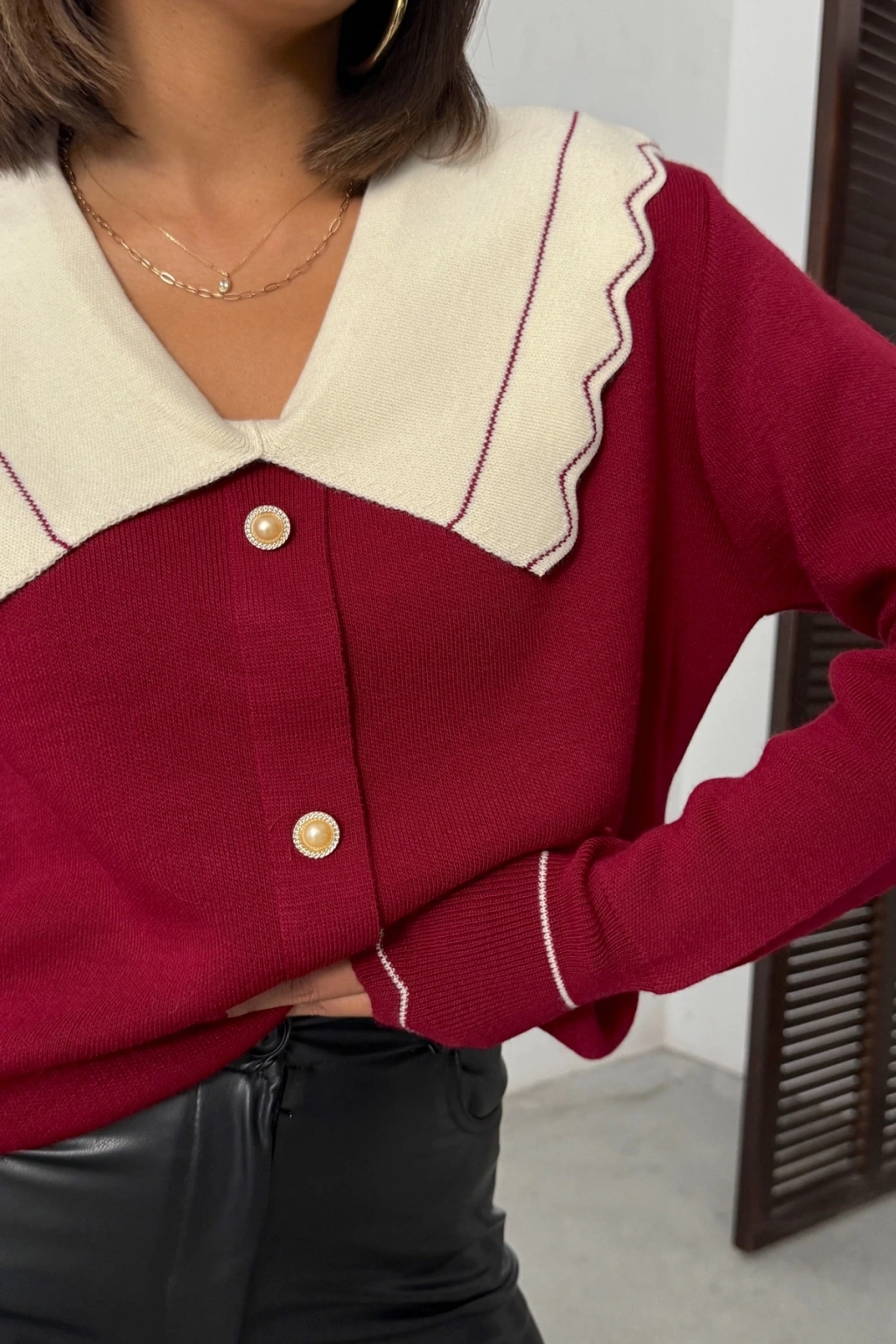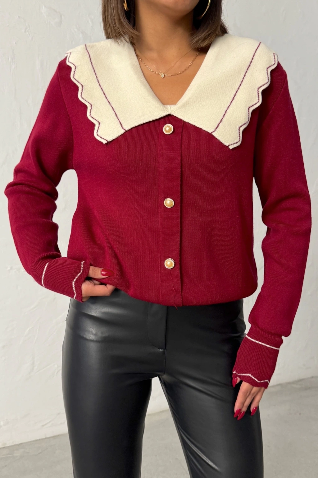 Kadın Şık Yaka Detaylı Düğmeli Hırka - Bordo