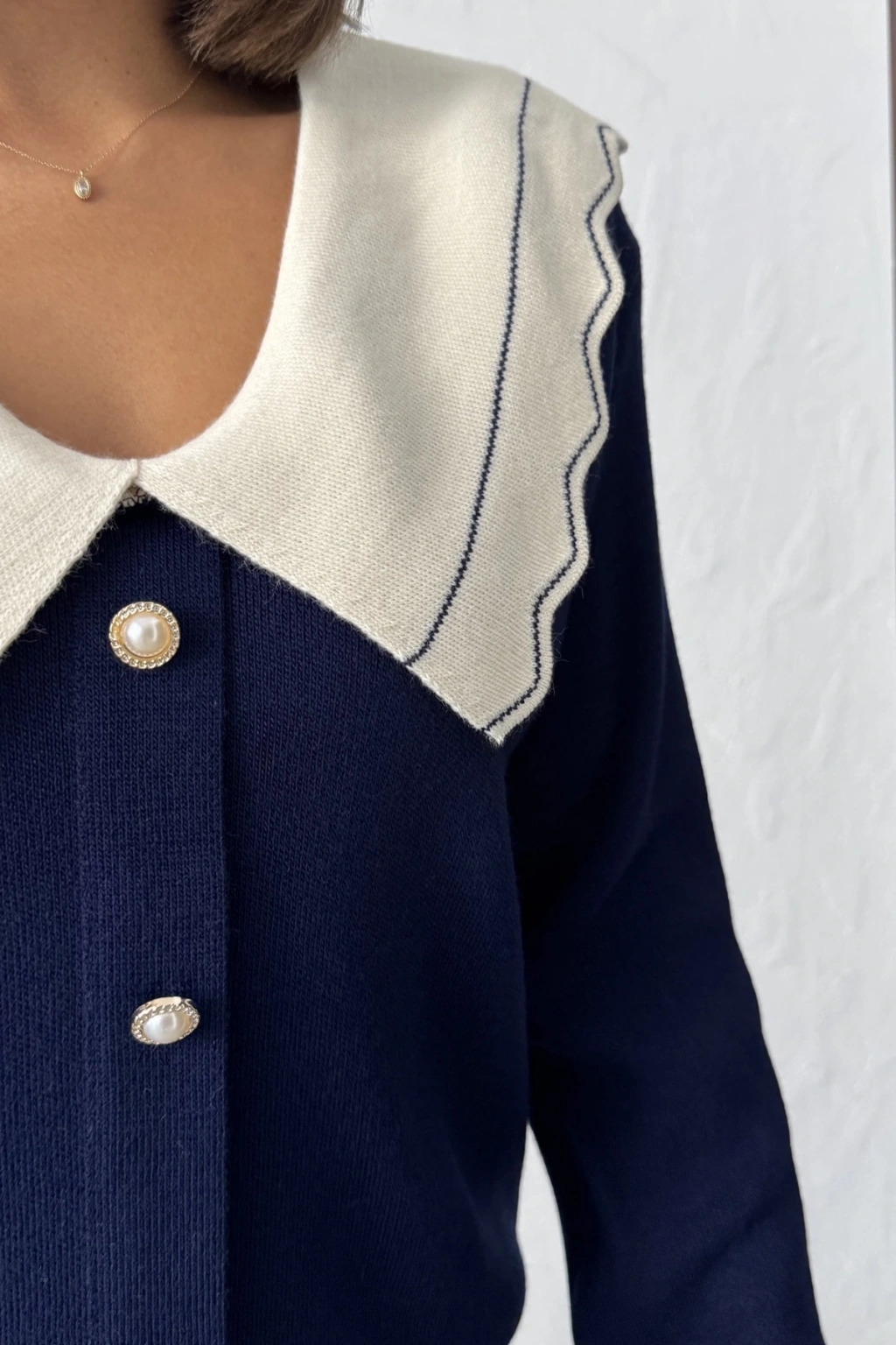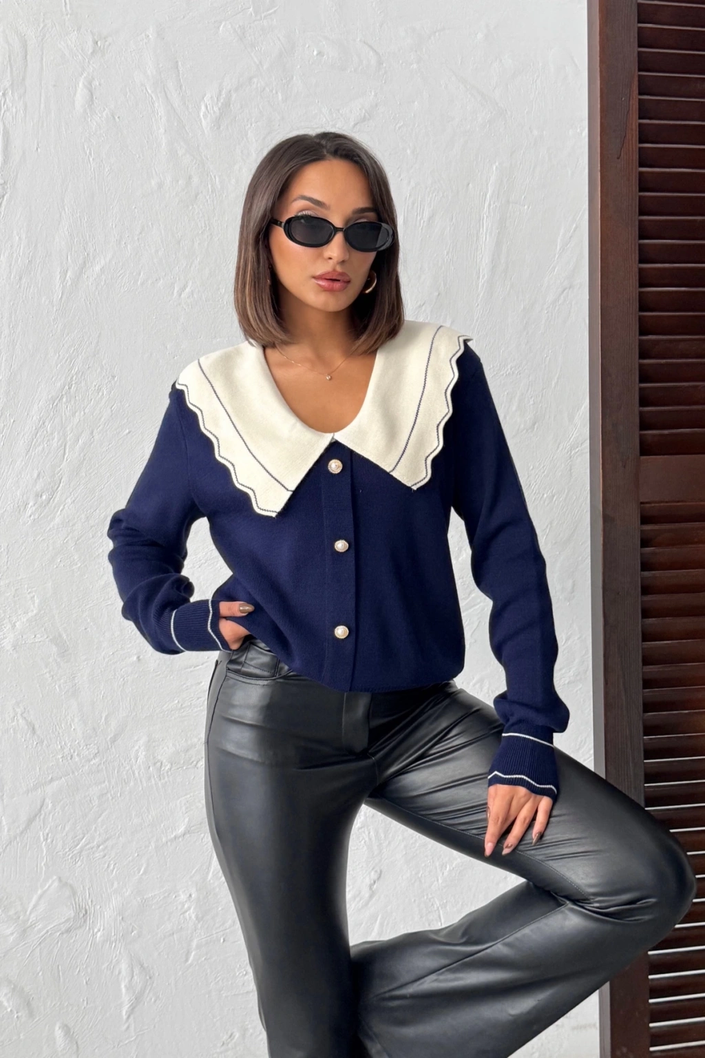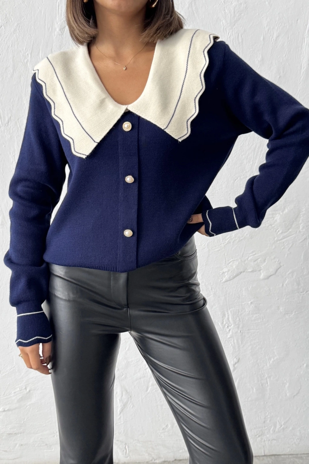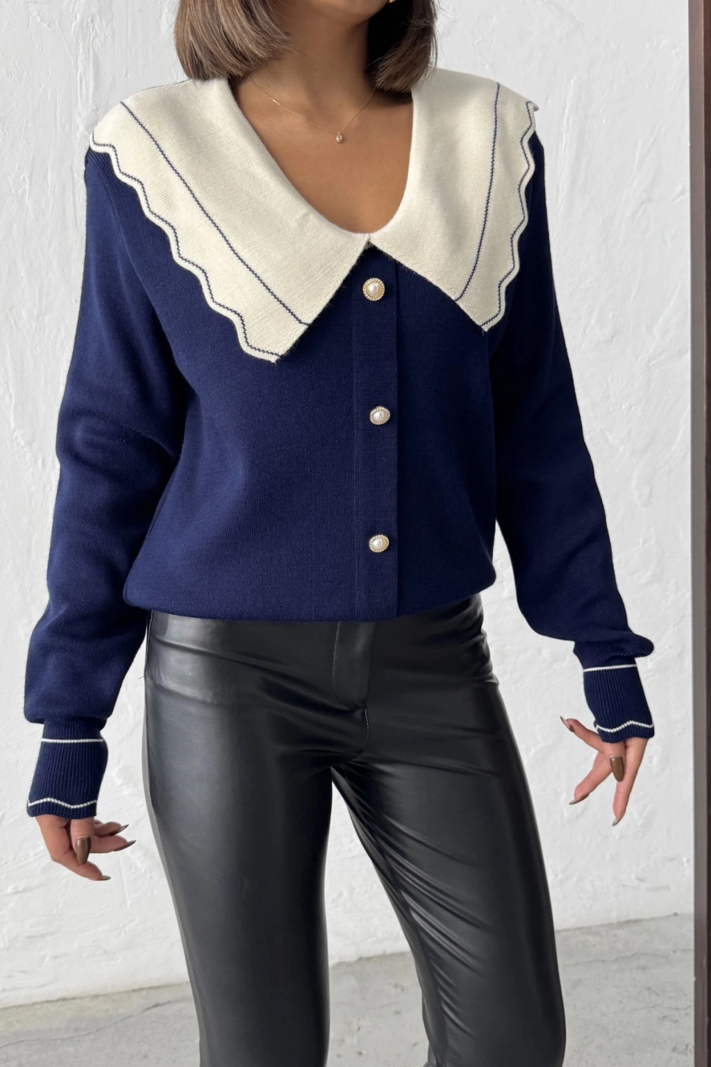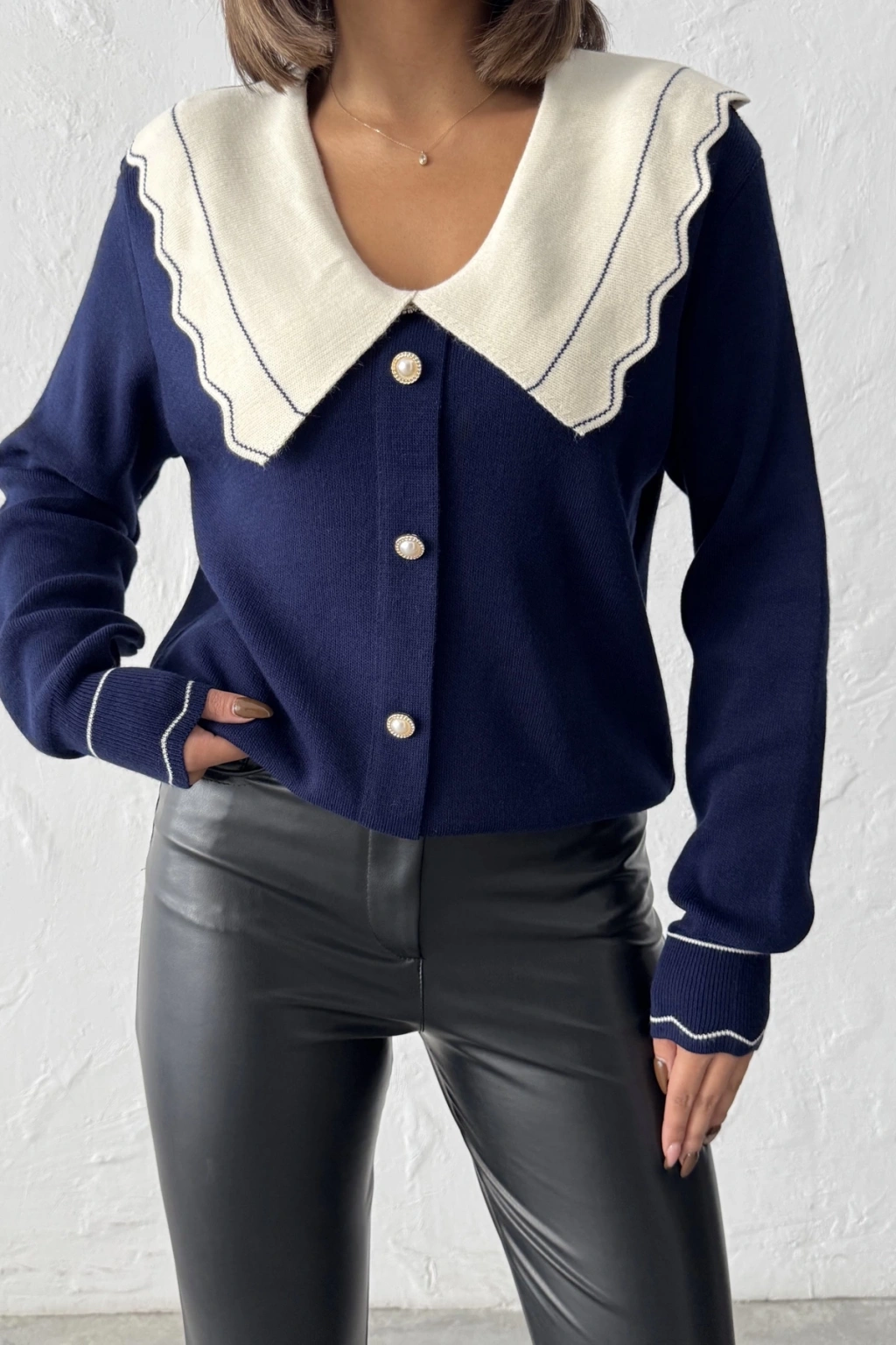 Kadın Lacivert Şık Yaka Detaylı Düğmeli Hırka (Yeni Renk)