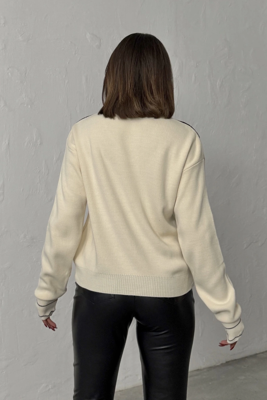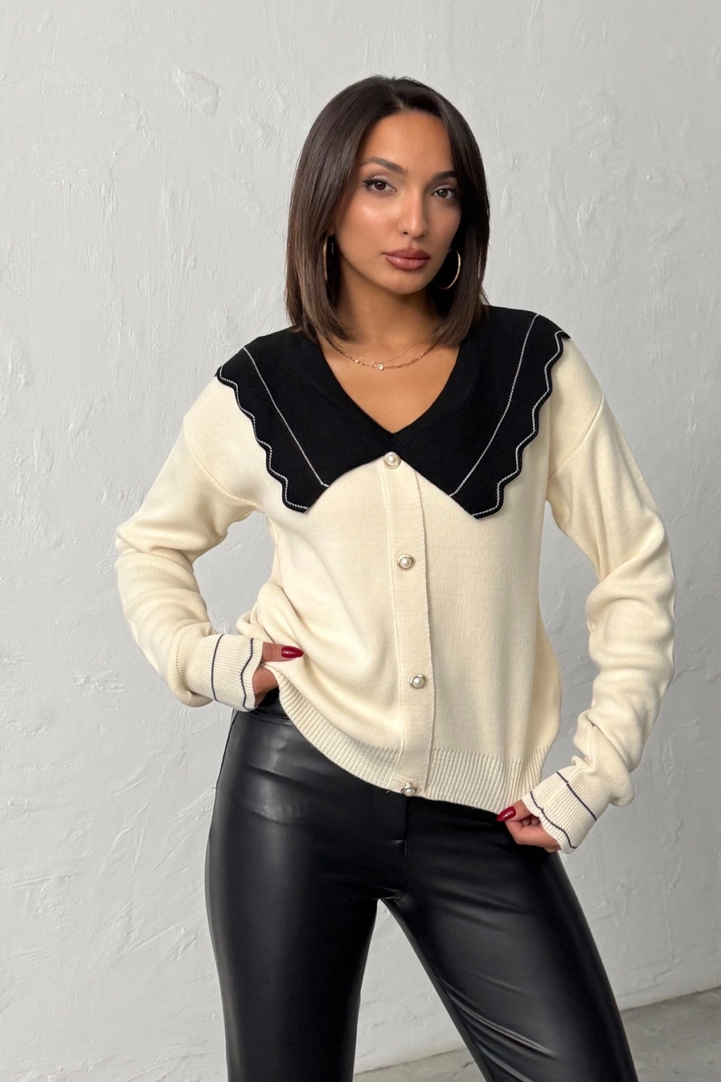 Rahat kesimiyle günlük kullanım için ideal olan bu hırka bluz, bebe yakası detayıyla şıklığı ve konforu bir arada sunar.; ; Uzun kolları sayesinde serin havalarda ekstra koruma sağlarken, düz kesimiyle modern bir görünüm kazandırır.; - Düğmeli ; Sade ve düz deseniyle her türlü kombininize kolayca uyum sağlayarak gardrobunuzun temel parçalarından biri haline gelecek ; Tersten düşük ısıda ütülenmesi önerilen bakım talimatlarına uyarak uzun süreli kullanım imkanı tanır.; ; Ekru rengiyle zarifliği ön plana çıkaran bu hırka, her gardrobun vazgeçilmez renk paletine mükemmel şekilde uyum sağlar.; ; Orta kalınlığındaki yapısı ile mevsim geçişlerinde ve kış aylarında ideal konforu sunar.; ; Cepsiz oluşu pratiklikten ödün vermeden modern bir görünüm sergilemenizi sağlarken düz kesimiyle rahat hareket etme özgürlüğü tanır ; Basic koleksiyonun sadeliğini yansıtan bu hırka, zamansız parçalar arasında yerini alarak gardrobunuzda uzun süreli kullanım vaad ediyor.; Model Boyu: 171 Hırka Uzunluğu: 57 cm