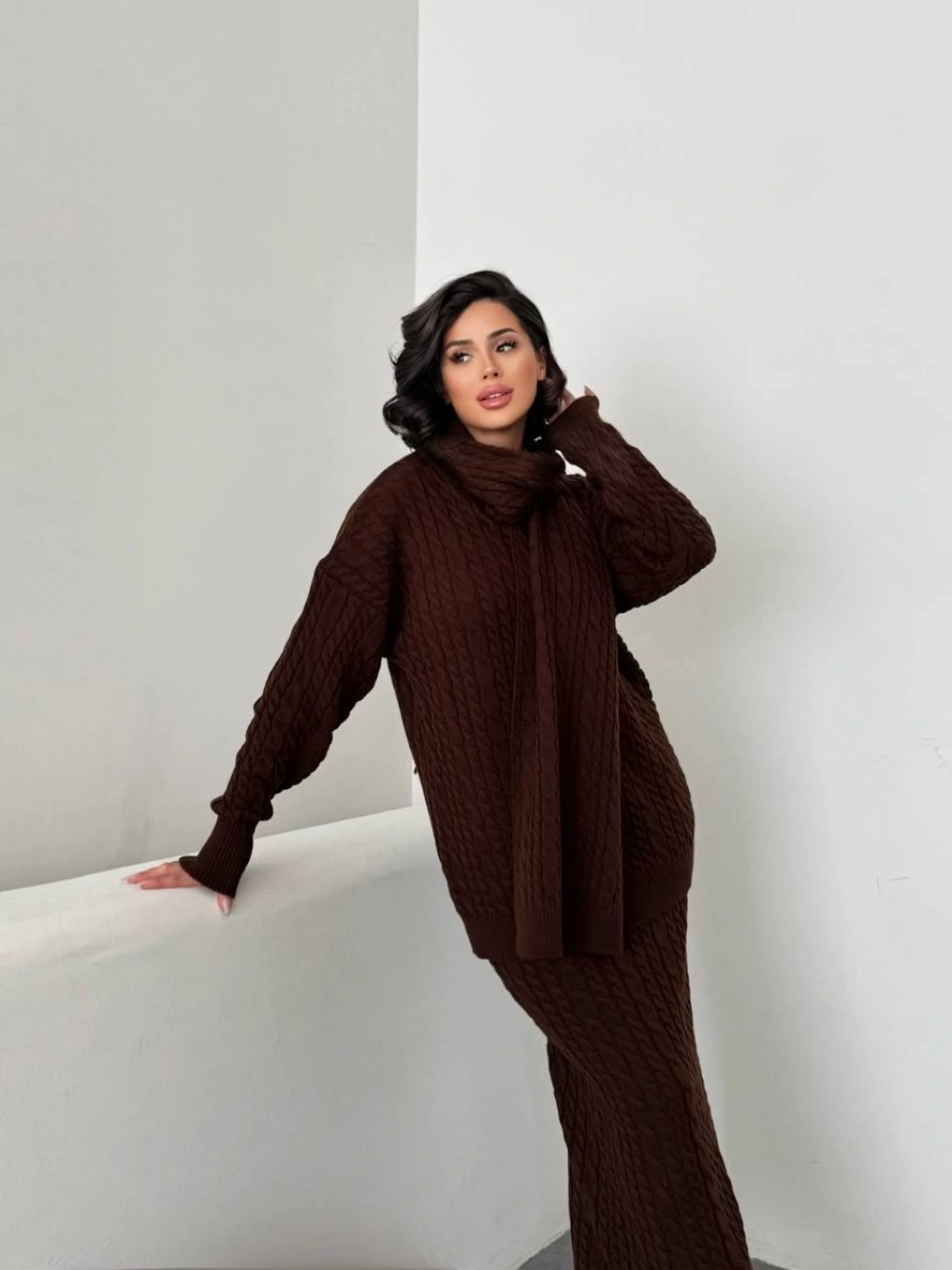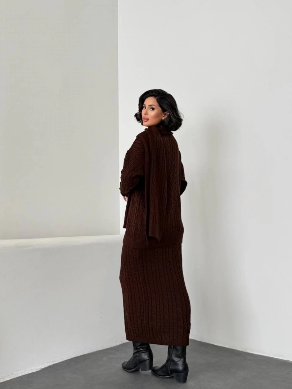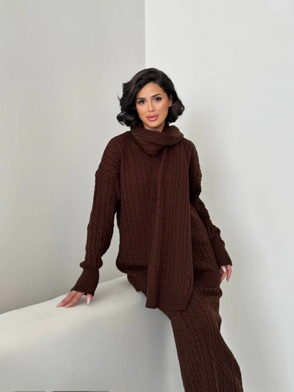 Kadın Acı Kahve Atkılı Saç Örgülü Etek Kazak Atkı 3'lü Takım