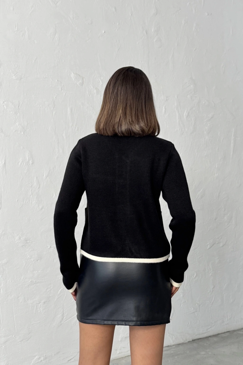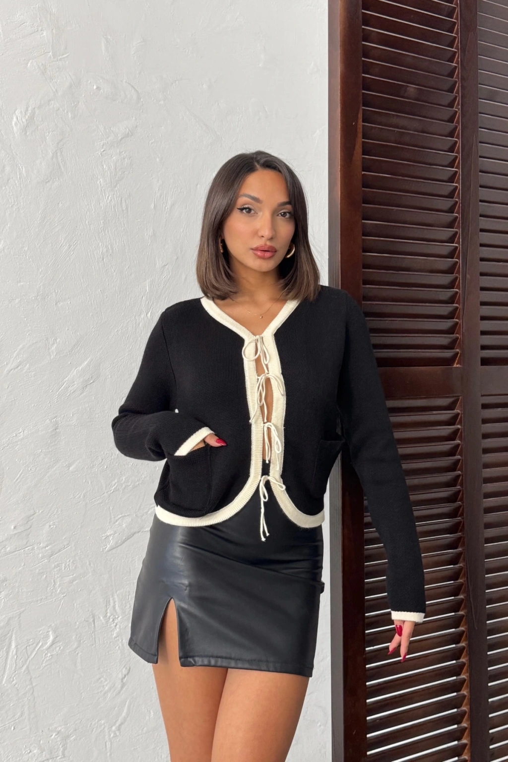 Kadın Siyah Deri ip bağlama detaylı Triko Hırka