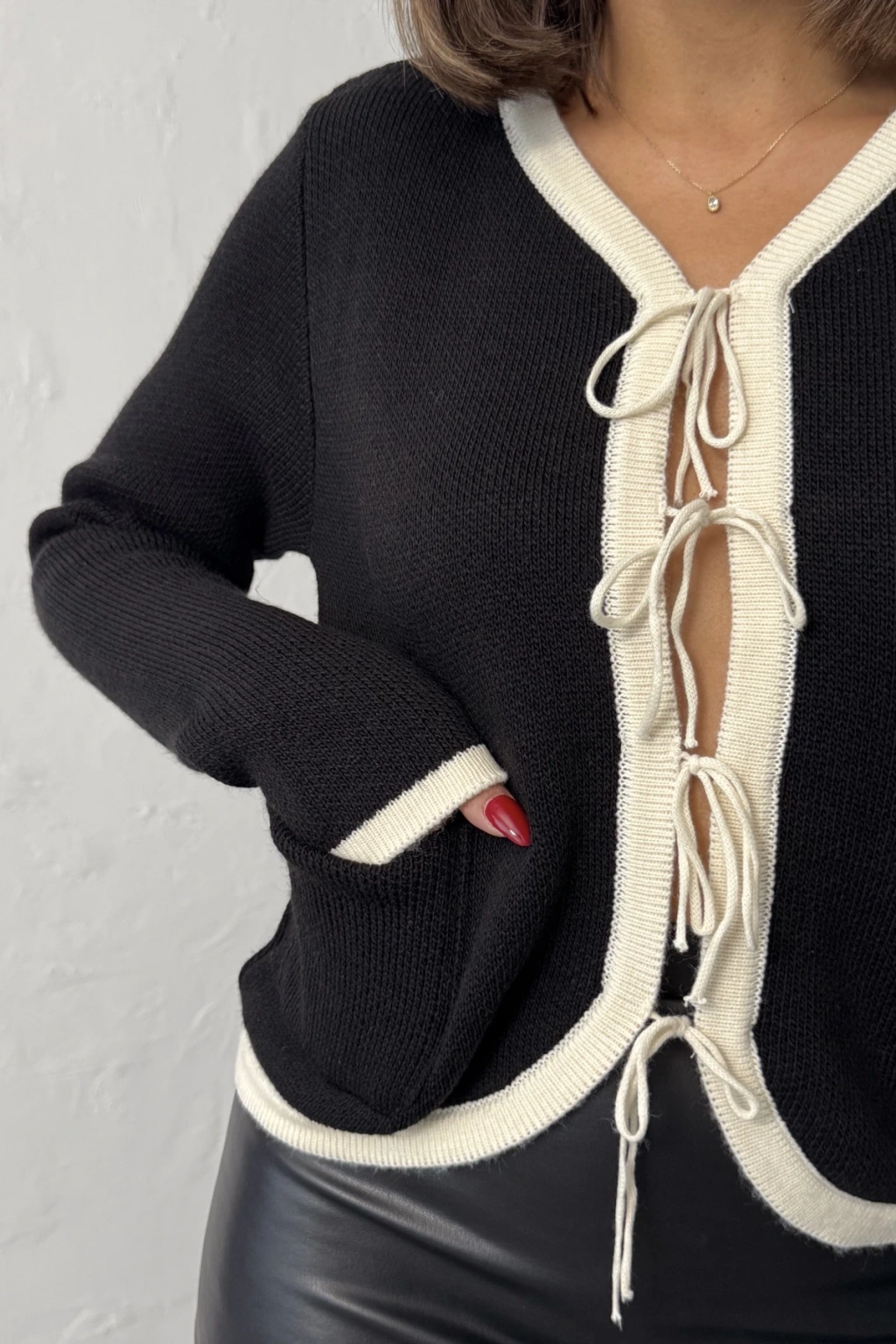 Kadın Siyah Bağcıklı Şık Cep Deyaylı Zarif Triko Hırka