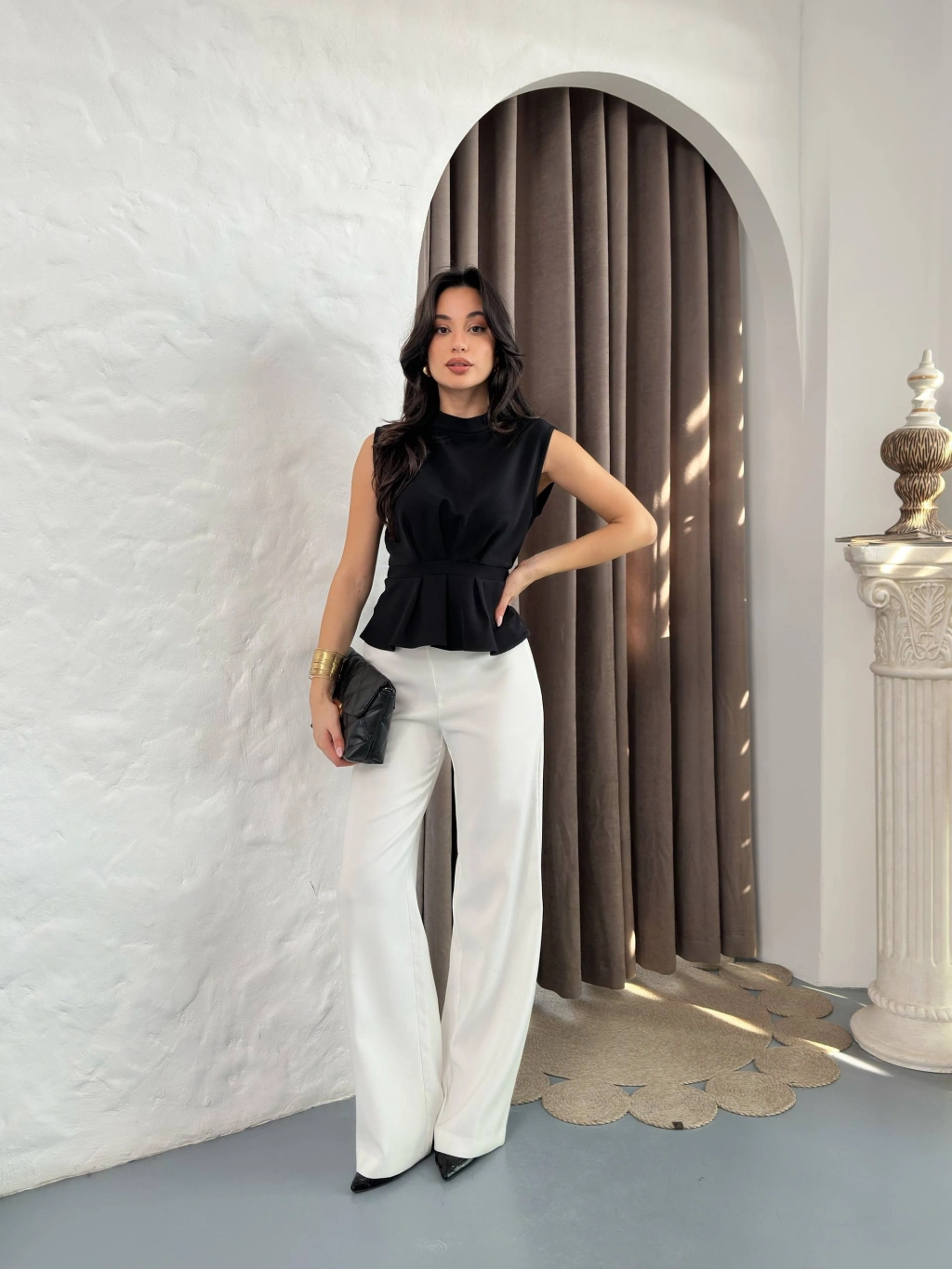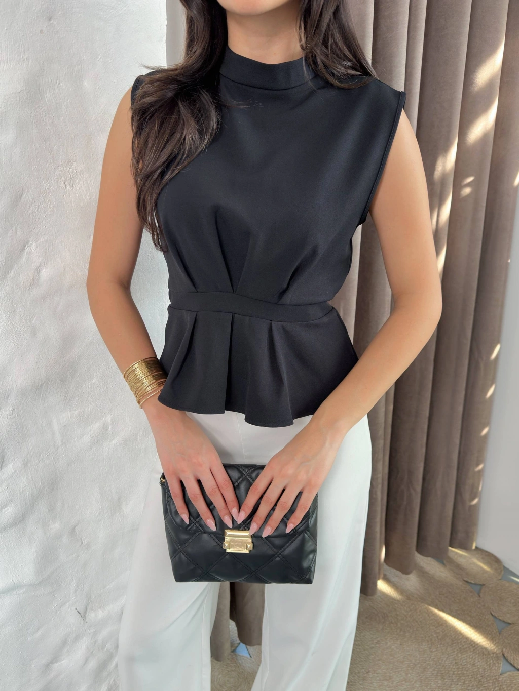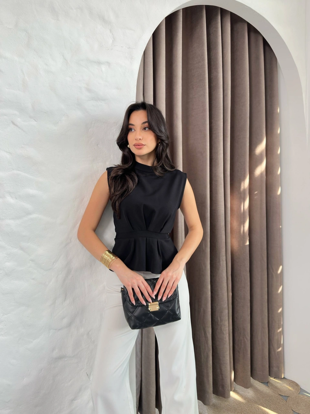 Kadın Siyah Bisiklet Yaka Kolsuz Dokuma Bluz