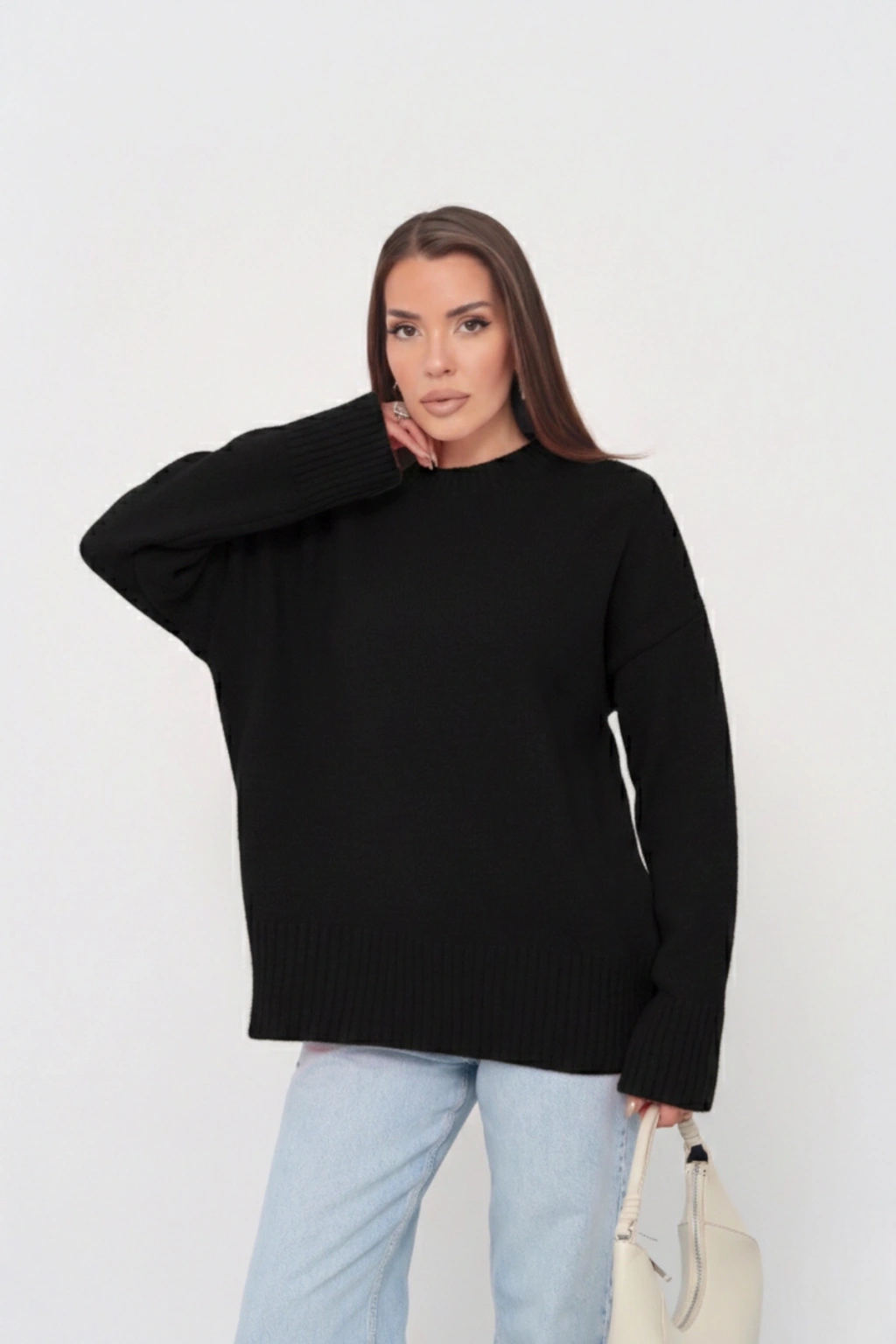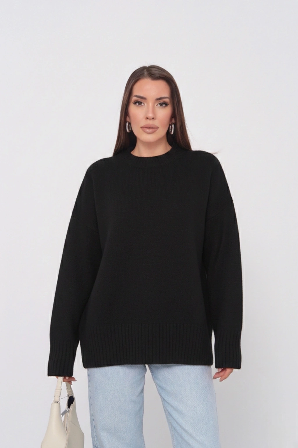 Kadın Oversize Ekru Bisiklet Yaka Pamuksu Dokulu Uzun Kol Triko Kazak