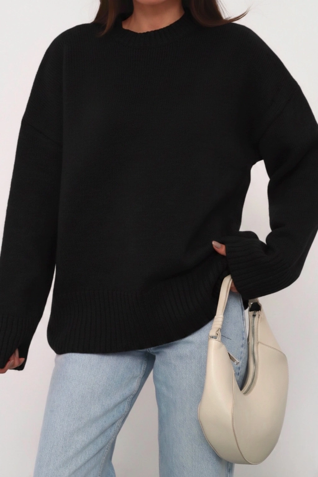 Kadın Oversize Antrasit Bisiklet Yaka Pamuksu Dokulu Triko Kazak