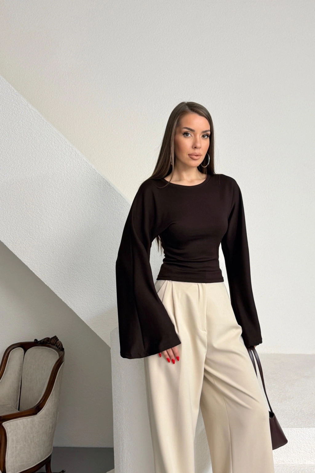 Kadın Kahverengi V Yaka Dantel Detaylı Madonna Yaka Uzun Kollu Transparan Tül Bluz