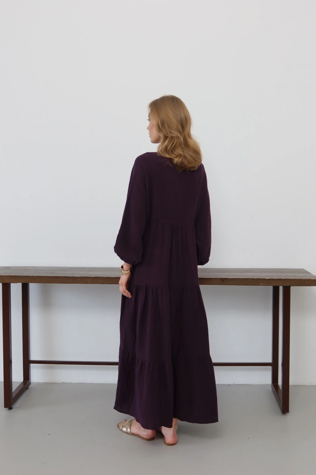Kadın Kahverengi Bohem Tarz Müslin Kumaş Rahat Kalıp Astarlı Uzun Şık Bayramlık Elbise