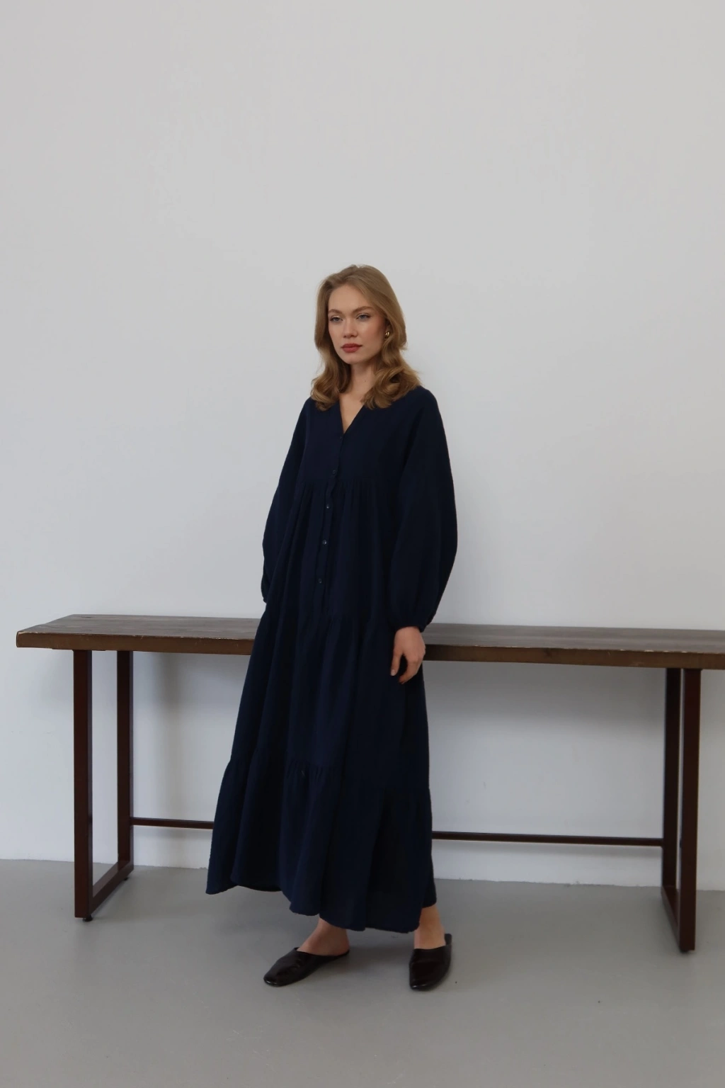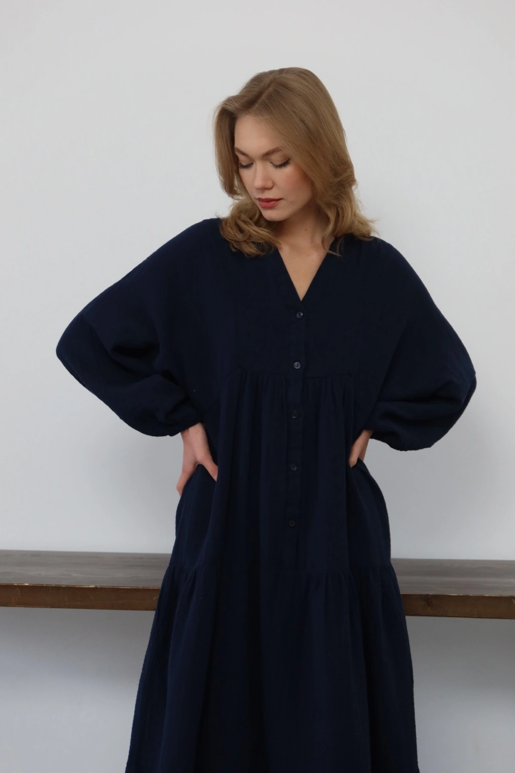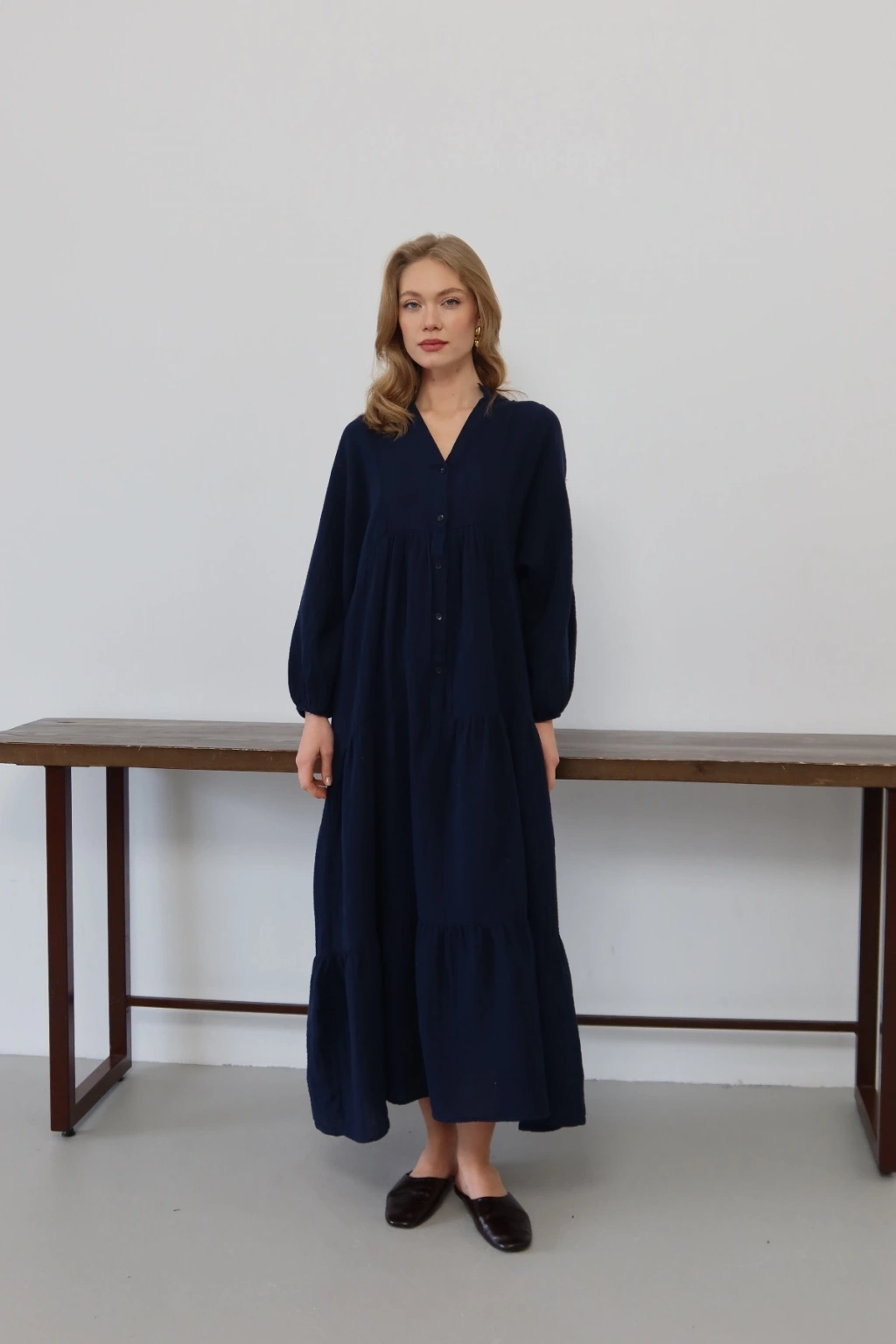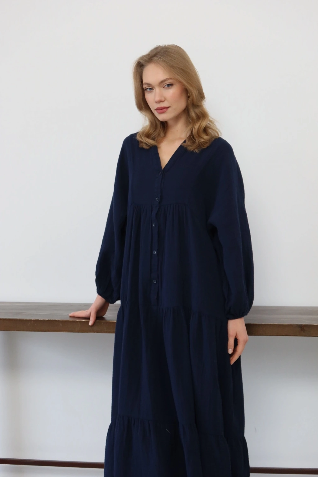 Kadın Lacivert Bohem Tarz Müslin Kumaş Rahat Kalıp Astarlı Uzun Şık Bayramlık Elbise