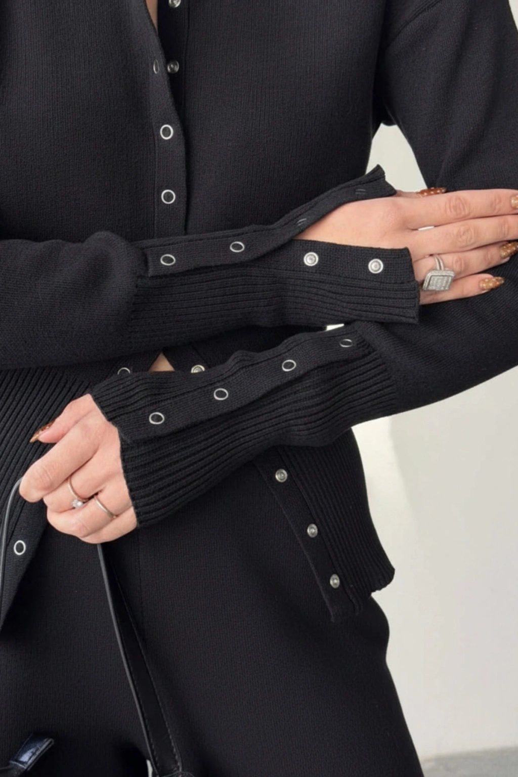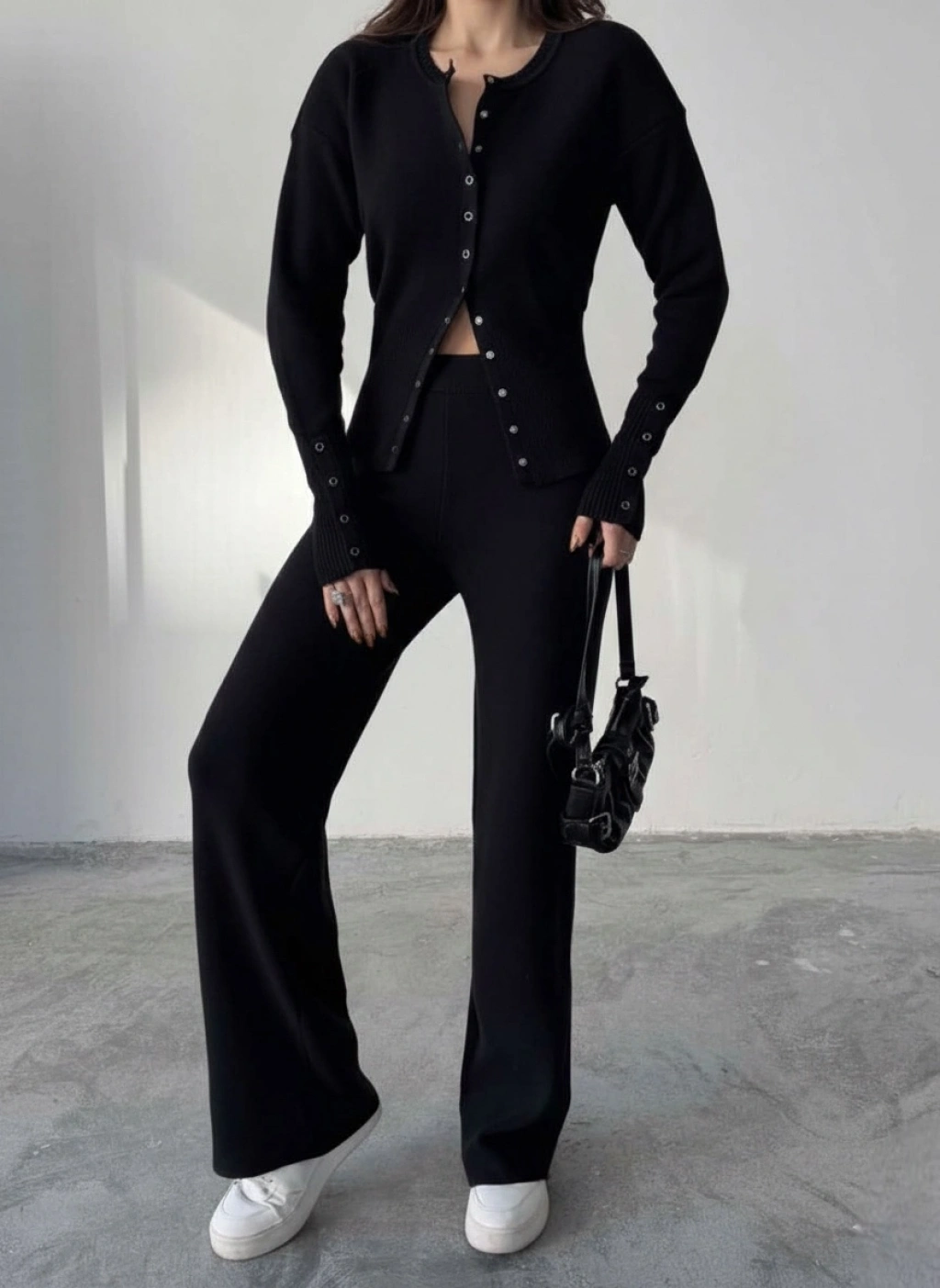 Kadın Siyah Cıtcıt Detaylı Hırka Pantolon Alt Üst İkili Triko Takım (S/M Beden)