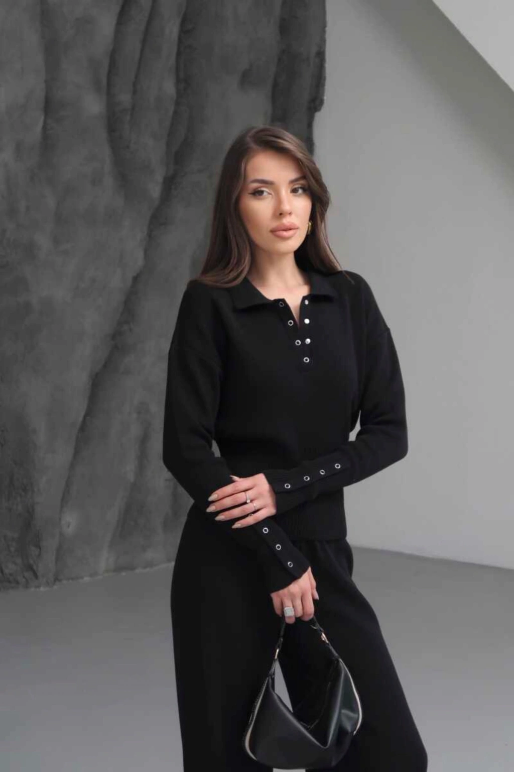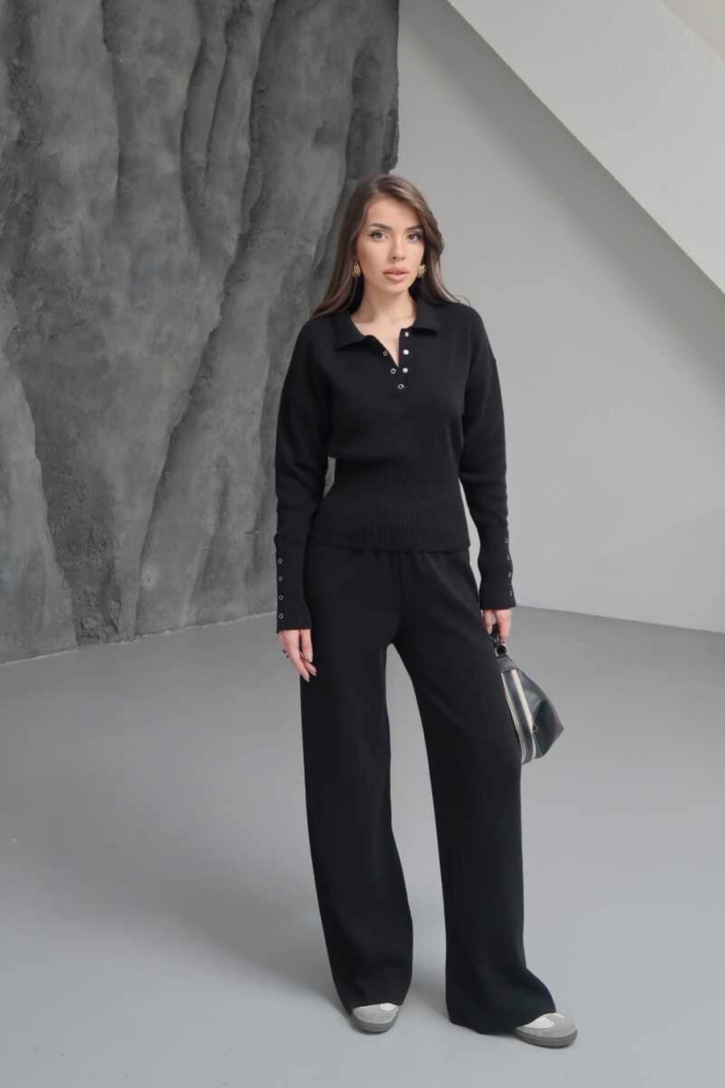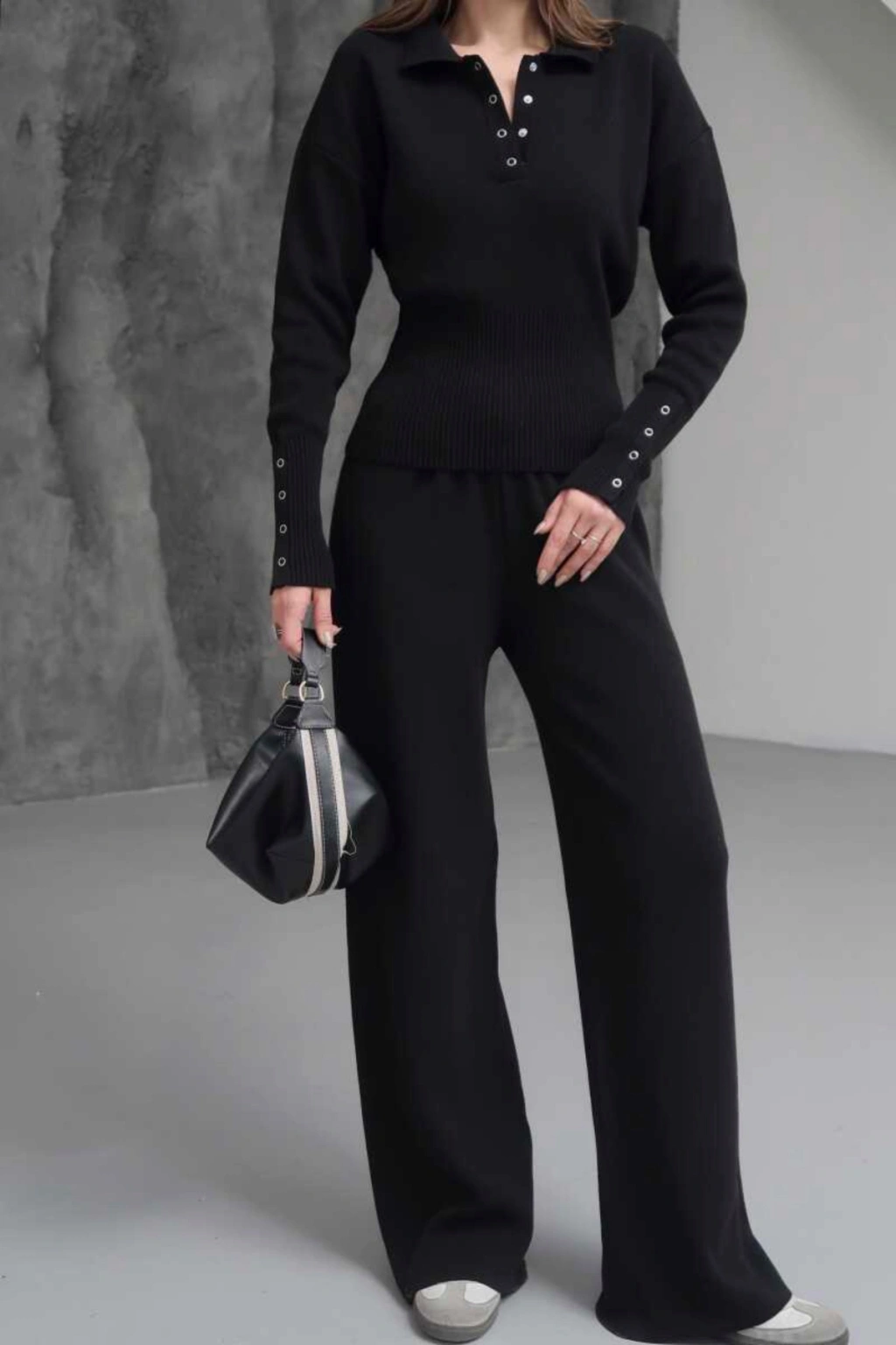 Kadın Siyah Cıtcıt Detaylı Polo Yaka Bluz Geniş Paça Pantolon Alt Üst İkili Triko Takım