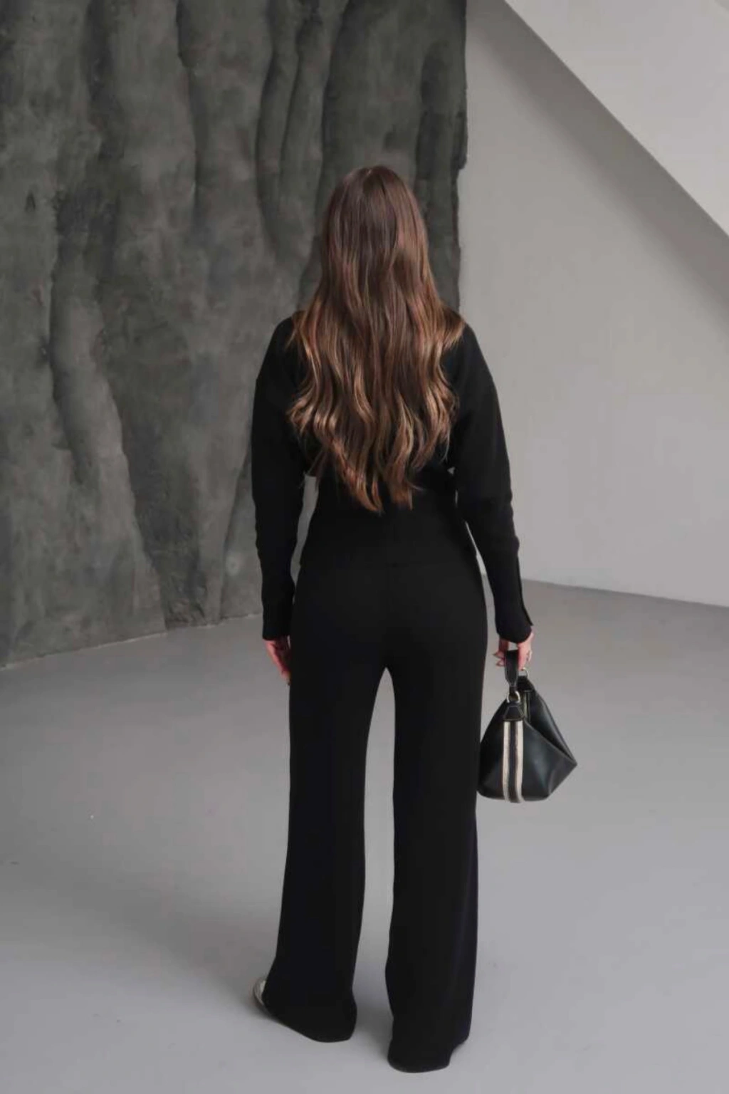 Kadın Siyah Yumuşacık Yarasa Kol Bluzlu Beli Bağcıklı Geniş Paça İkili Takım