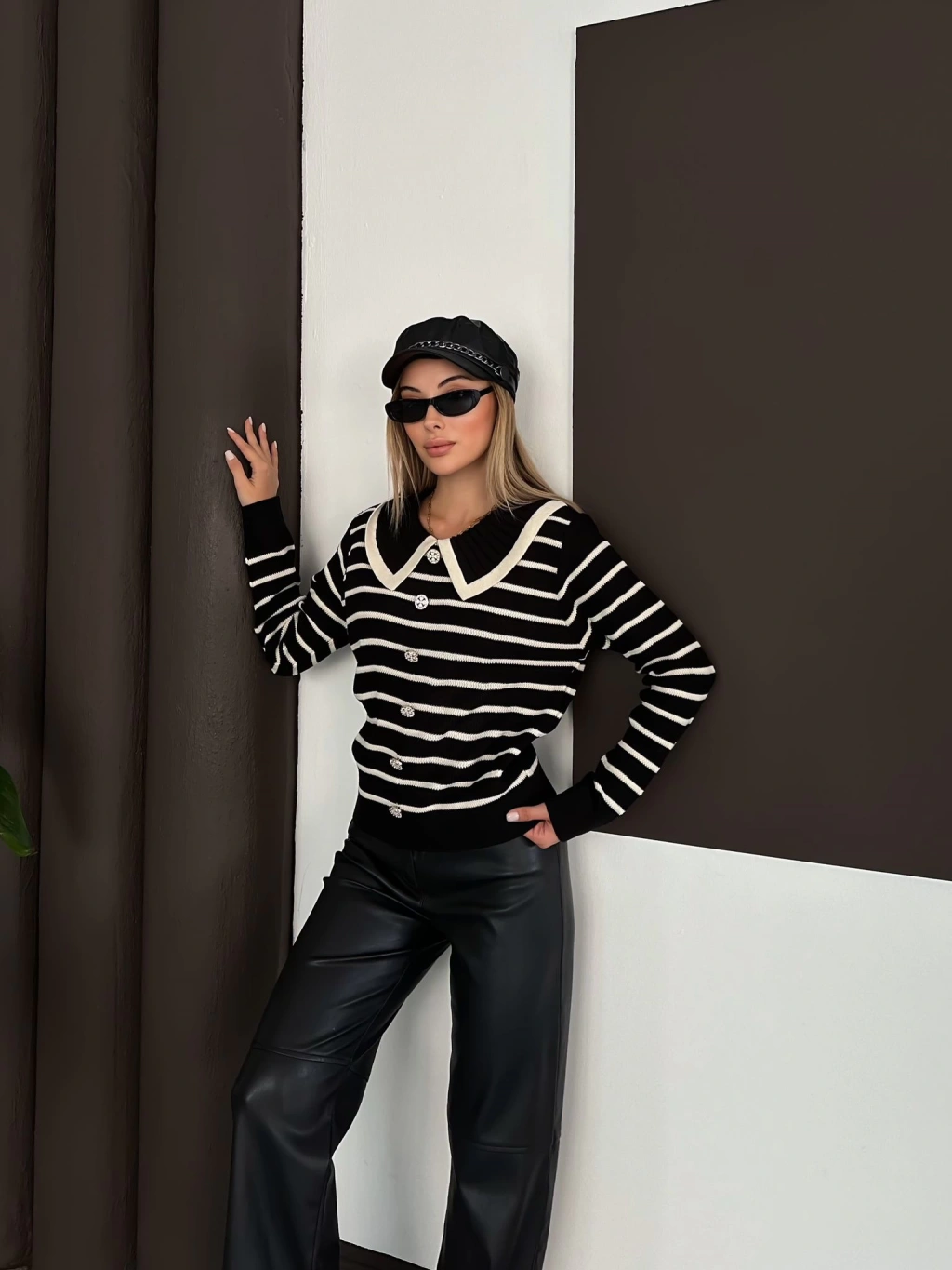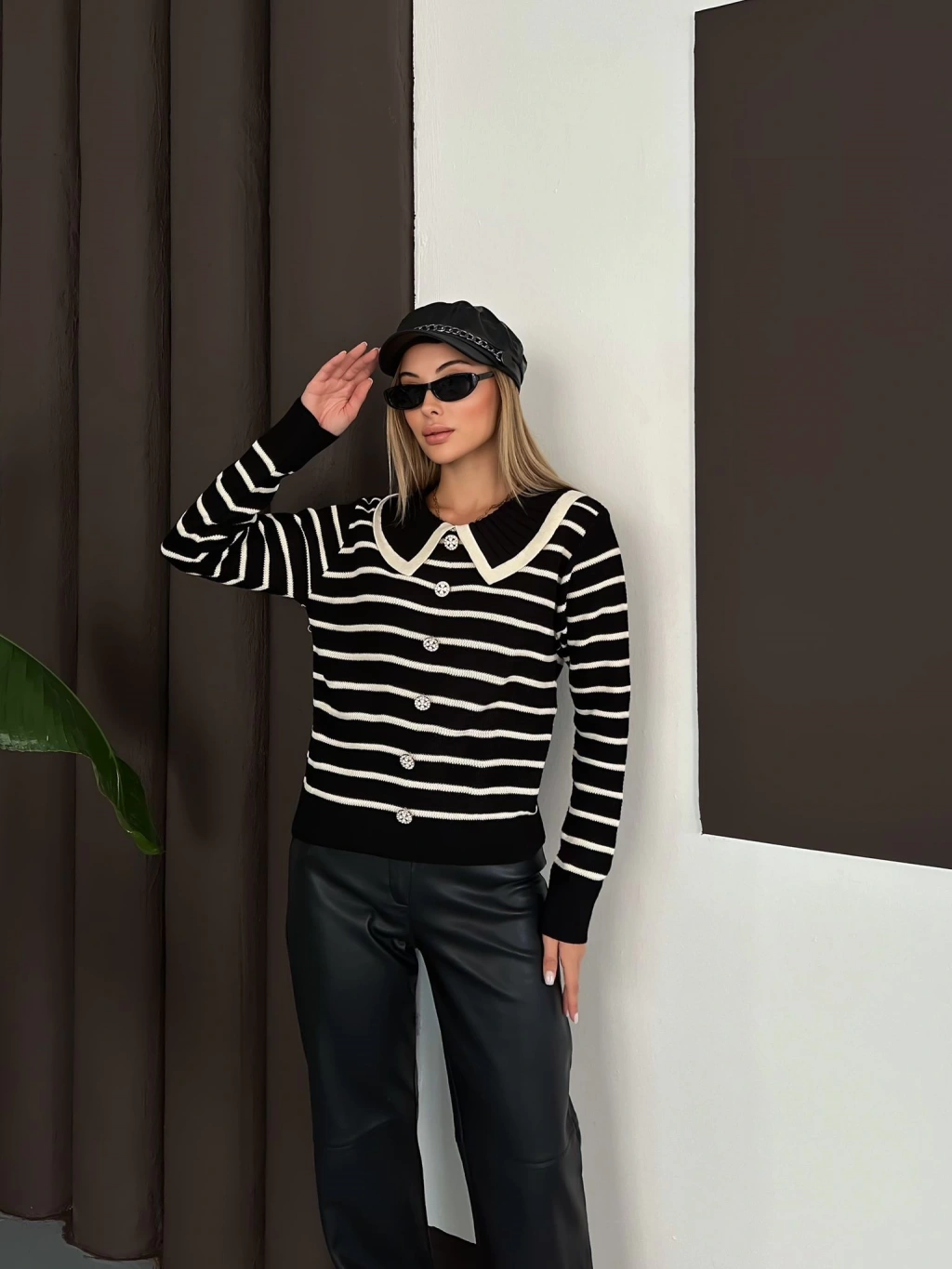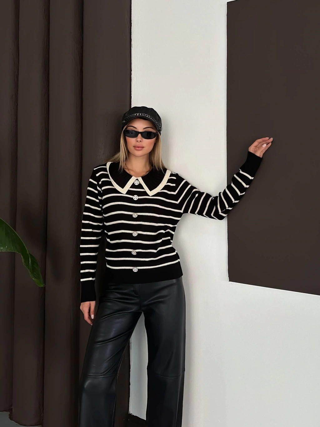 Kadın Siyah Çizgili Bebe Yaka Detaylı Triko Bluz