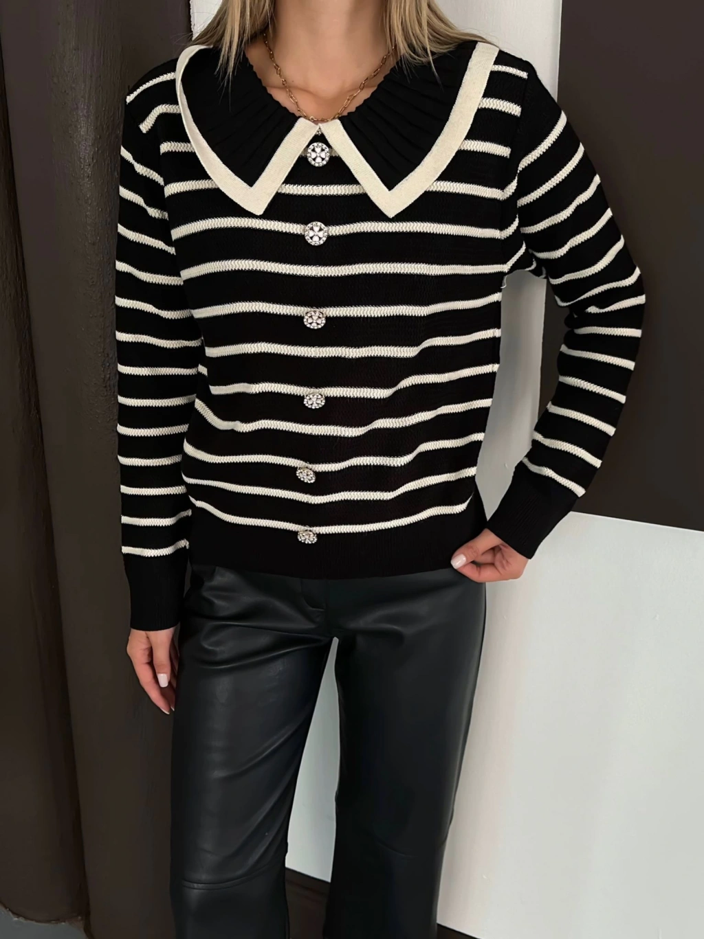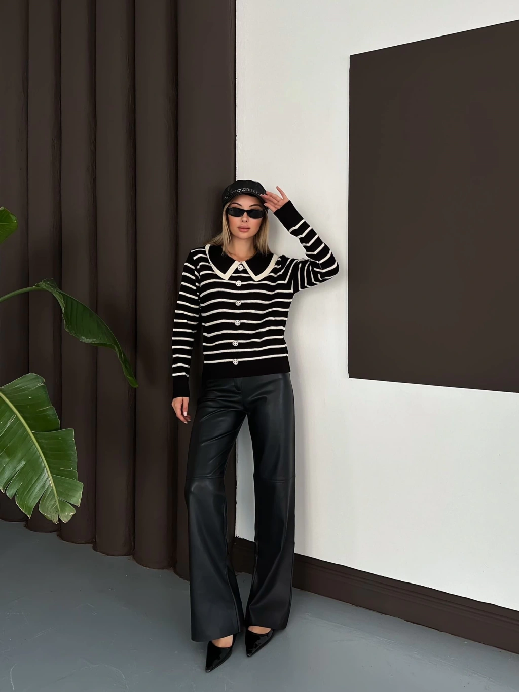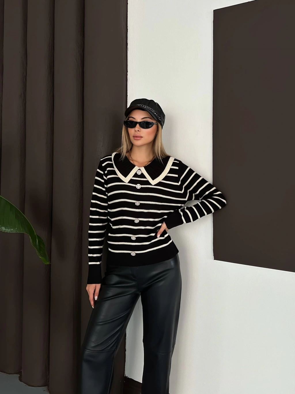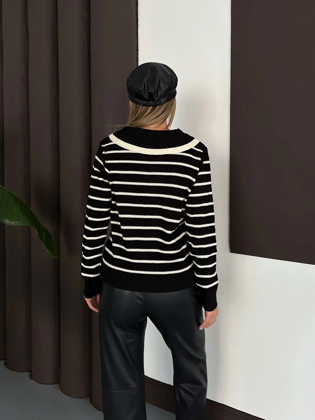 Kadın Siyah Çizgili Bebe Yaka Detaylı Triko Bluz