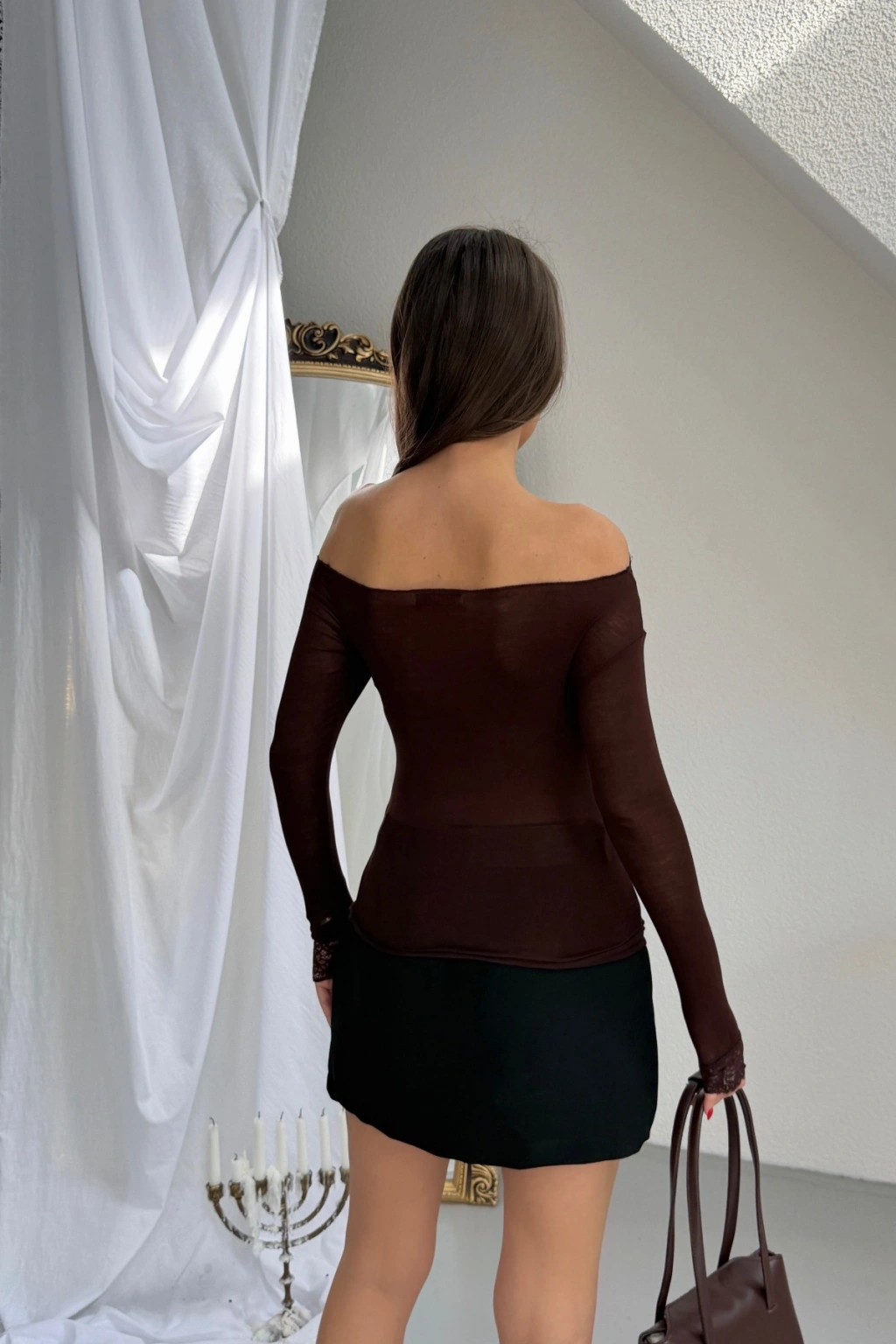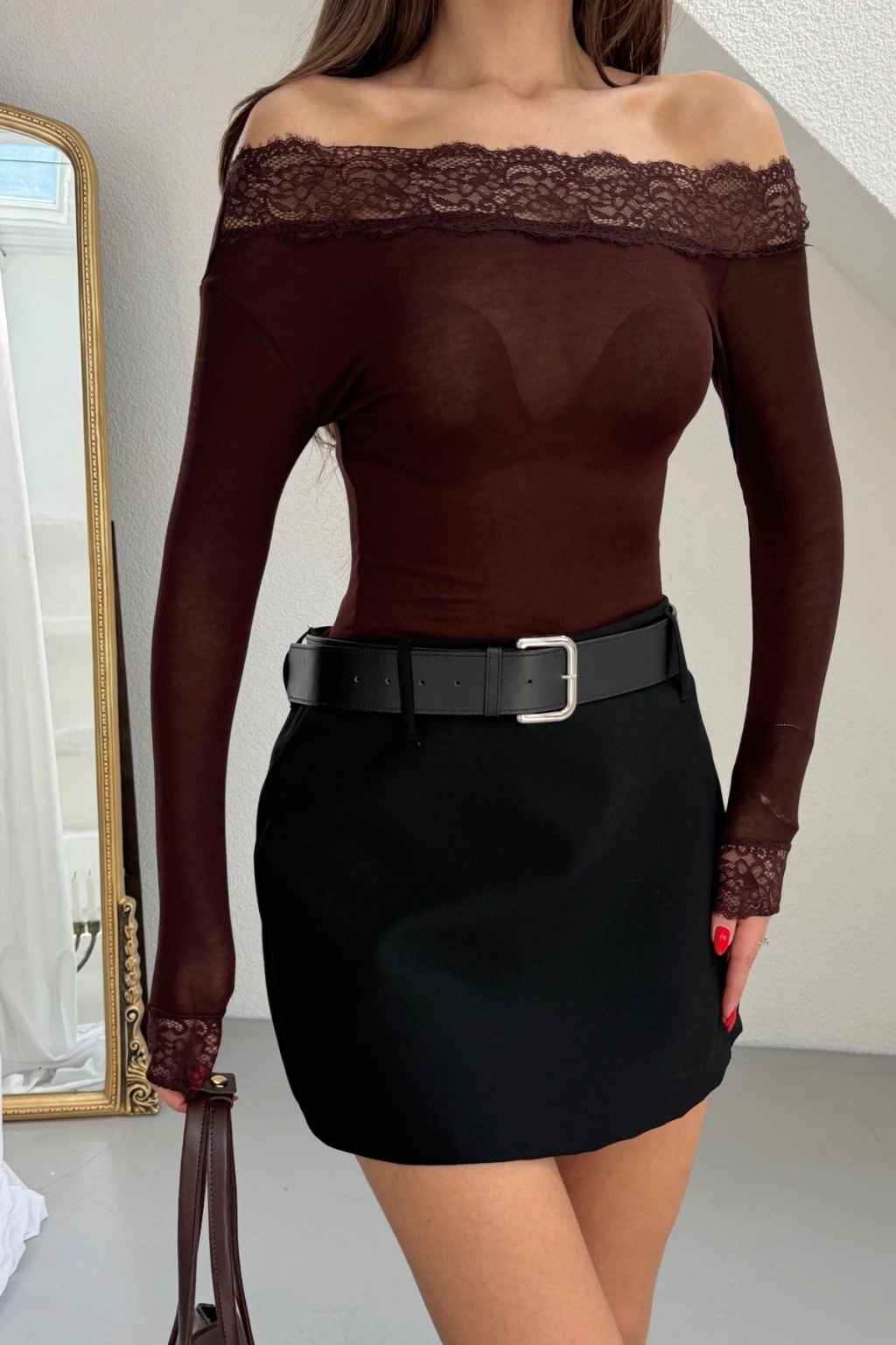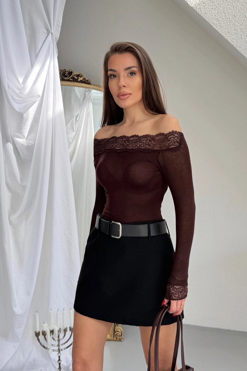 Kadın Kahverengi Dantel Detaylı Madonna Yaka Uzun Kollu Transparan Tül Bluz