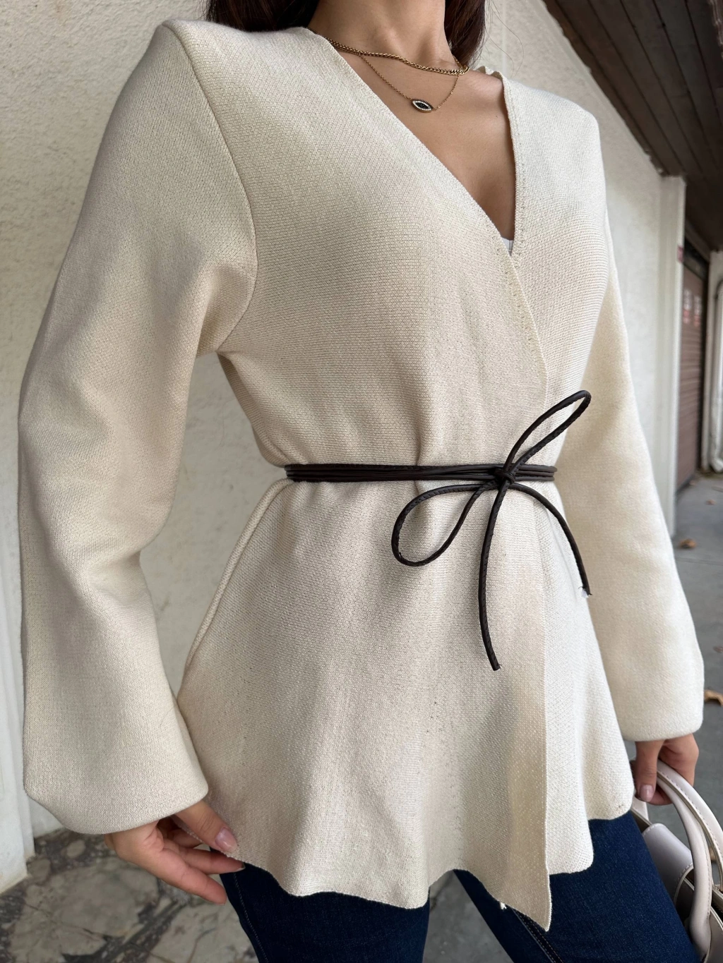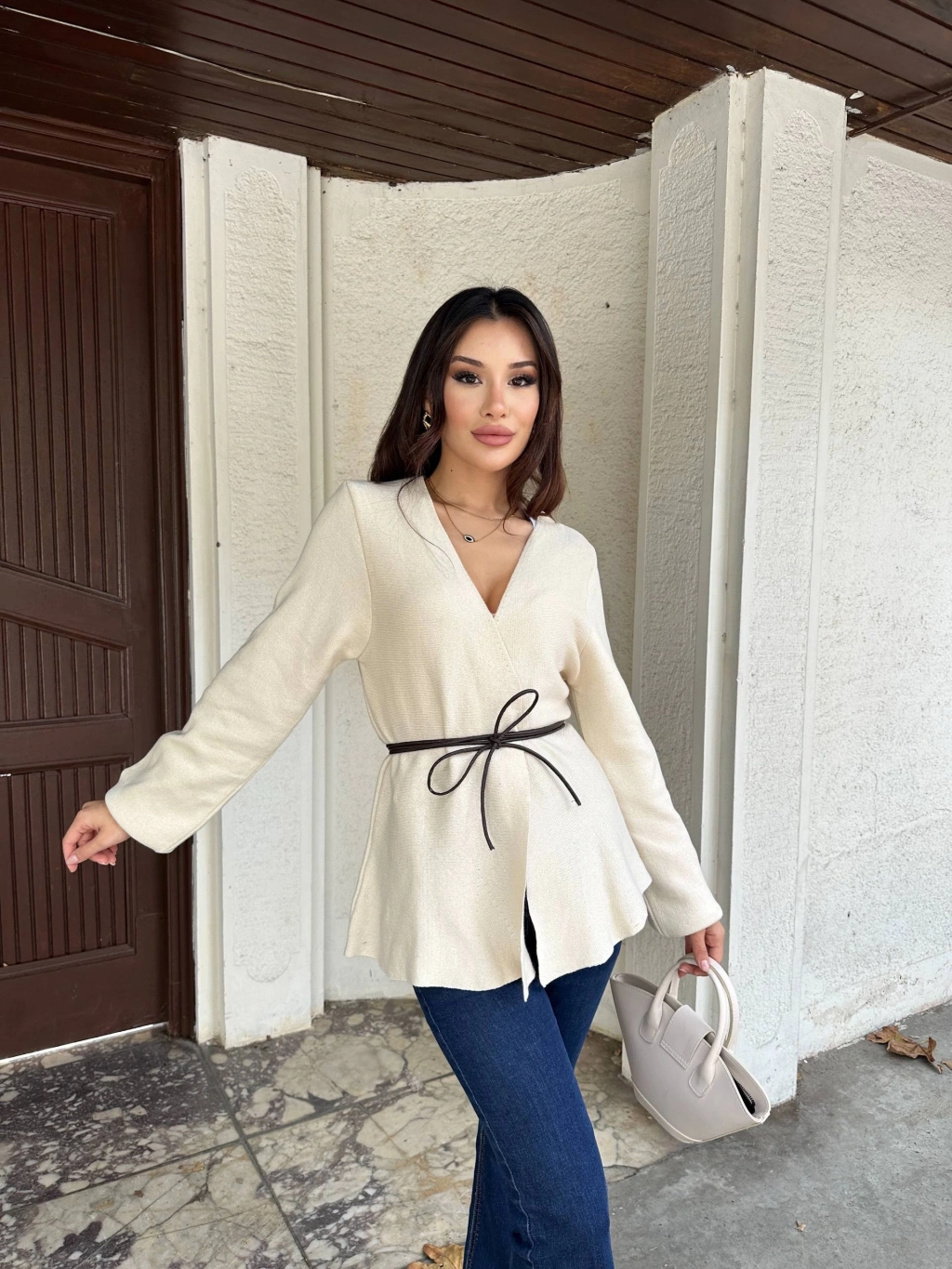 Kadın Krem Deri ip bağlama detaylı Triko Hırka