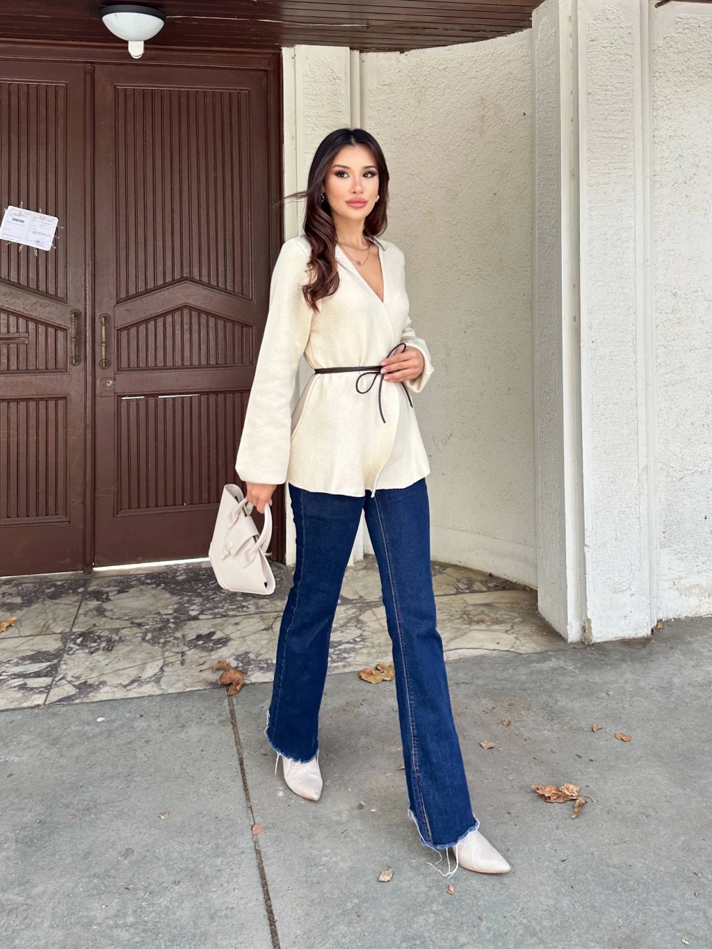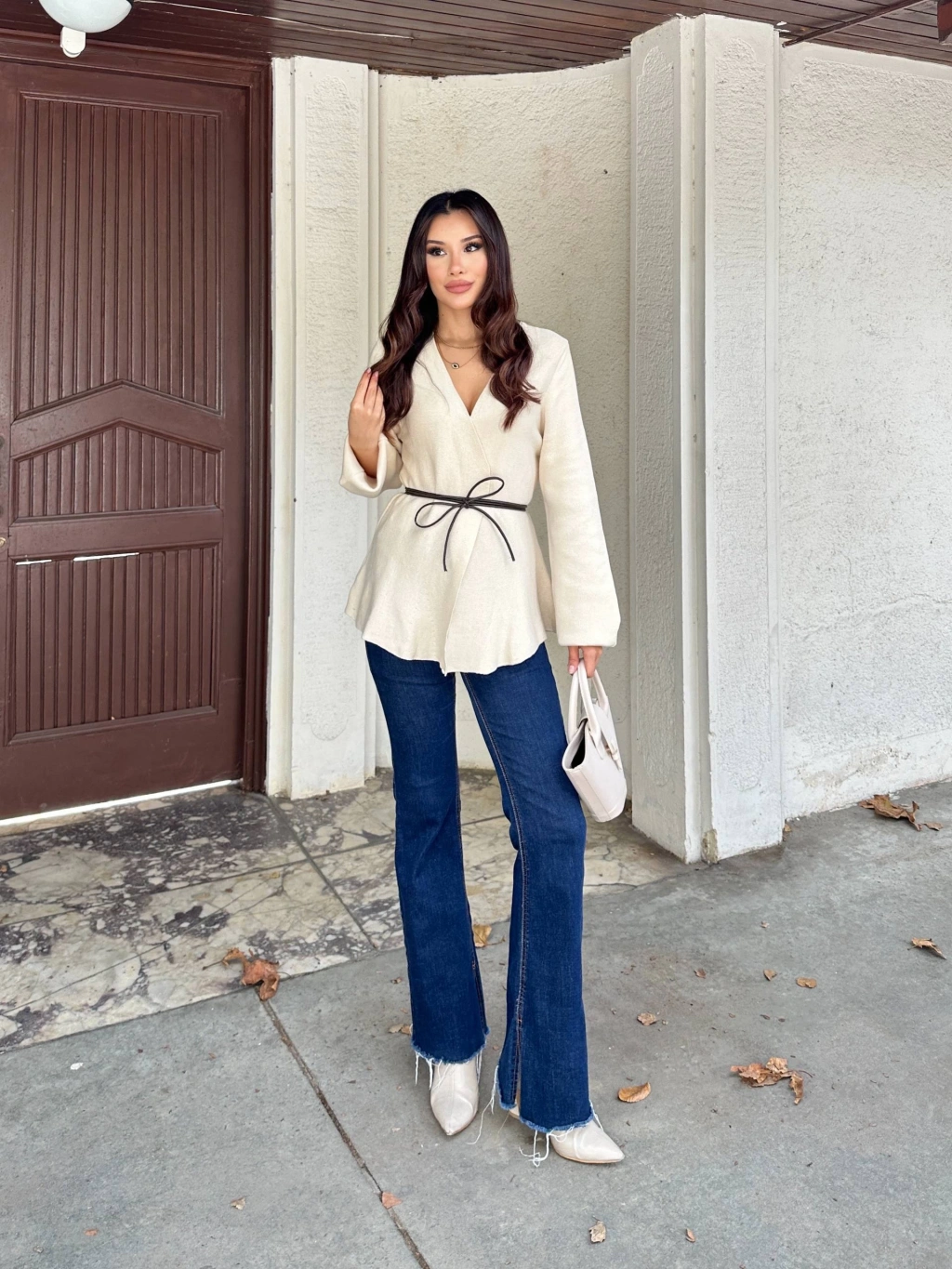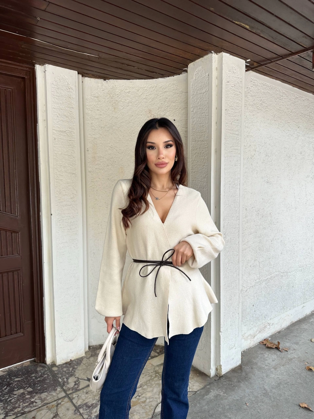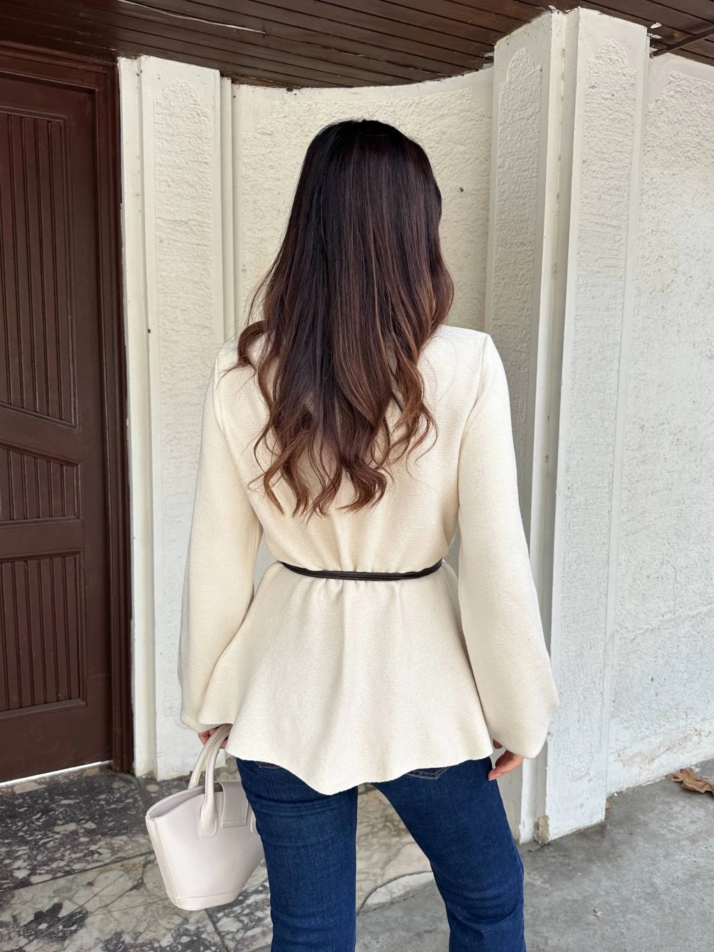 Kadın Ekru Bağcıklı Şık Cep Deyaylı Zarif Triko Hırka