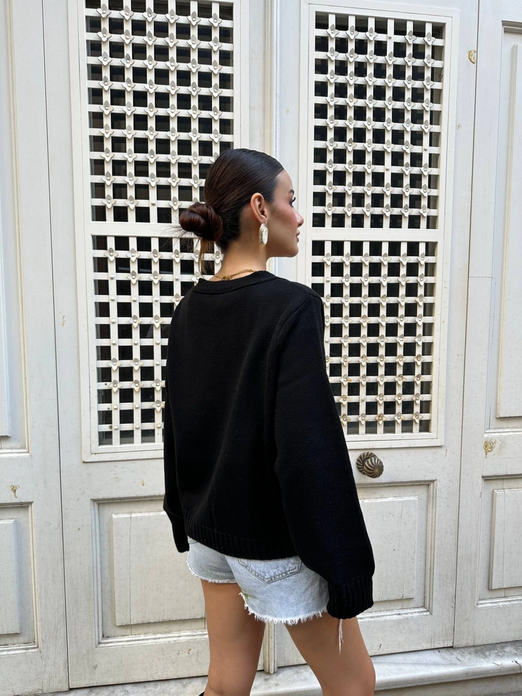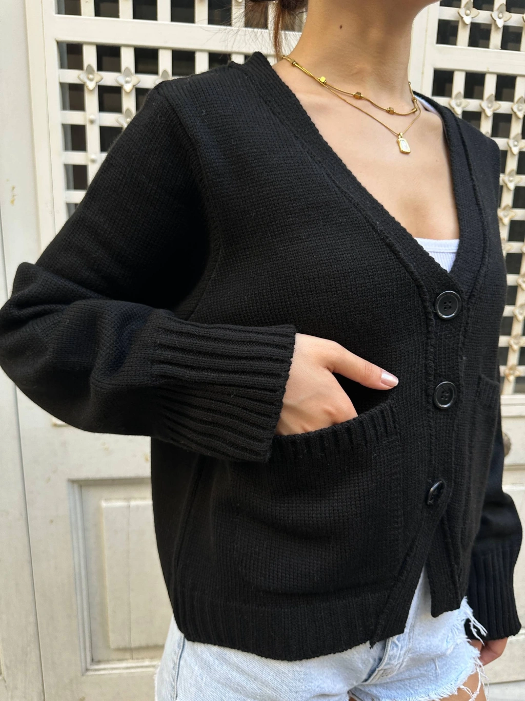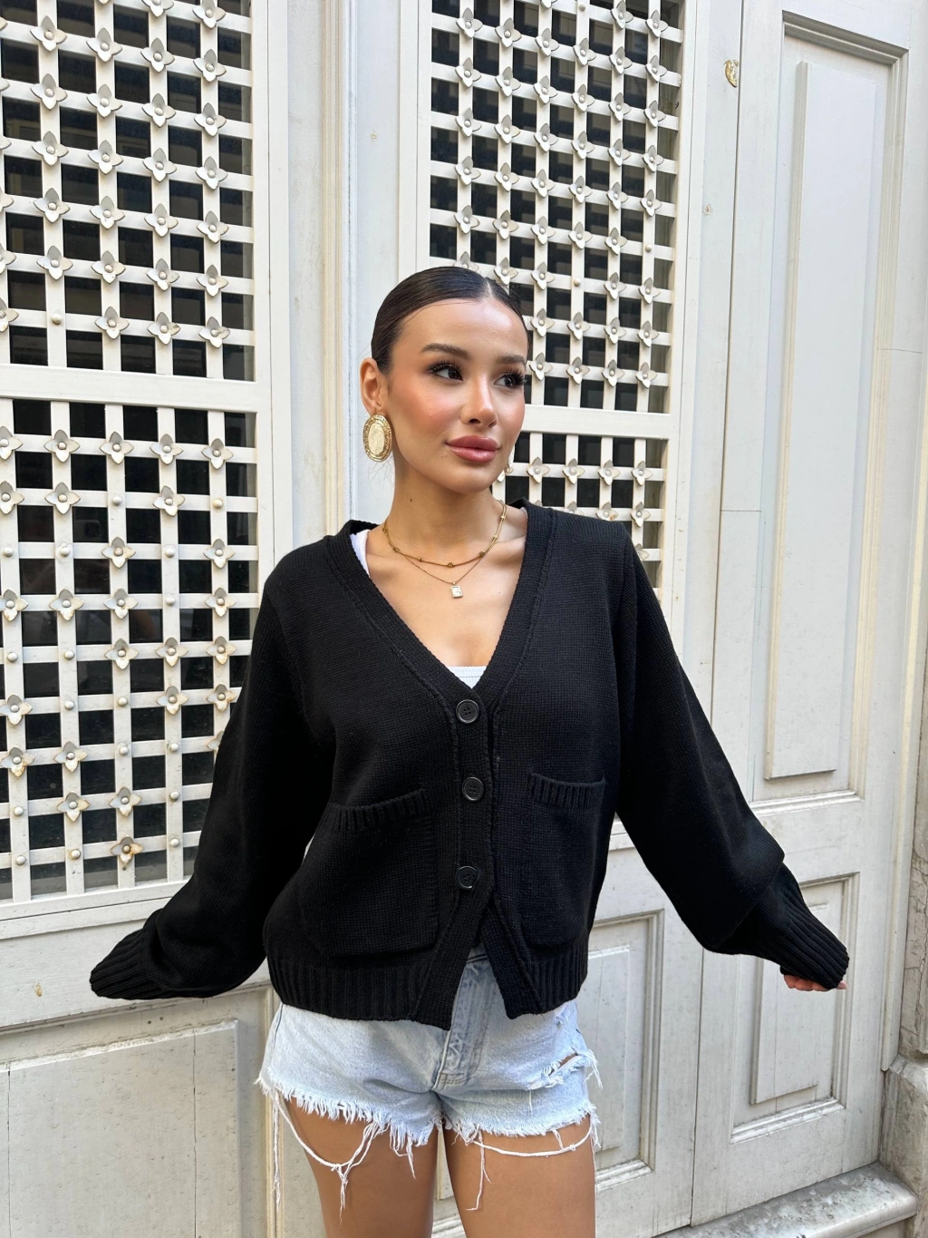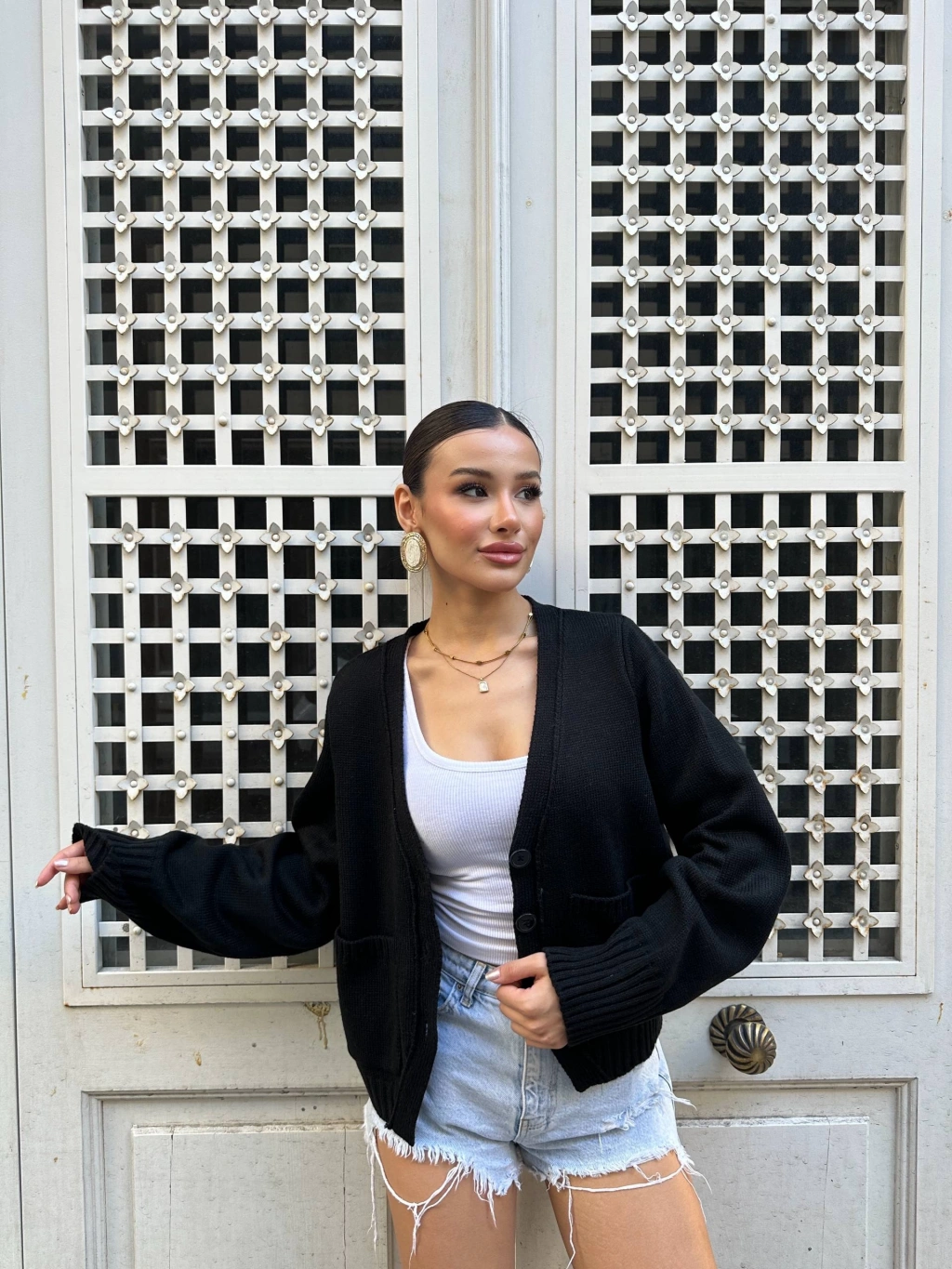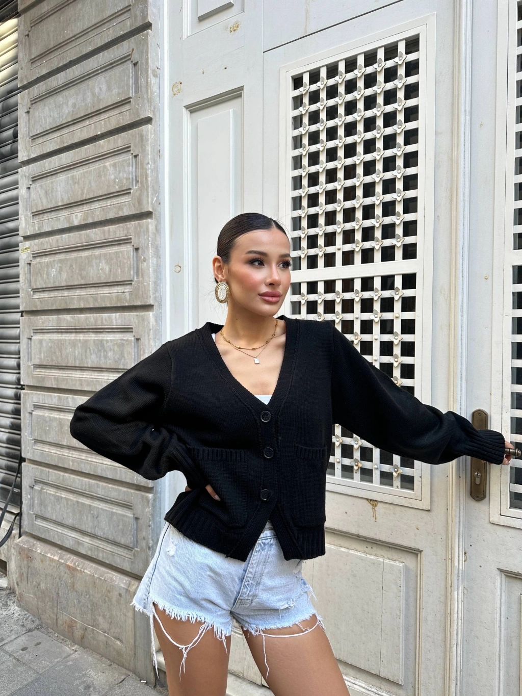 Kadın Siyah Düğmeli Cepli Premium Örgü Triko Hırka