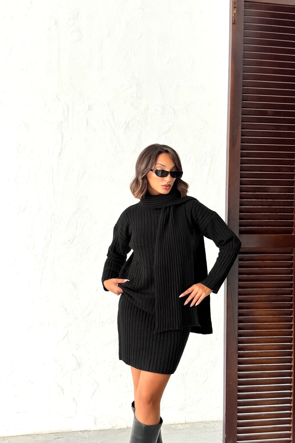 Detay: Rahat kesim kazak, uyumlu etek ve modern atkı