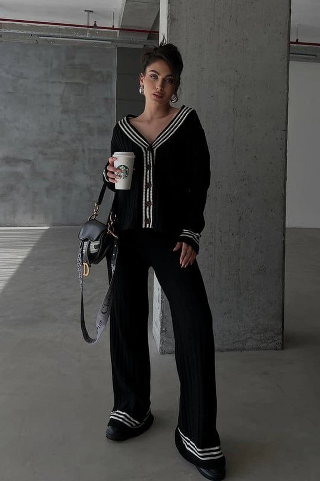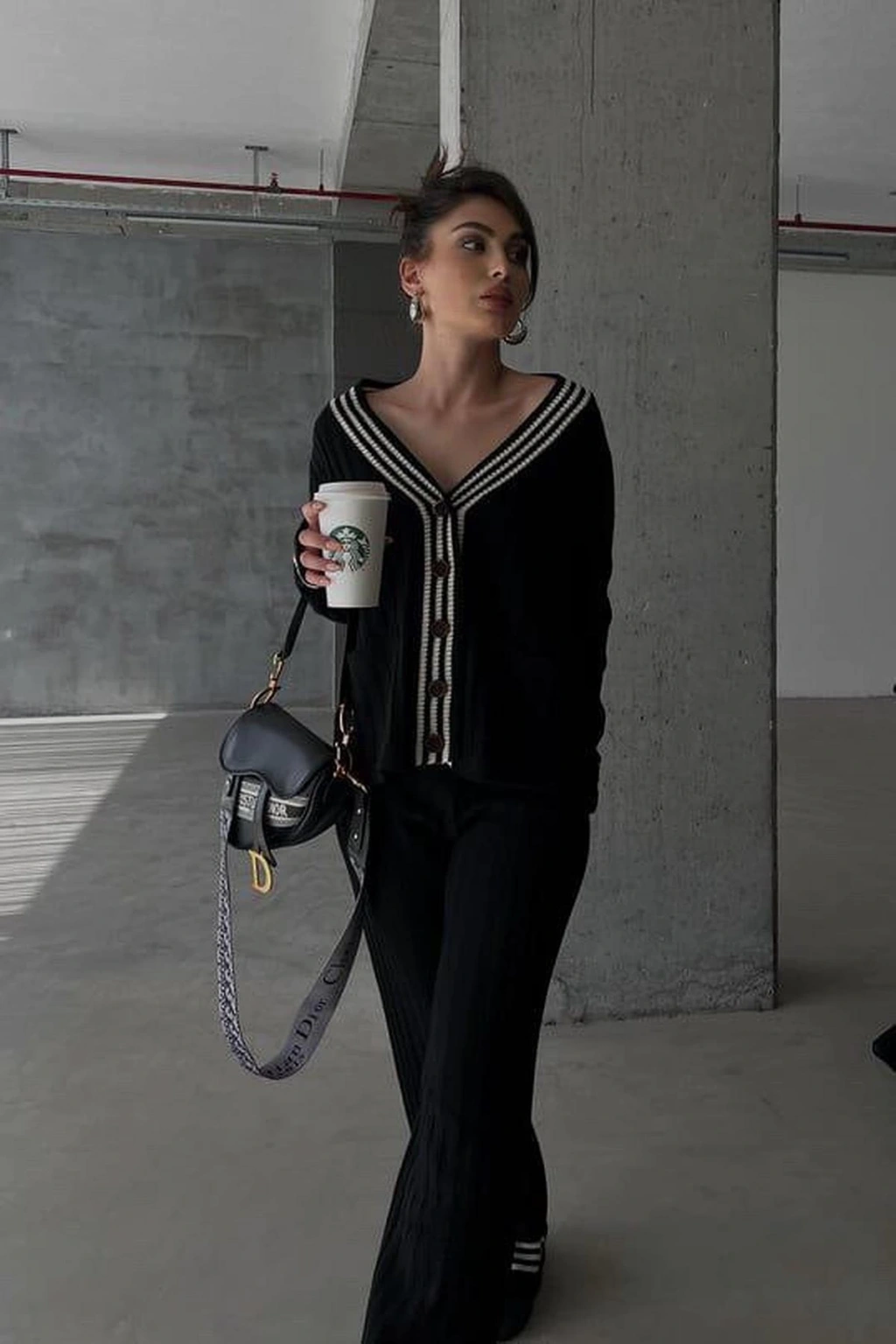 Kadın Siyah Gold Düğme Detaylı Şeritli Cepli Hırka Pantolon Alt Üst İkili Triko Takım, şıklığı ve rahatlığı bir arada sunan özel bir tasarımdır. Yumuşak triko dokusu sayesinde gün boyu konfor sağlar. Gold düğme detaylı cepli hırka ve şeritli pantolonu ile modern ve zarif bir görünüm elde edebilirsiniz. Hem günlük kullanımda hem de özel anlarda stilinizi yansıtmak için ideal bir seçimdir. Ekru rengi ile sade ve şık kombinler oluşturabilirsiniz.