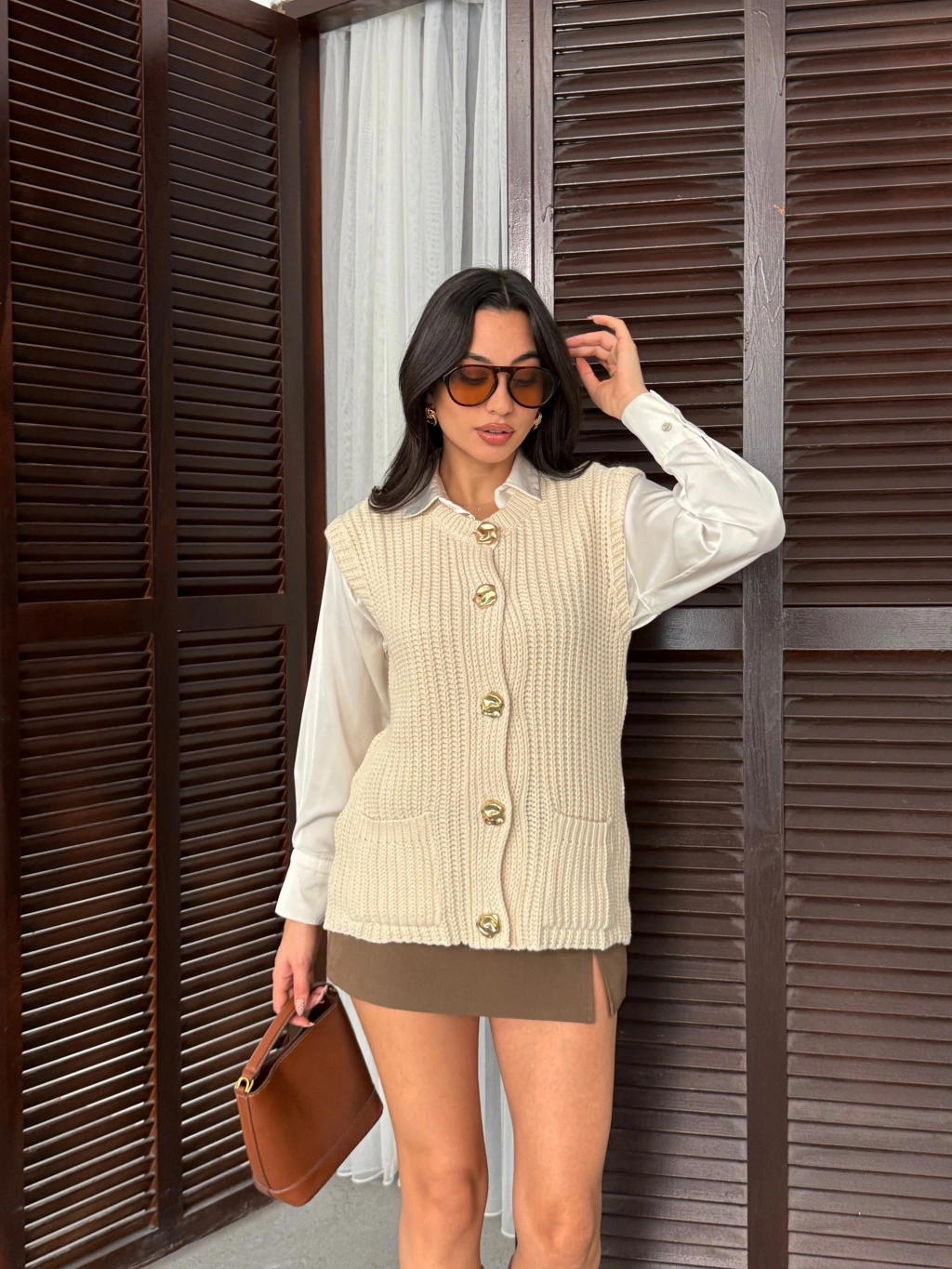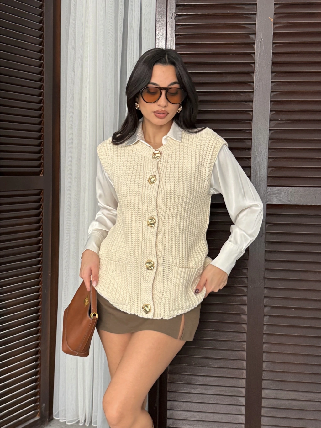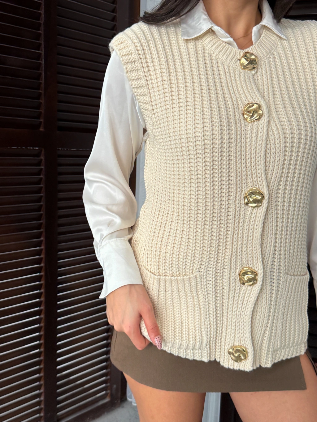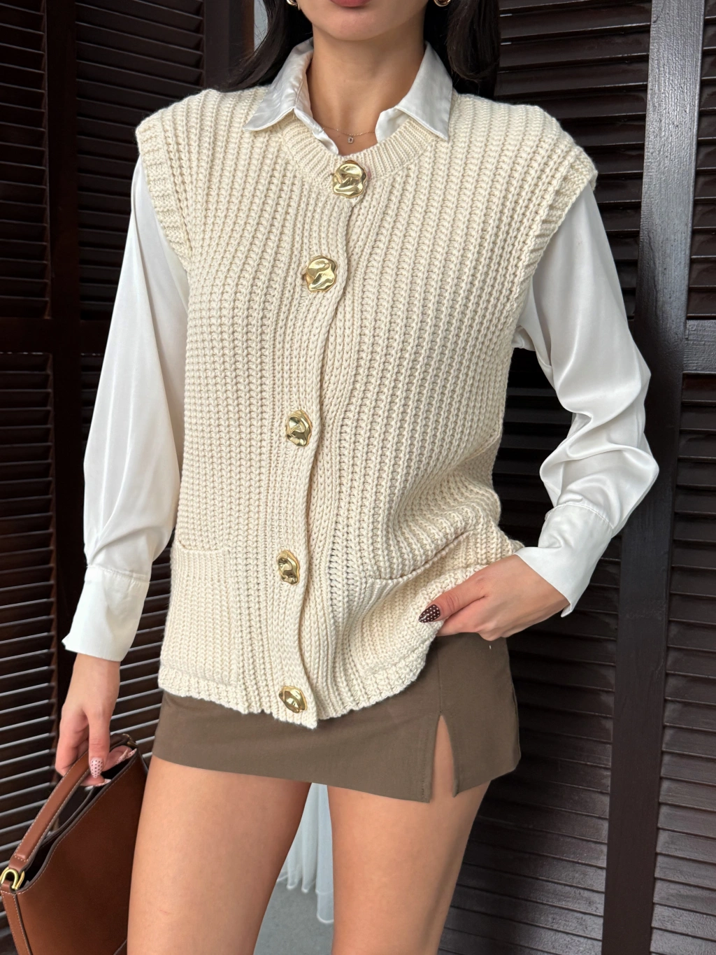 Kadın Krem Kalın Örgü Gold Düğmeli Kolsuz Triko Yelek