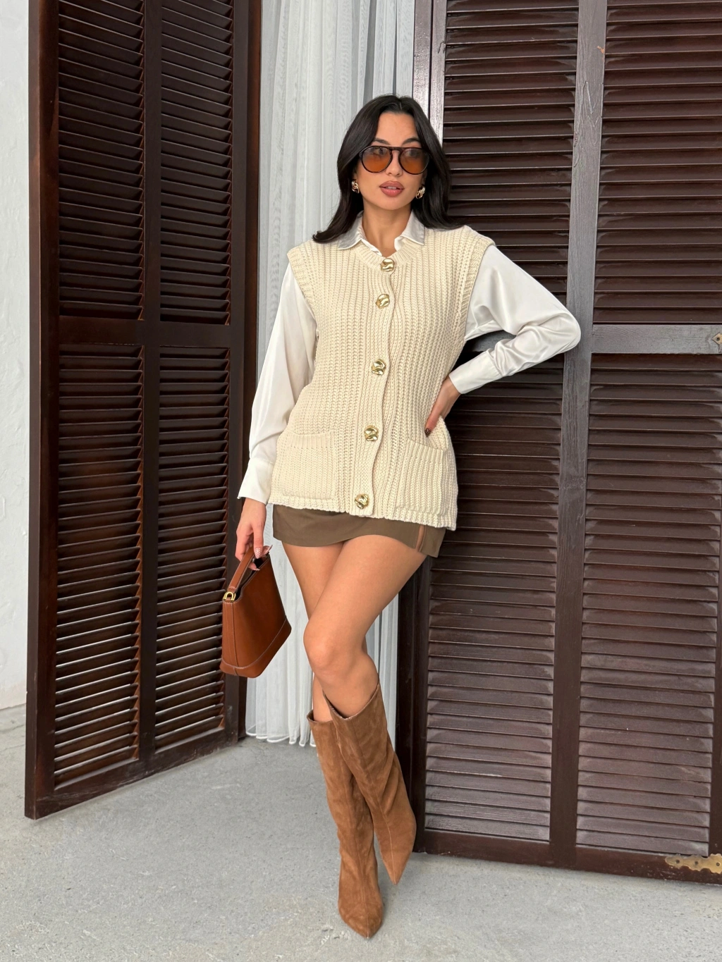 Kadın Krem Gold Düğme ve Cep Detaylı Kolsuz Triko Hırka