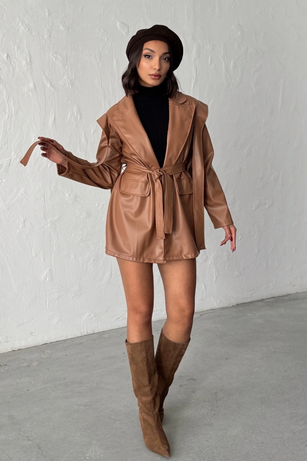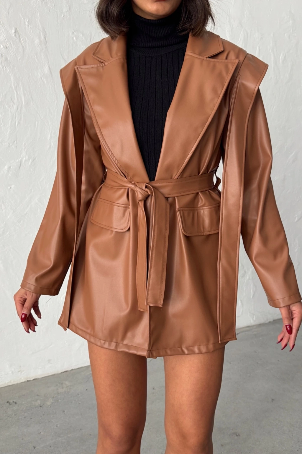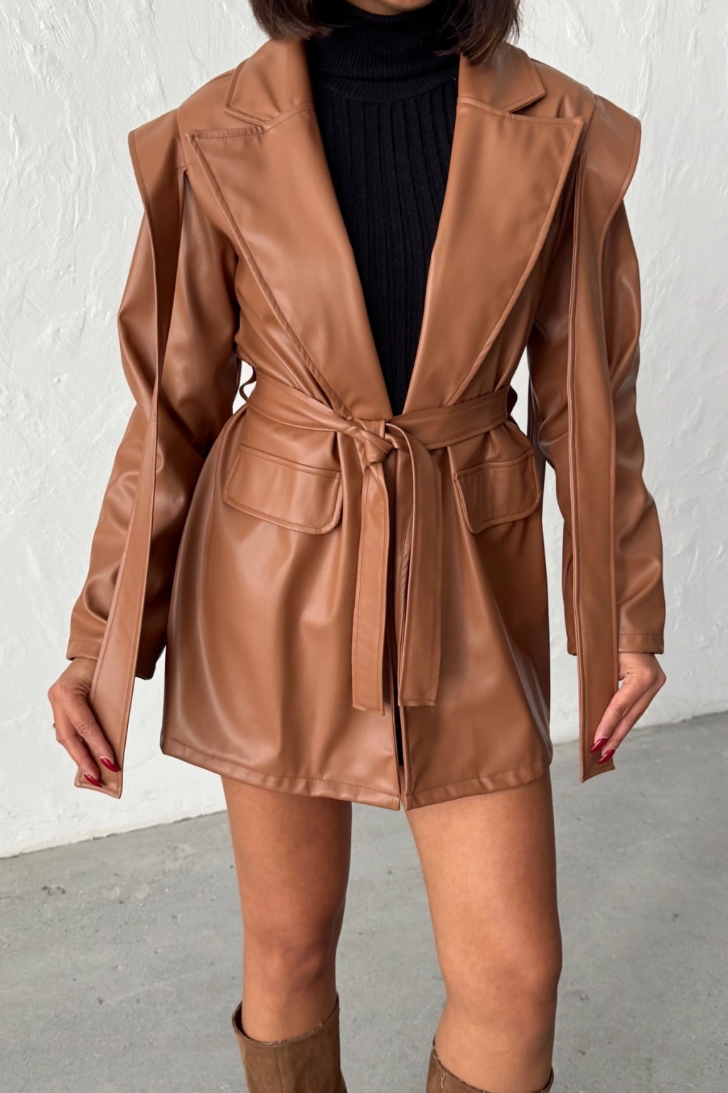 Kadın Kahverengi Kruvaze Yaka Kuşaklı Deri Ceket