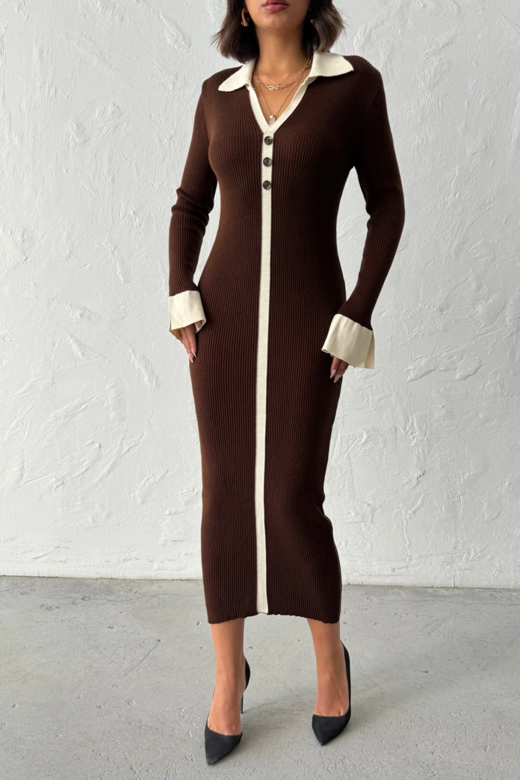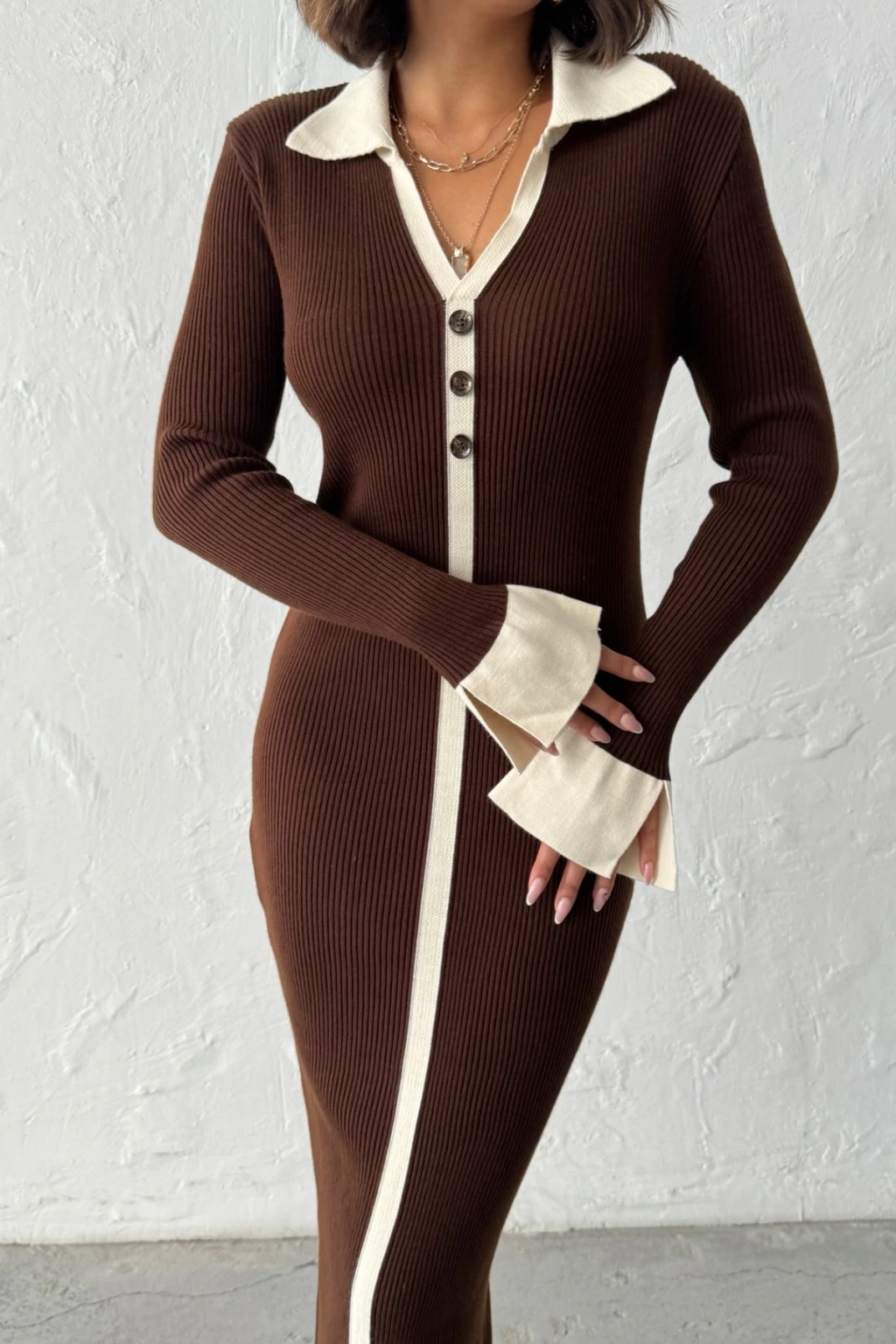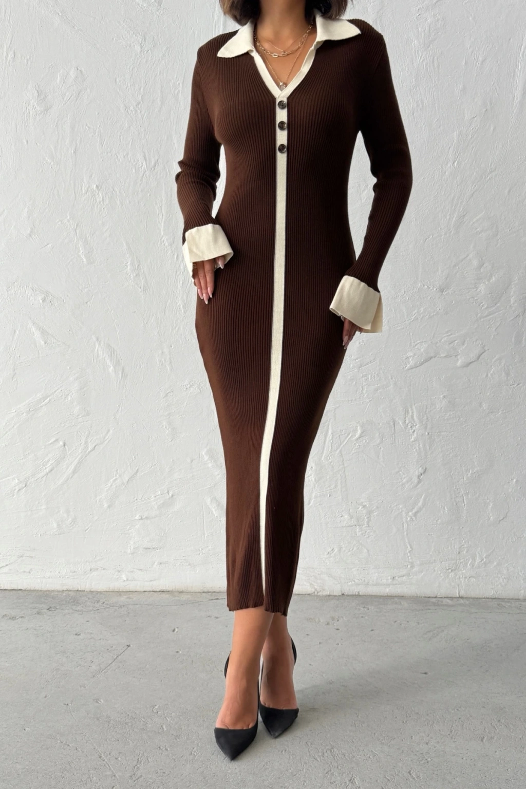 Kadın Kahverengi Polo Yaka Şık Kol Detaylı Midi Triko Elbise (Yeni Renk)