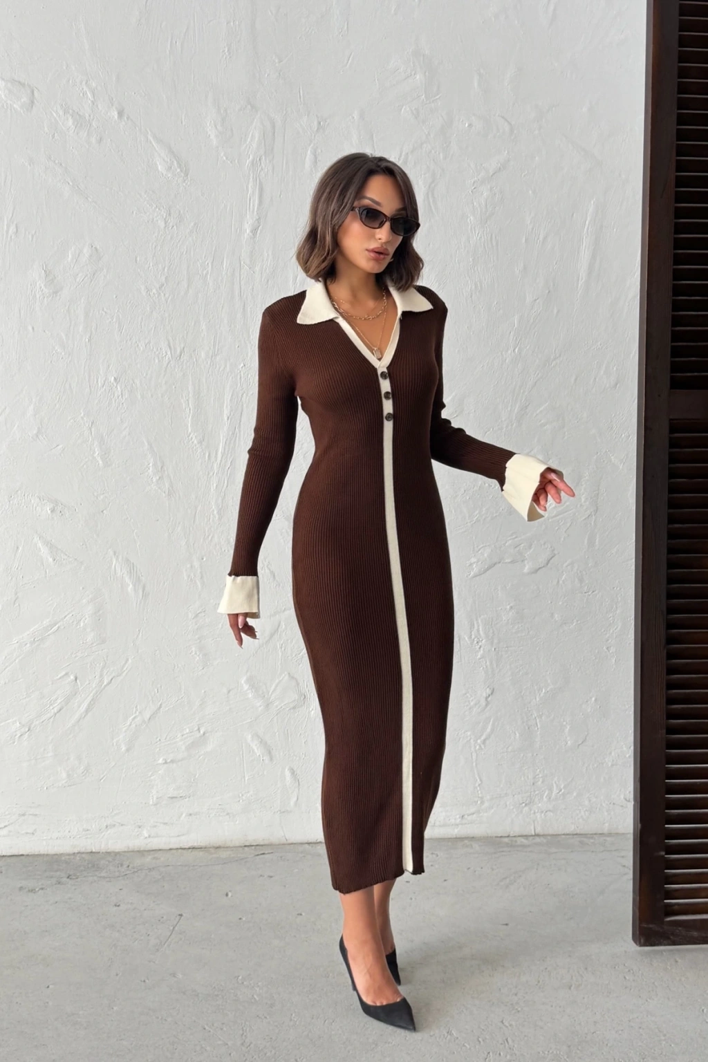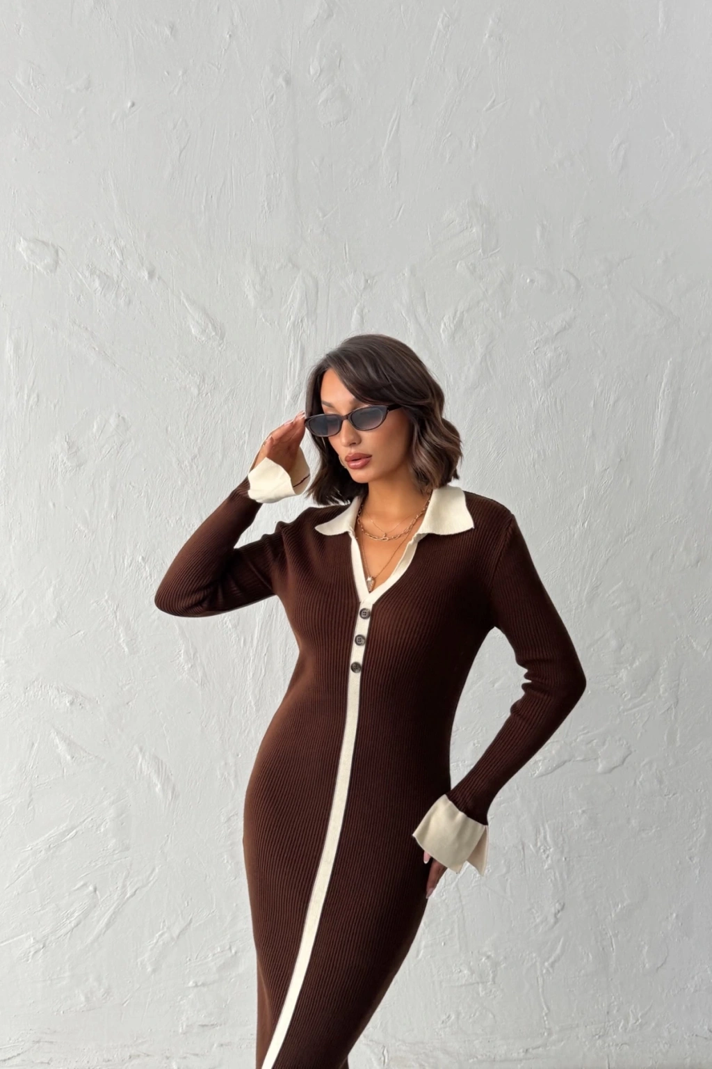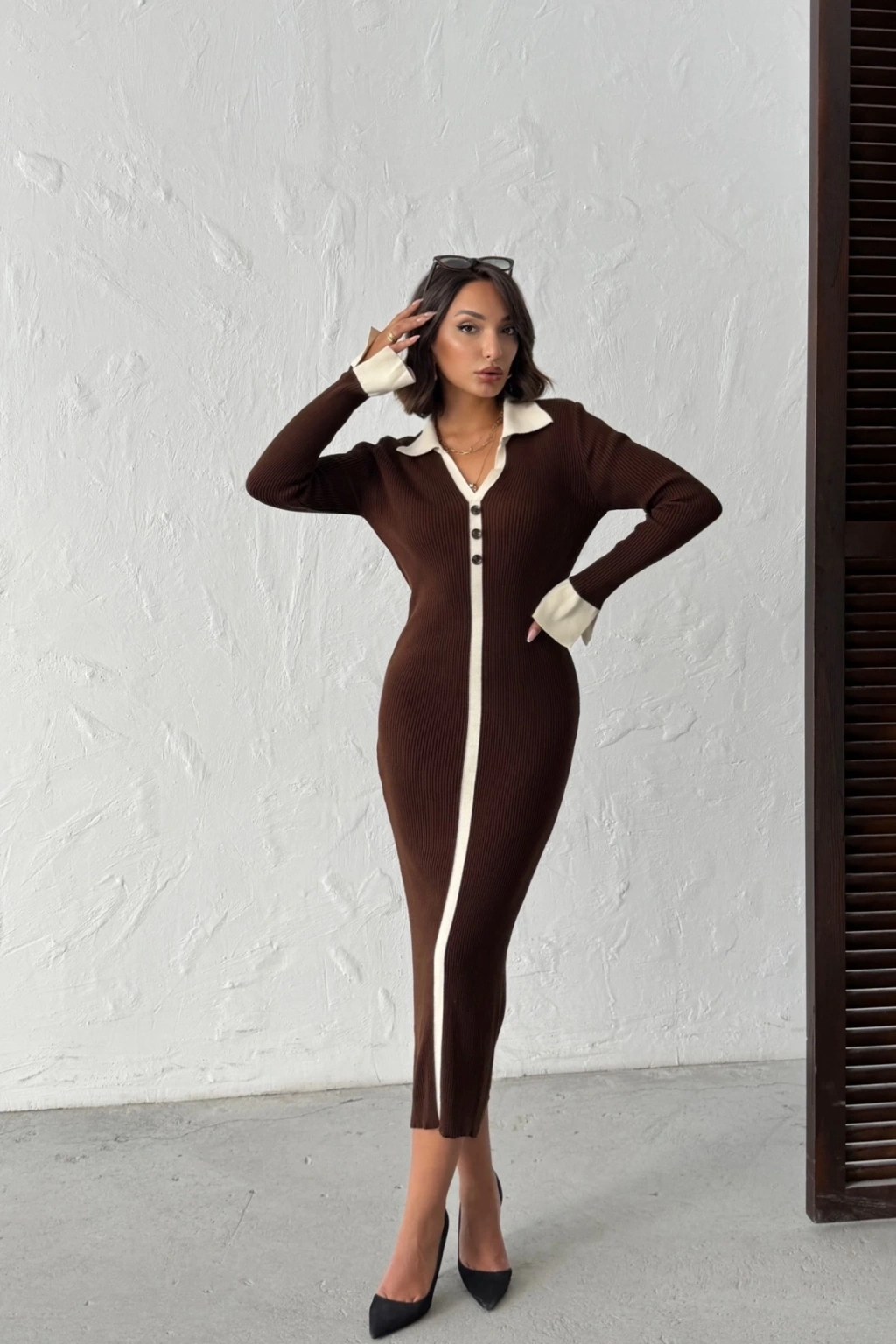 Kadın Kahverengi Polo Yaka Şık Kol Detaylı Midi Triko Elbise (Yeni Renk)