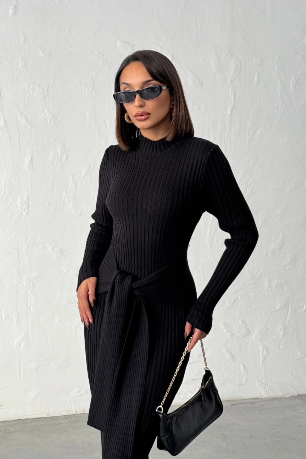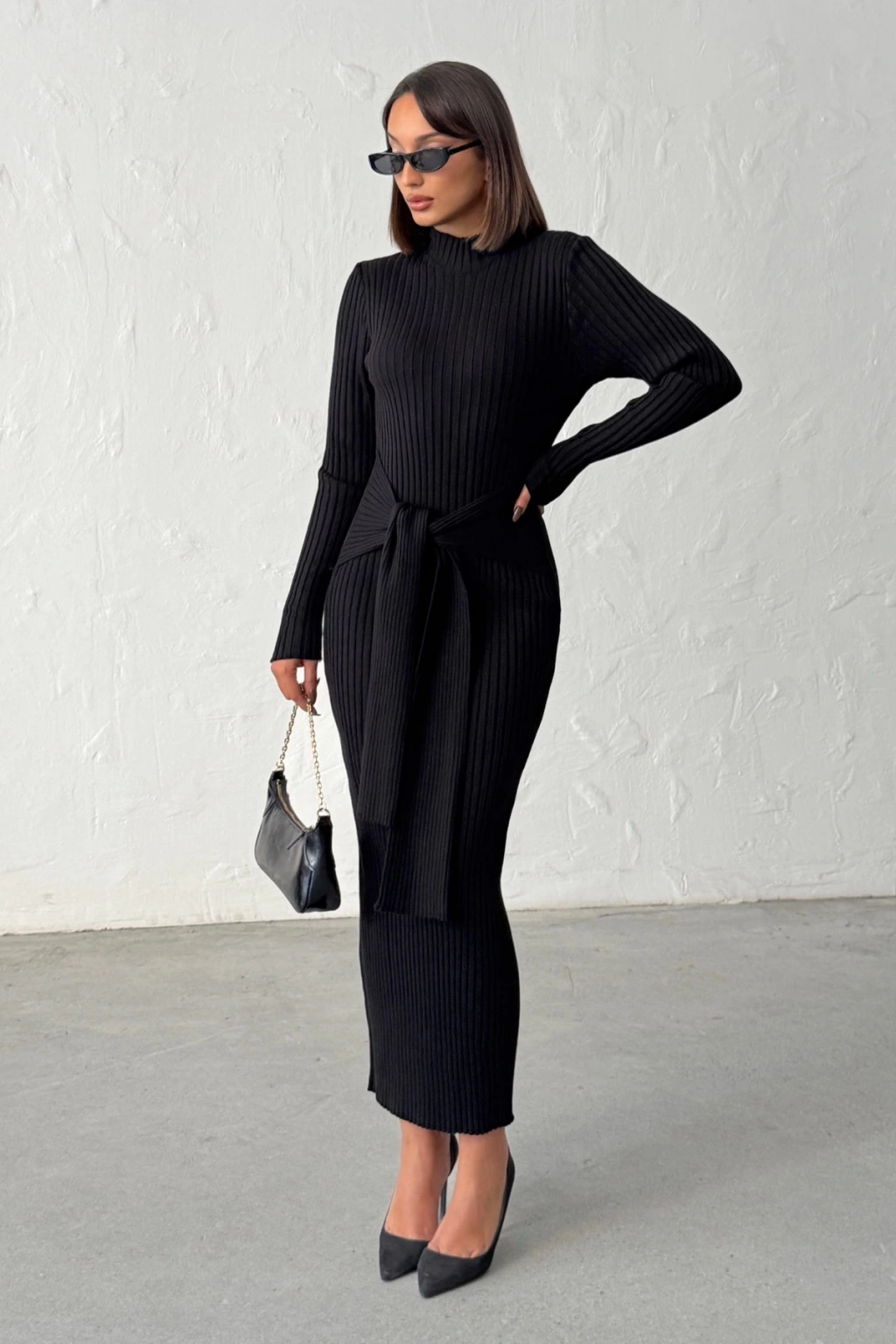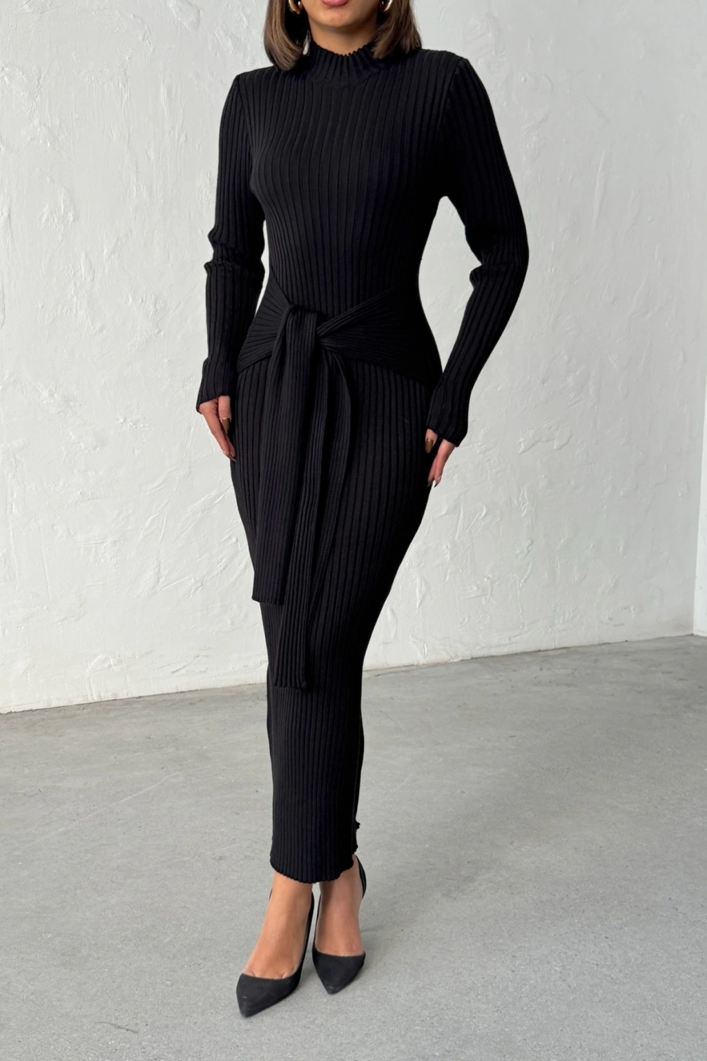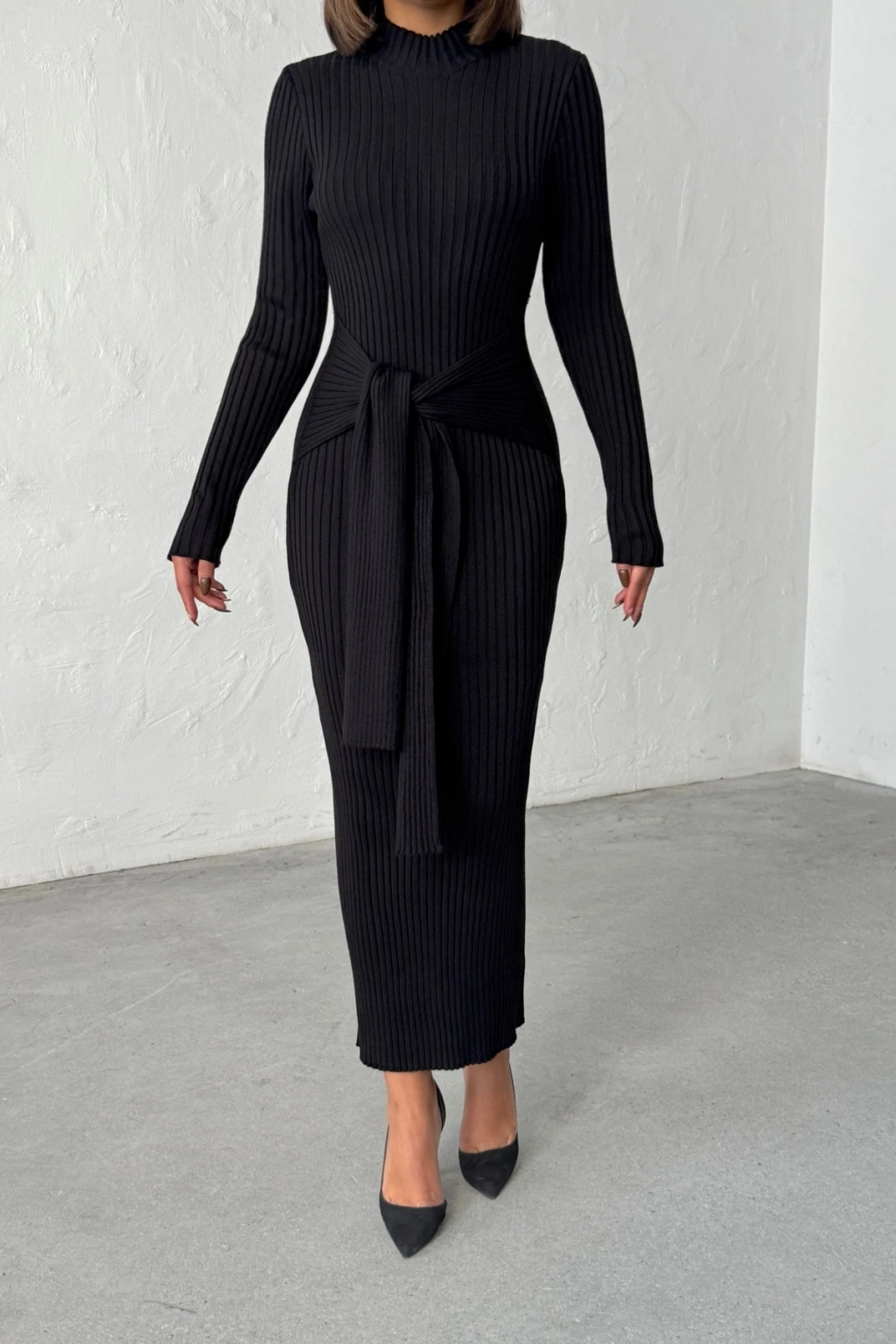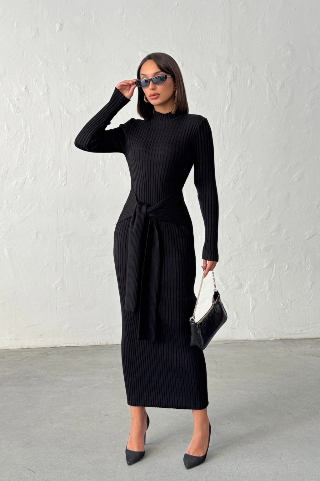 Kadın Siyah Şık Bağlama Detaylı Midi Triko Elbise