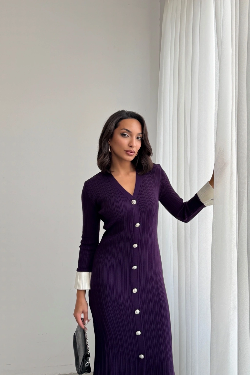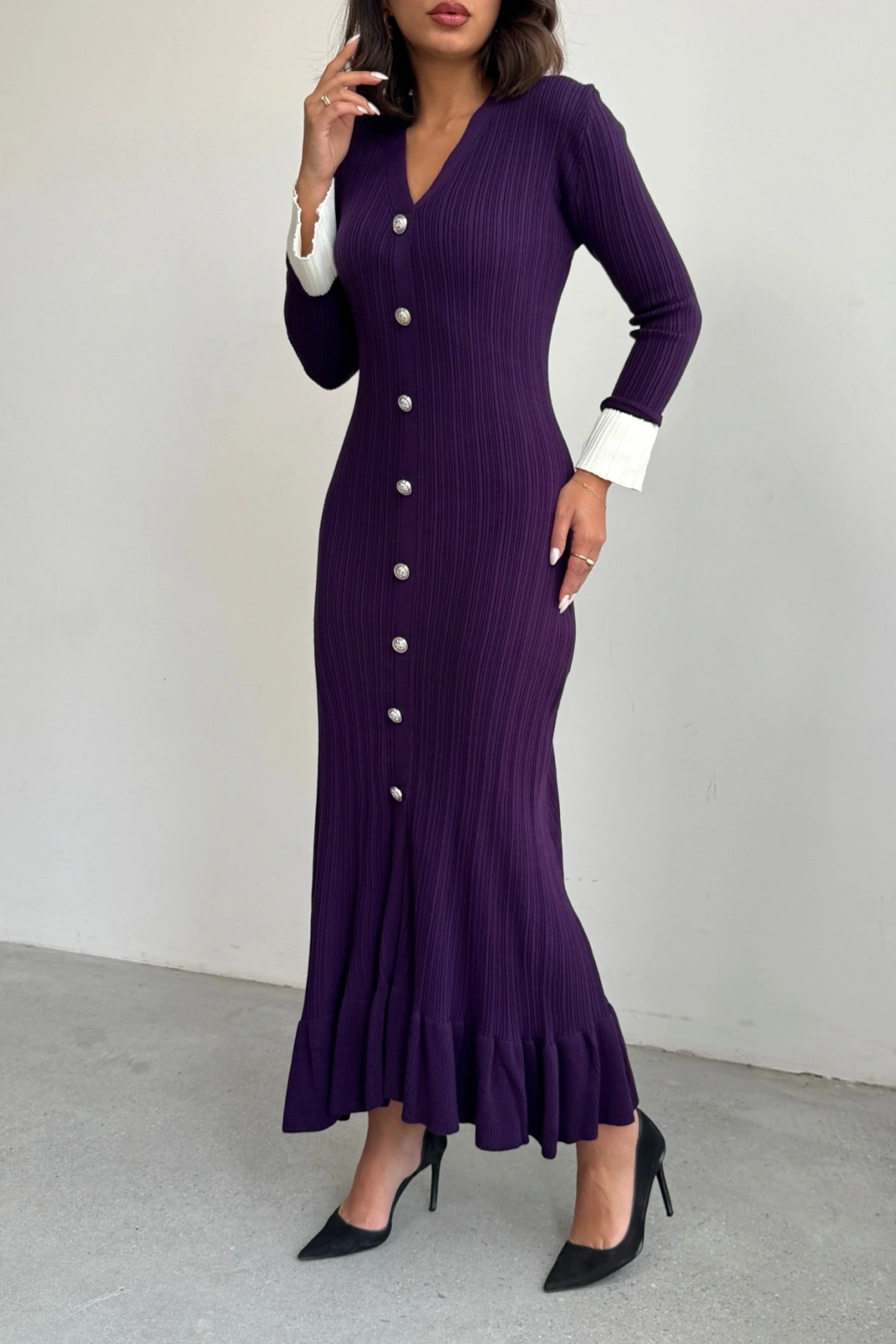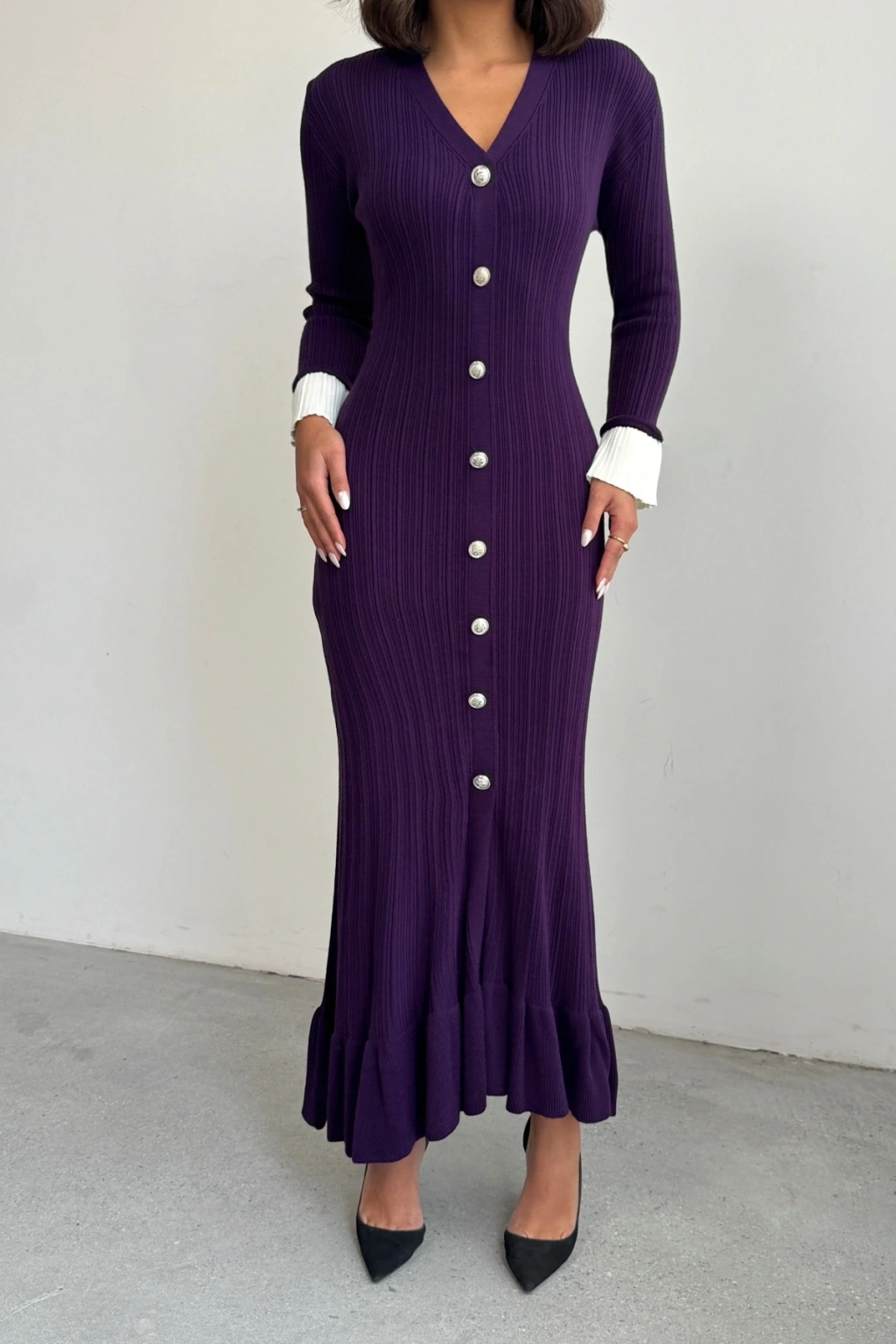 Kadın Mor Şık Bilek Boy Kol Boydan Düğmeli Uzun Triko Elbise