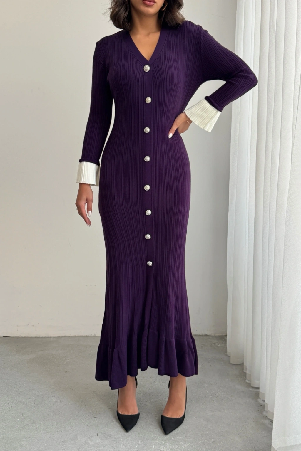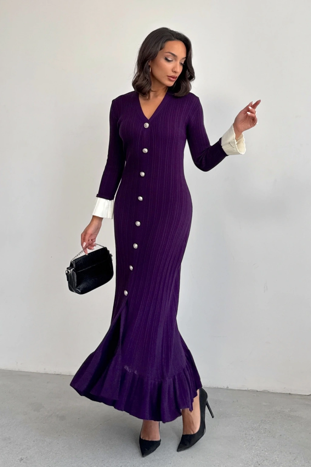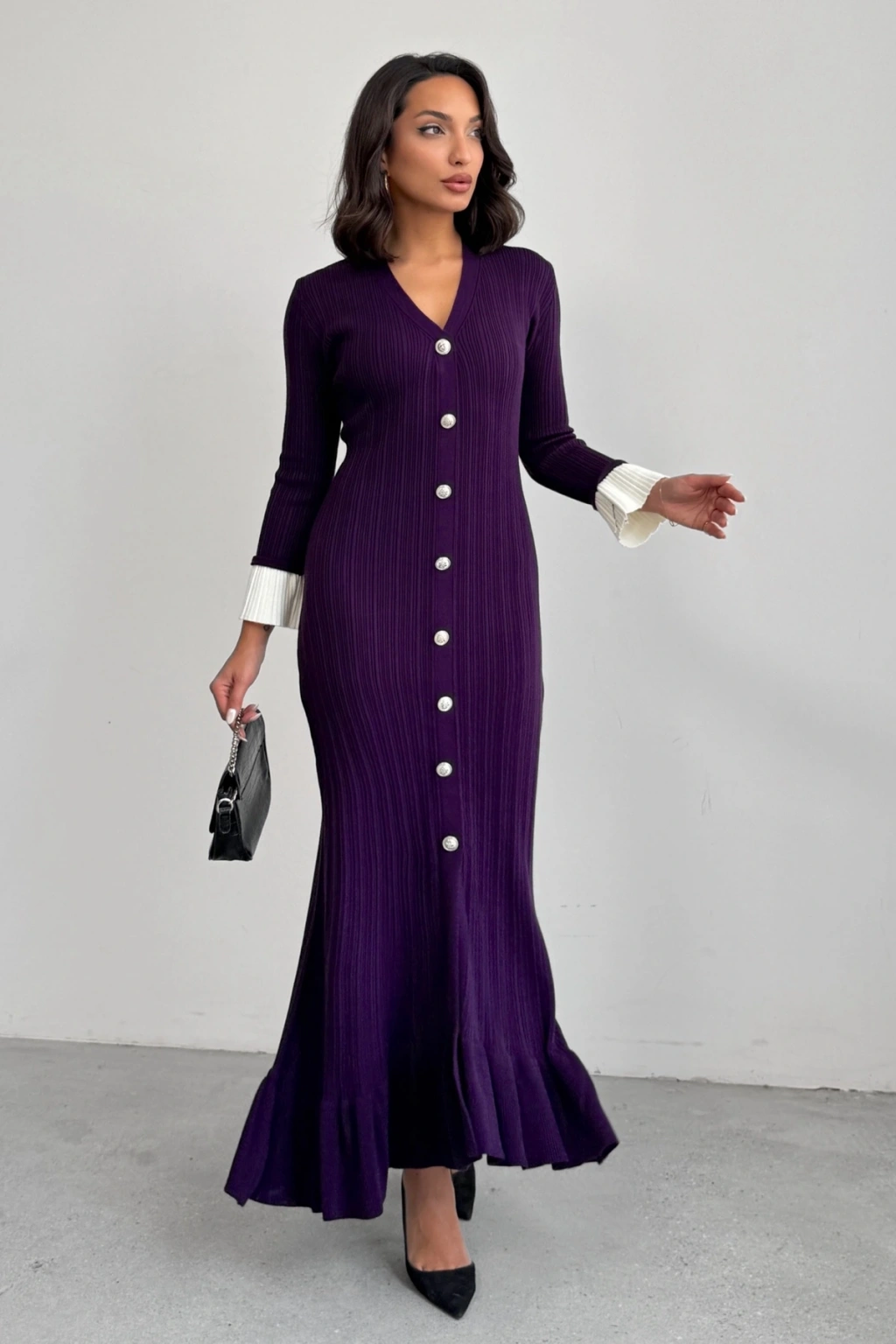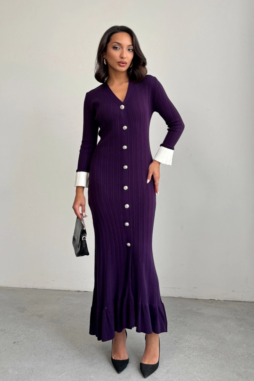 Kadın Mor Şık Bilek Boy Kol Boydan Düğmeli Uzun Triko Elbise