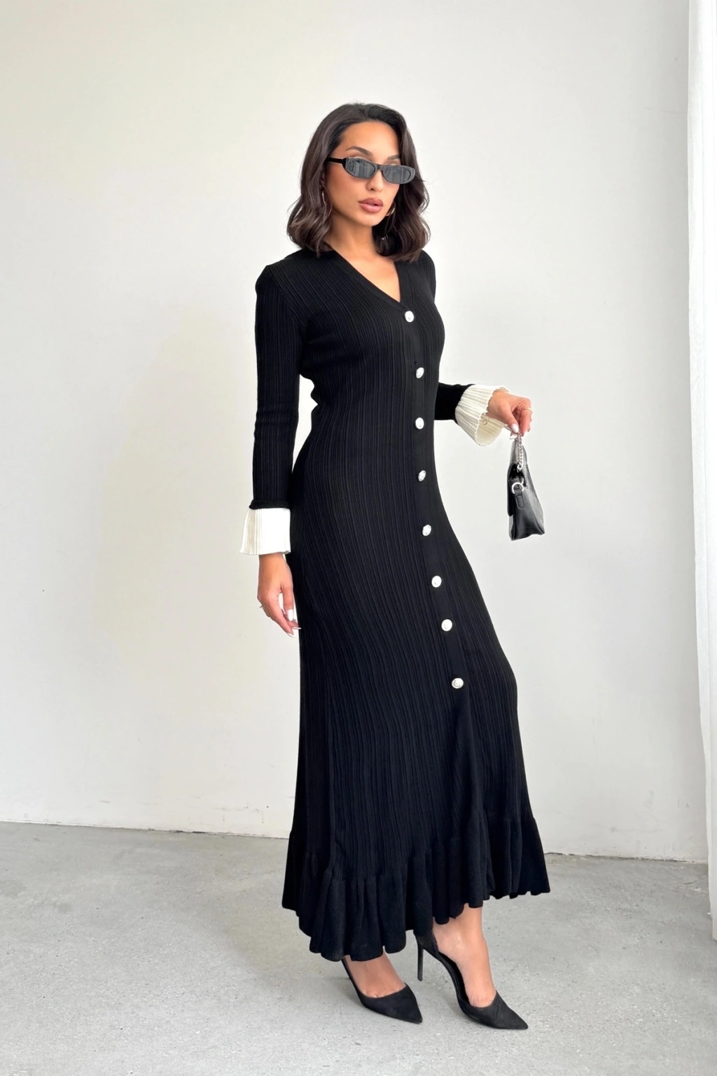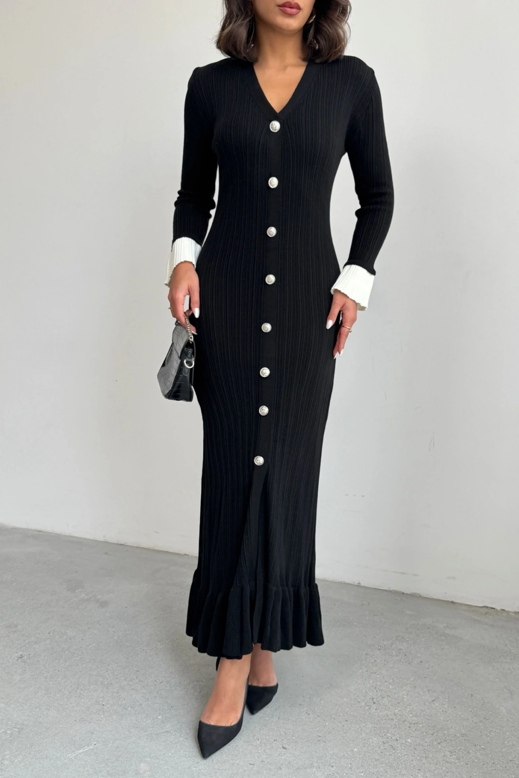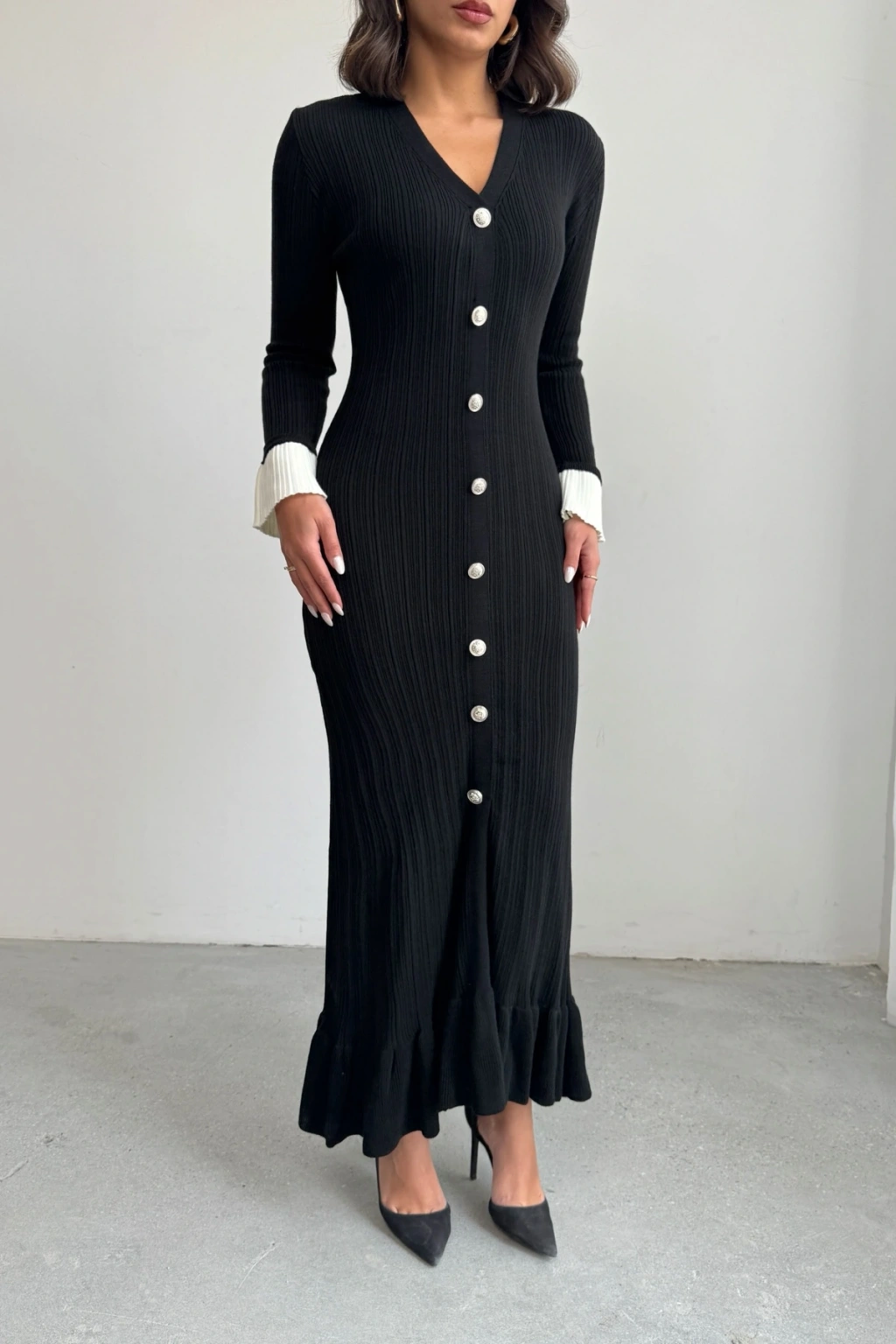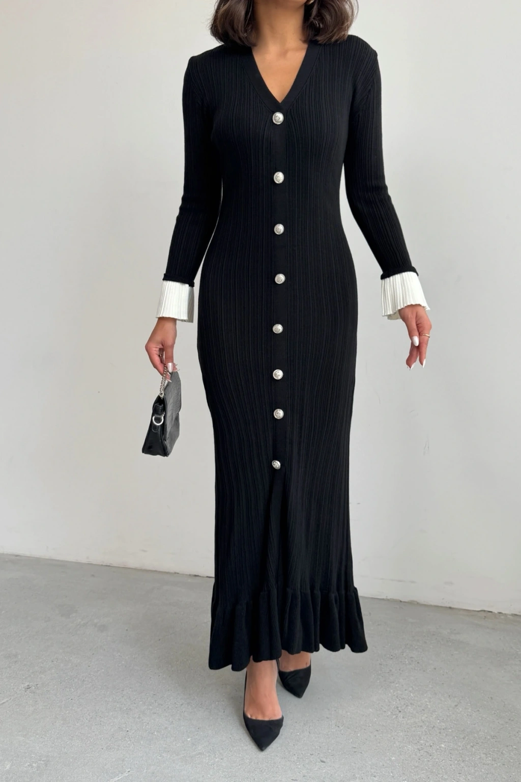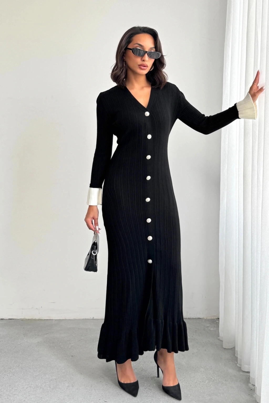 Kadın Siyah Şık Bilek Boy Kol Boydan Düğmeli Uzun Triko Elbise