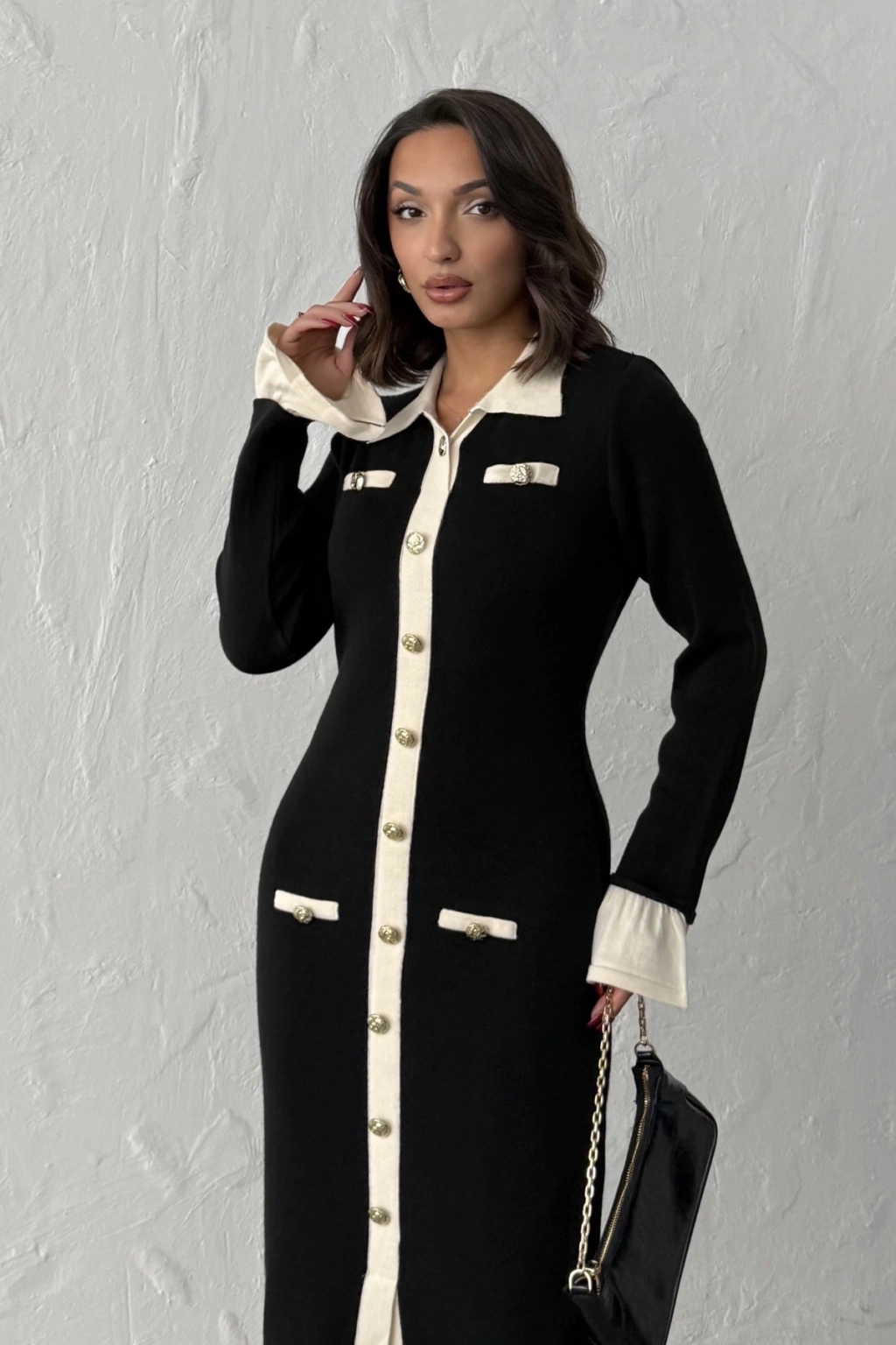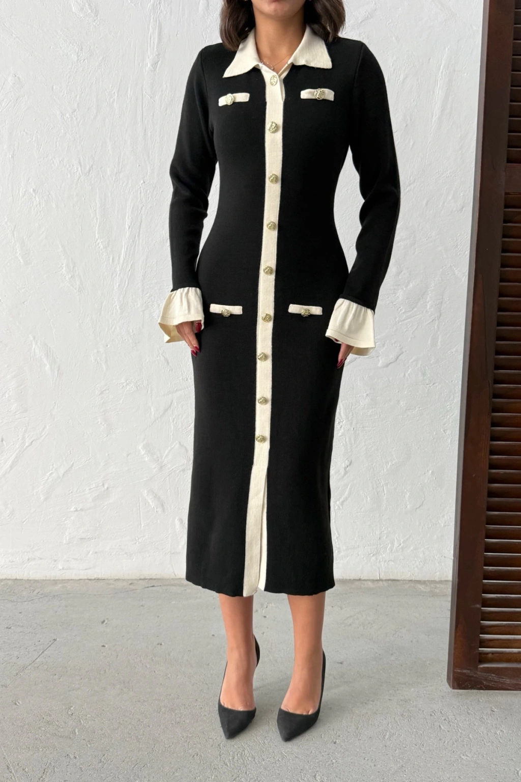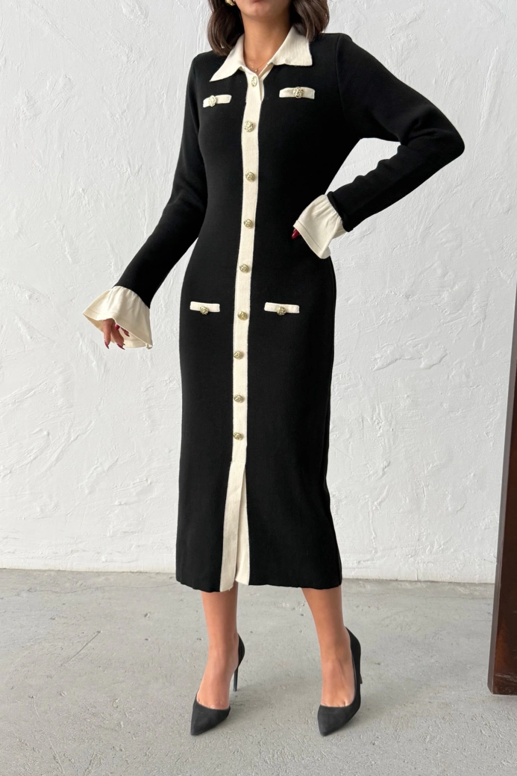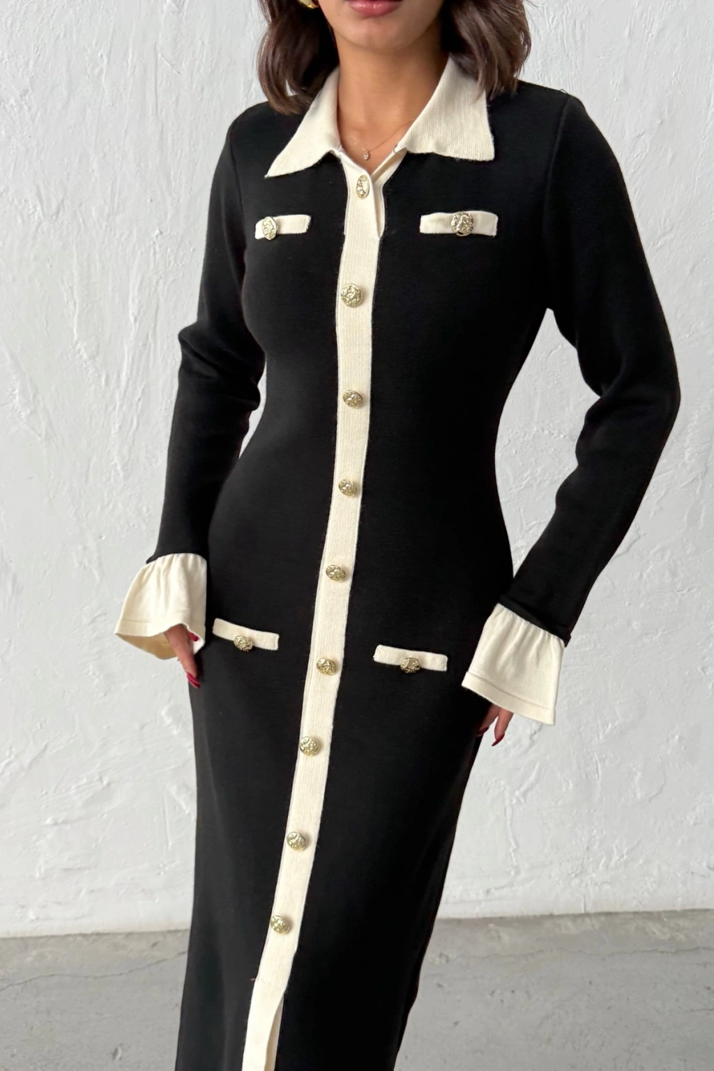 Kadın Siyah Şık Gold Düğme Detaylı Zarif Uzun Kol Triko Elbise
