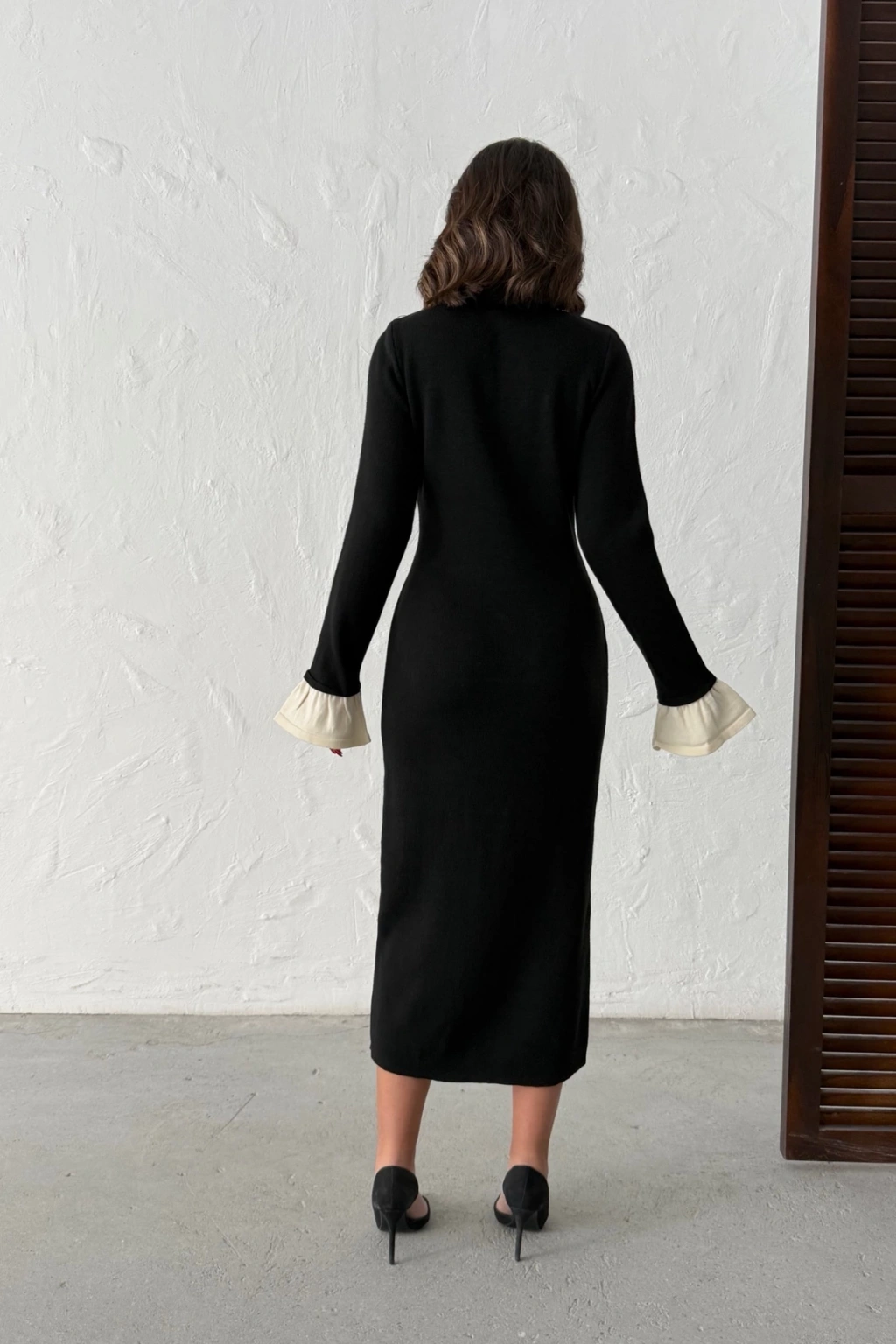 Kadın Siyah Şık Düğme Ve Kol Detaylı Triko Elbise
