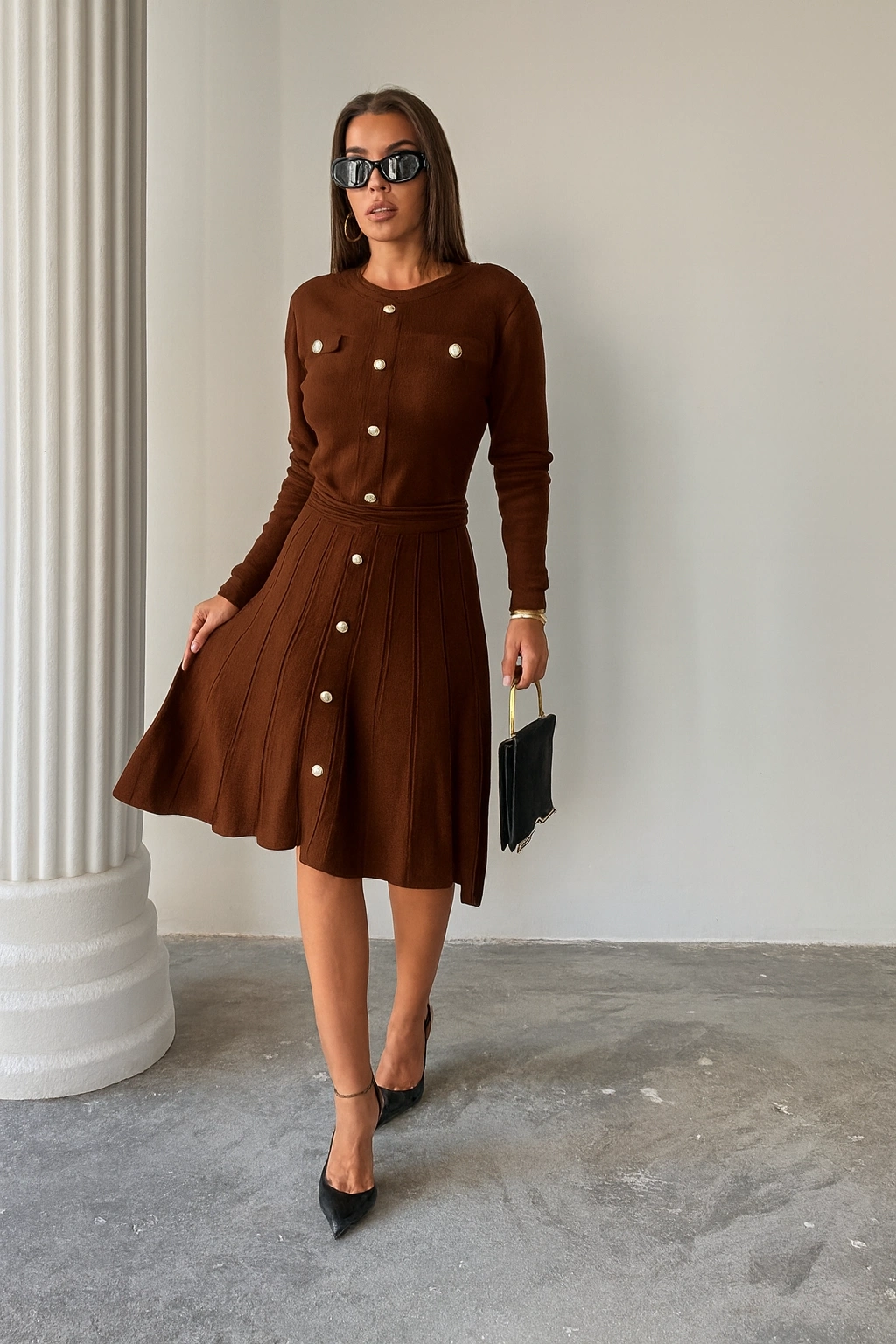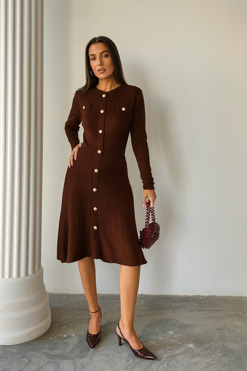 Kadın Kahverengi Şık Gold Düğme Detaylı Zarif Uzun Kol Triko Elbise (Yeni Renk)