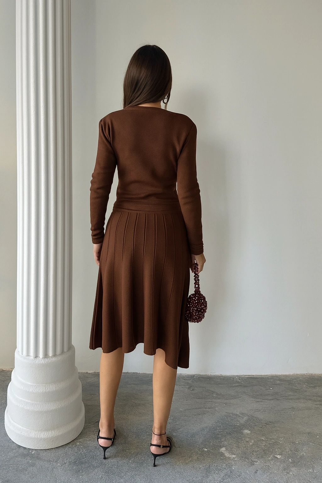 Kadın Kahverengi Kol Düğme ve Fırfır Detaylı Şık Uzun Triko Elbise (Yeni Renk)