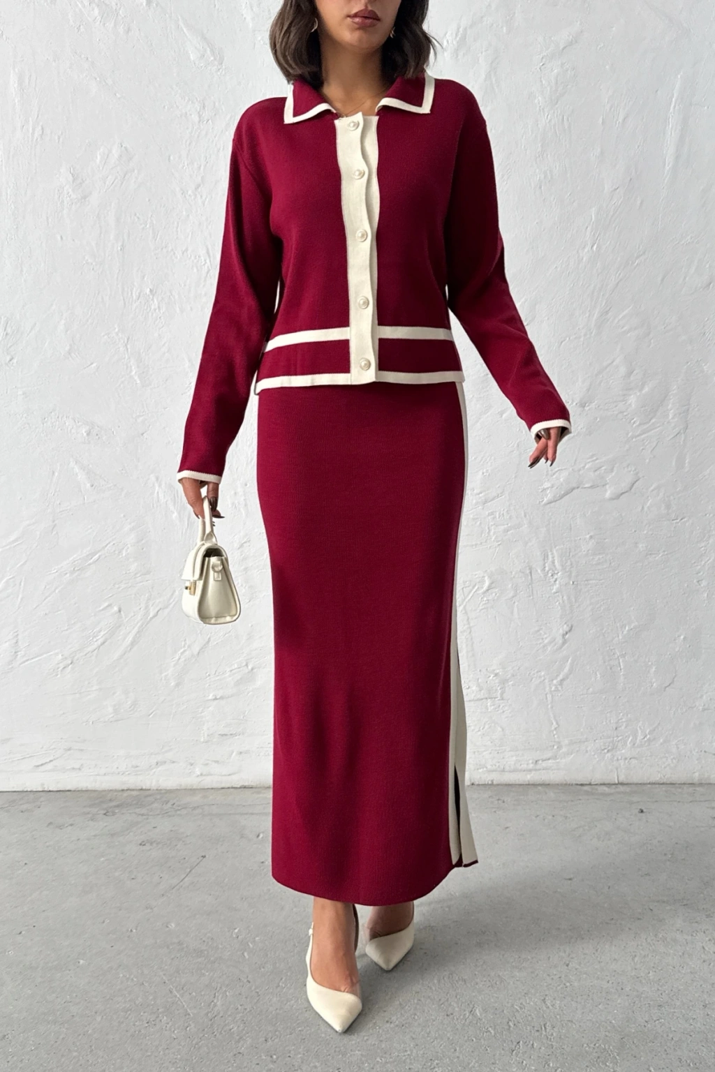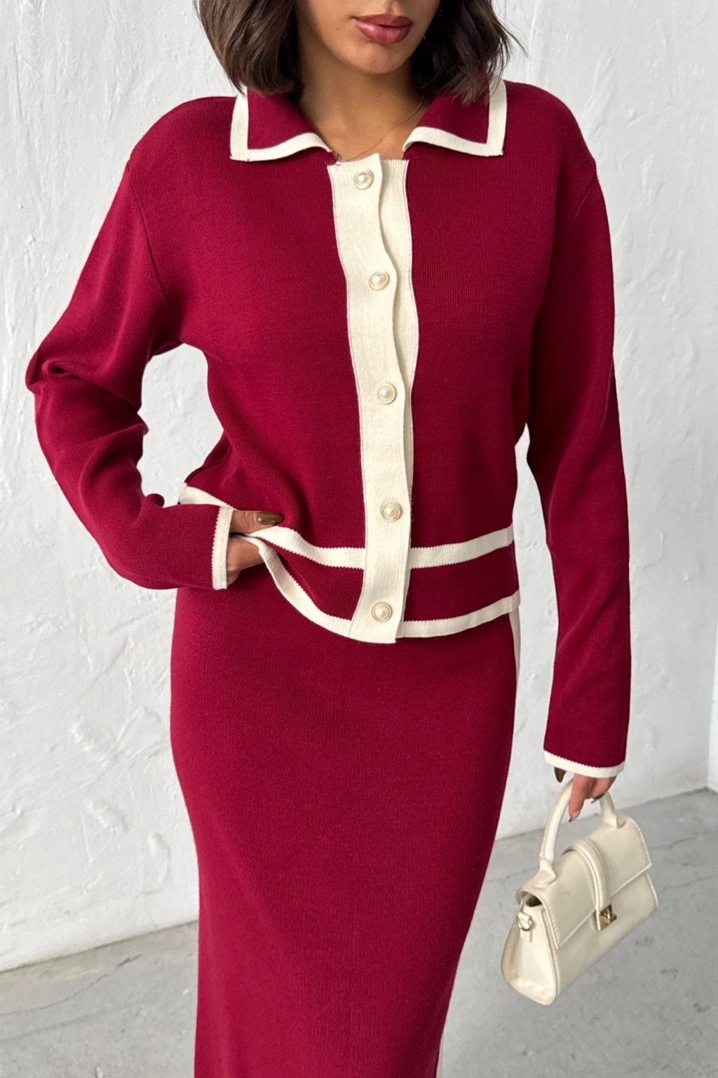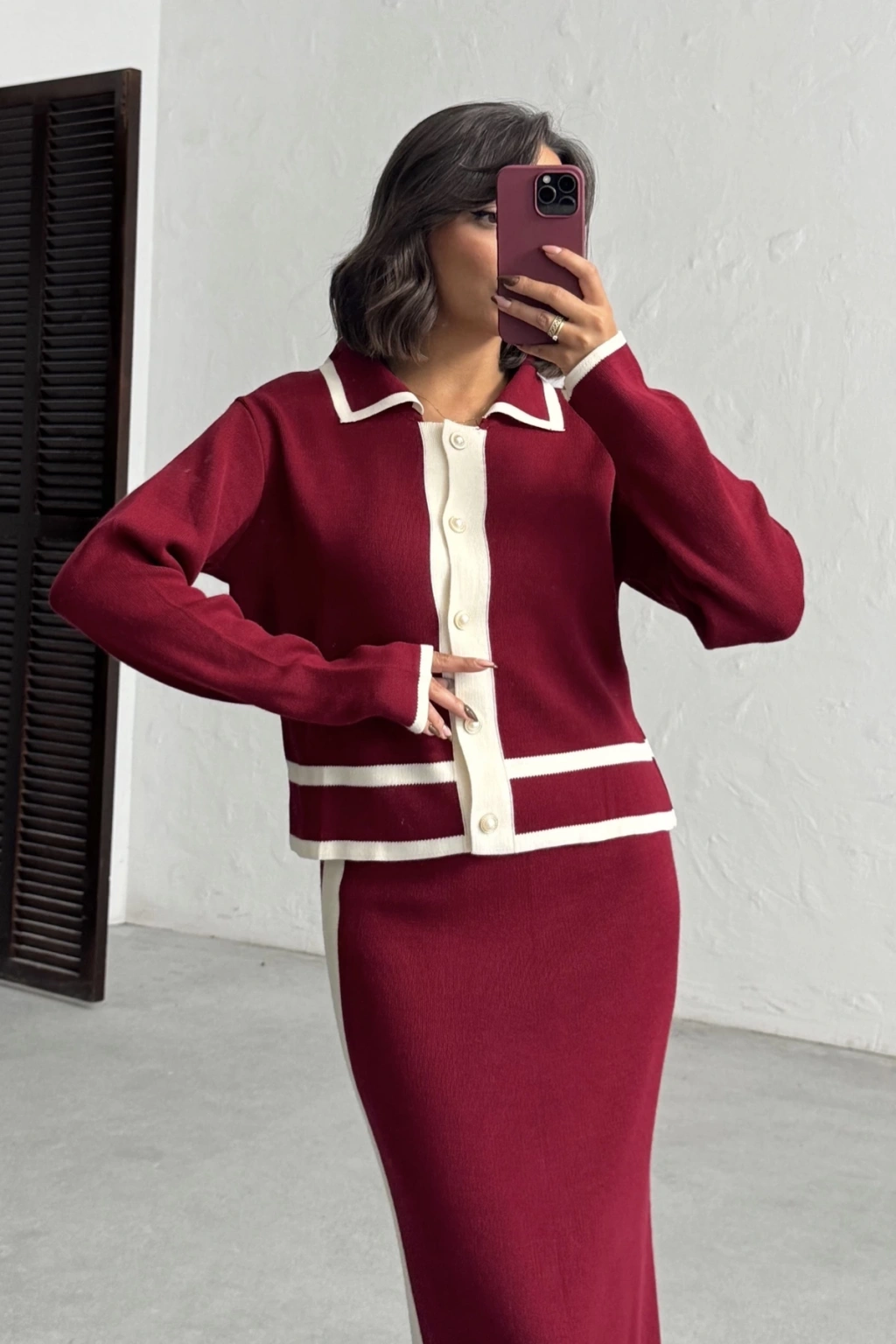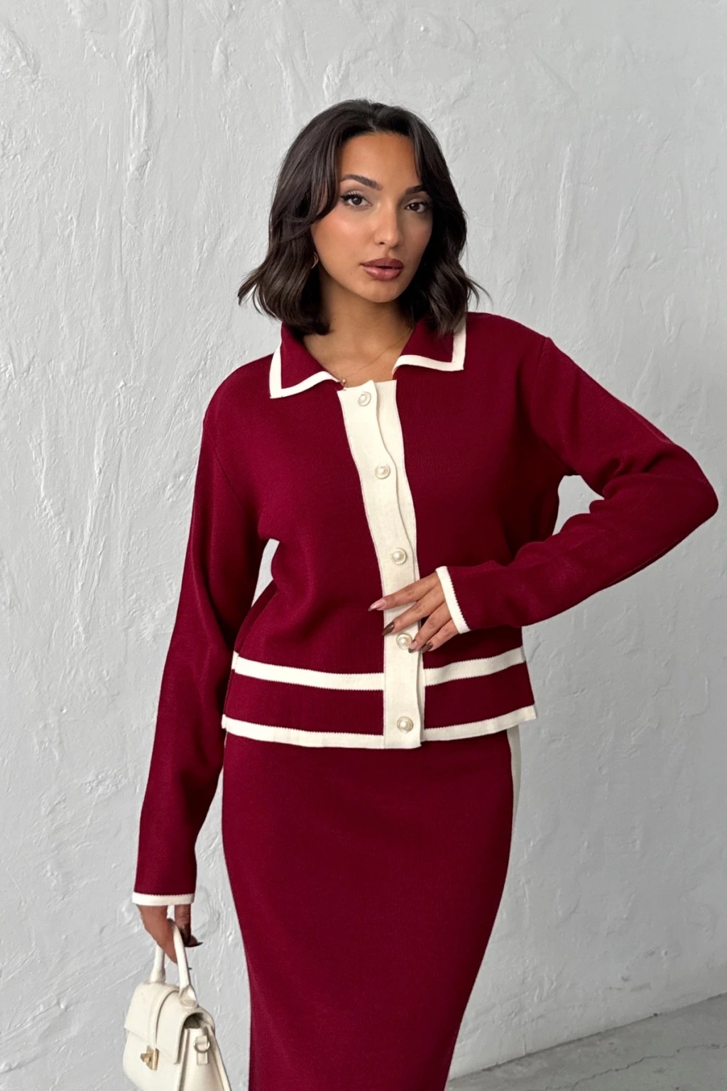 Kadın Bordo Şık İnci Düğme Detaylı Hırka Etek Alt Üst Triko Takım