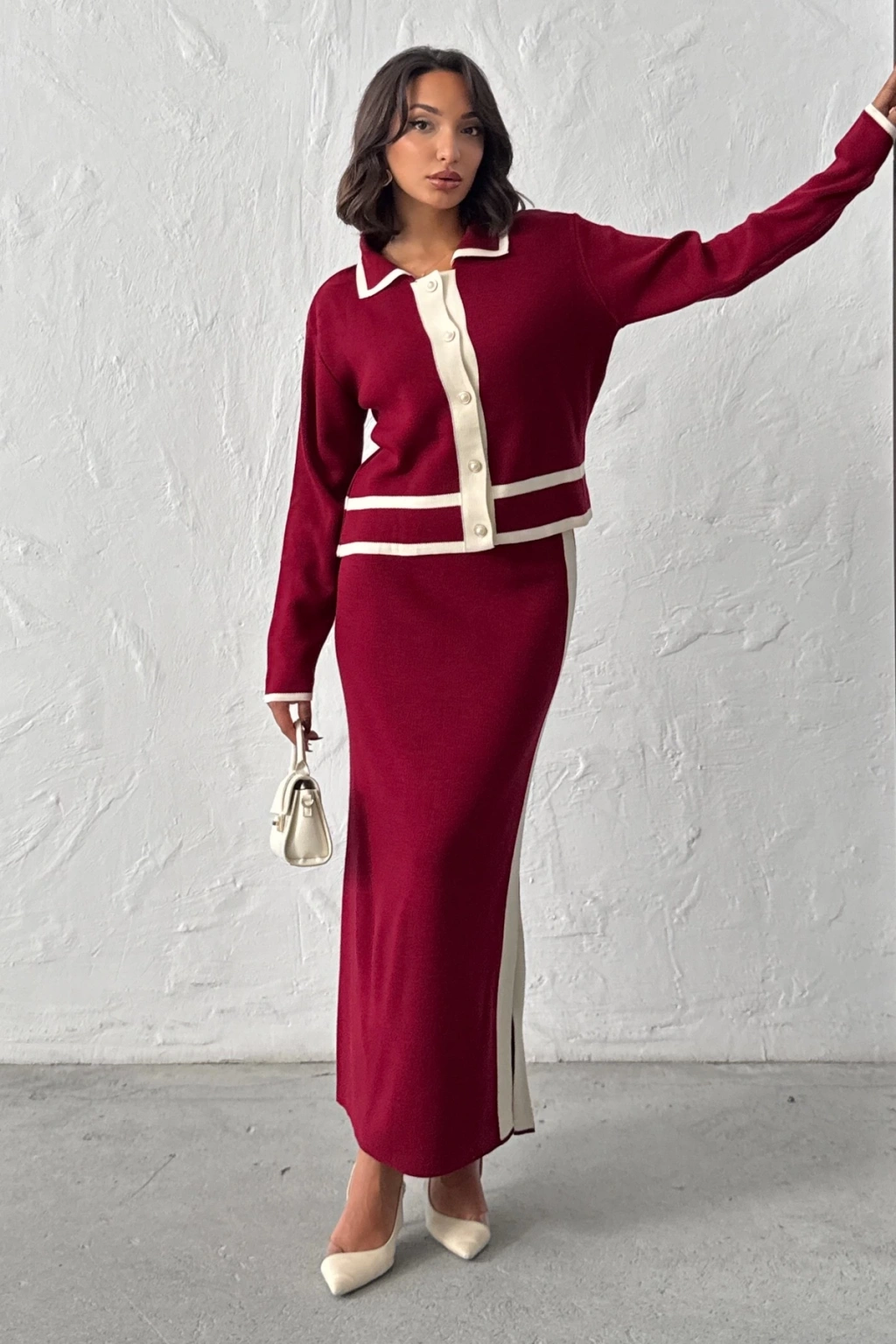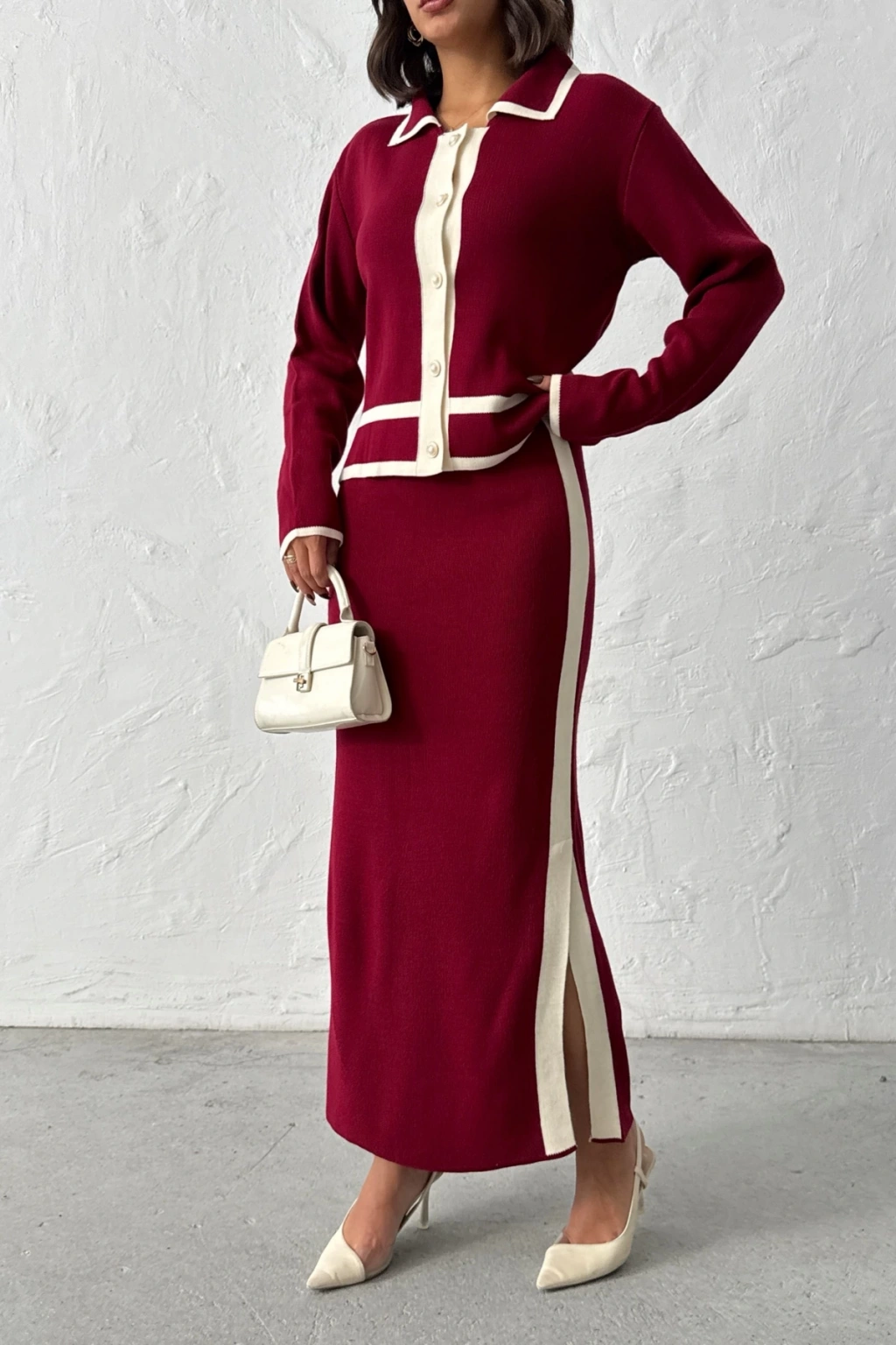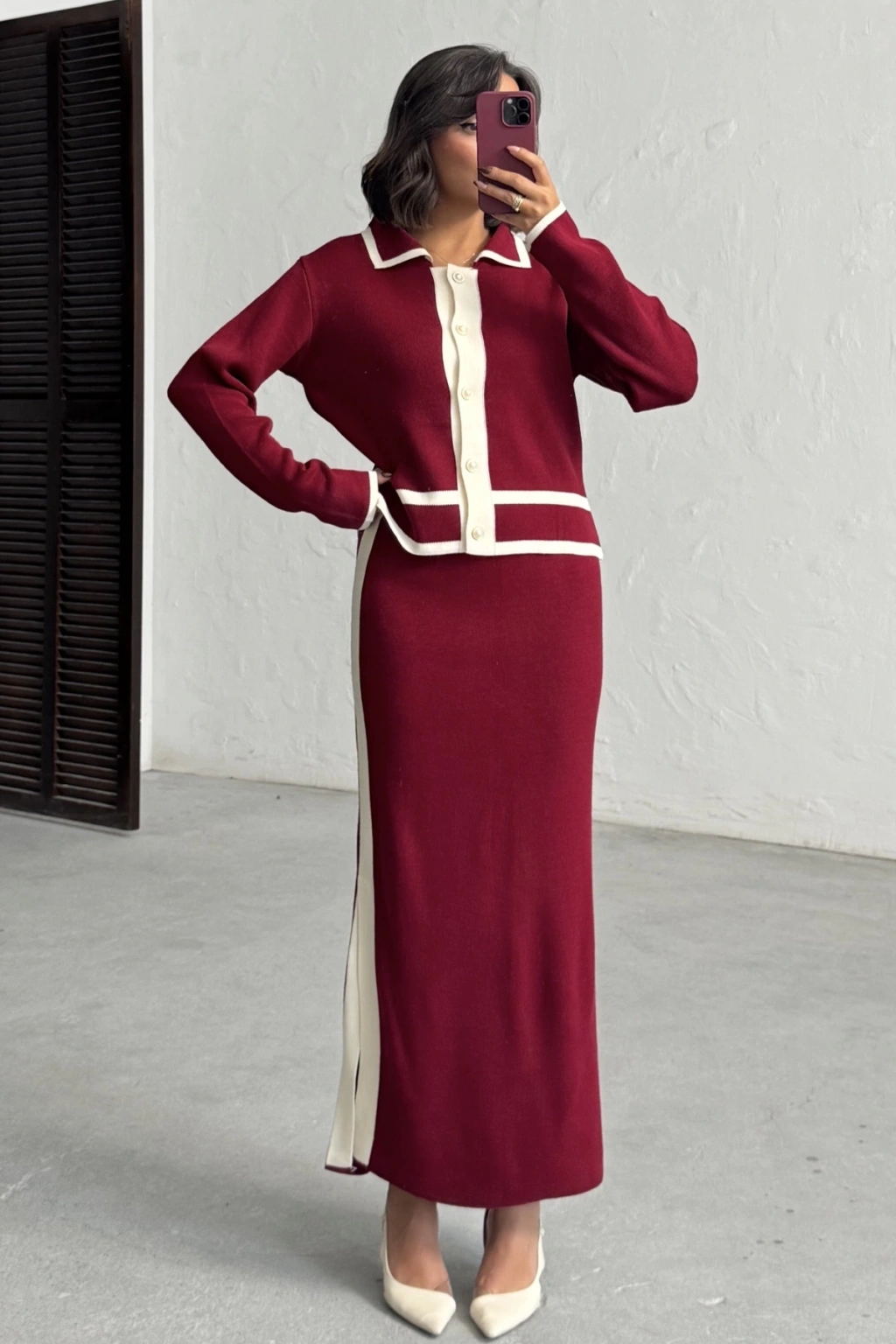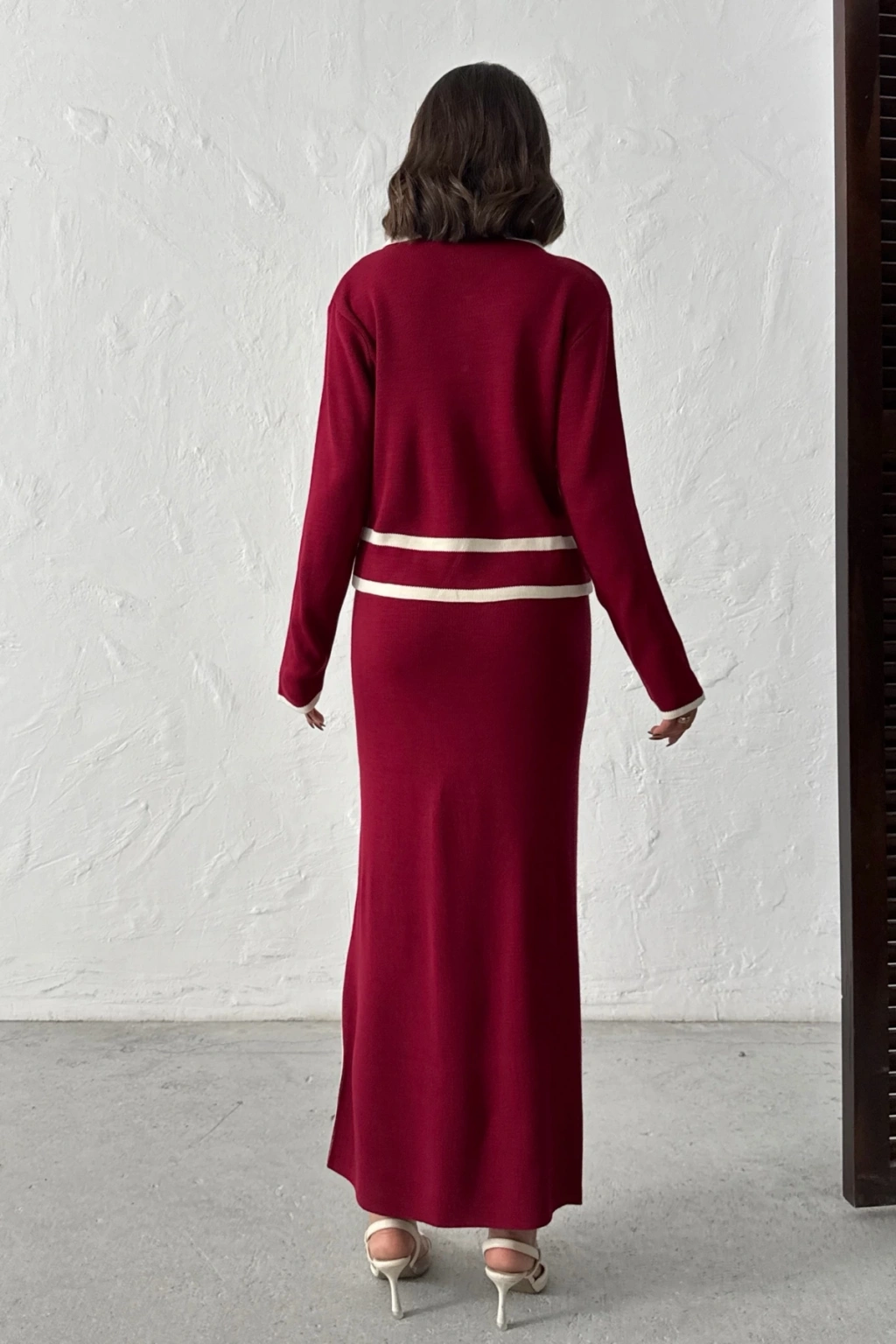 Kadın Bordo Şık İnci Düğme Detaylı Hırka Etek Alt Üst Triko Takım