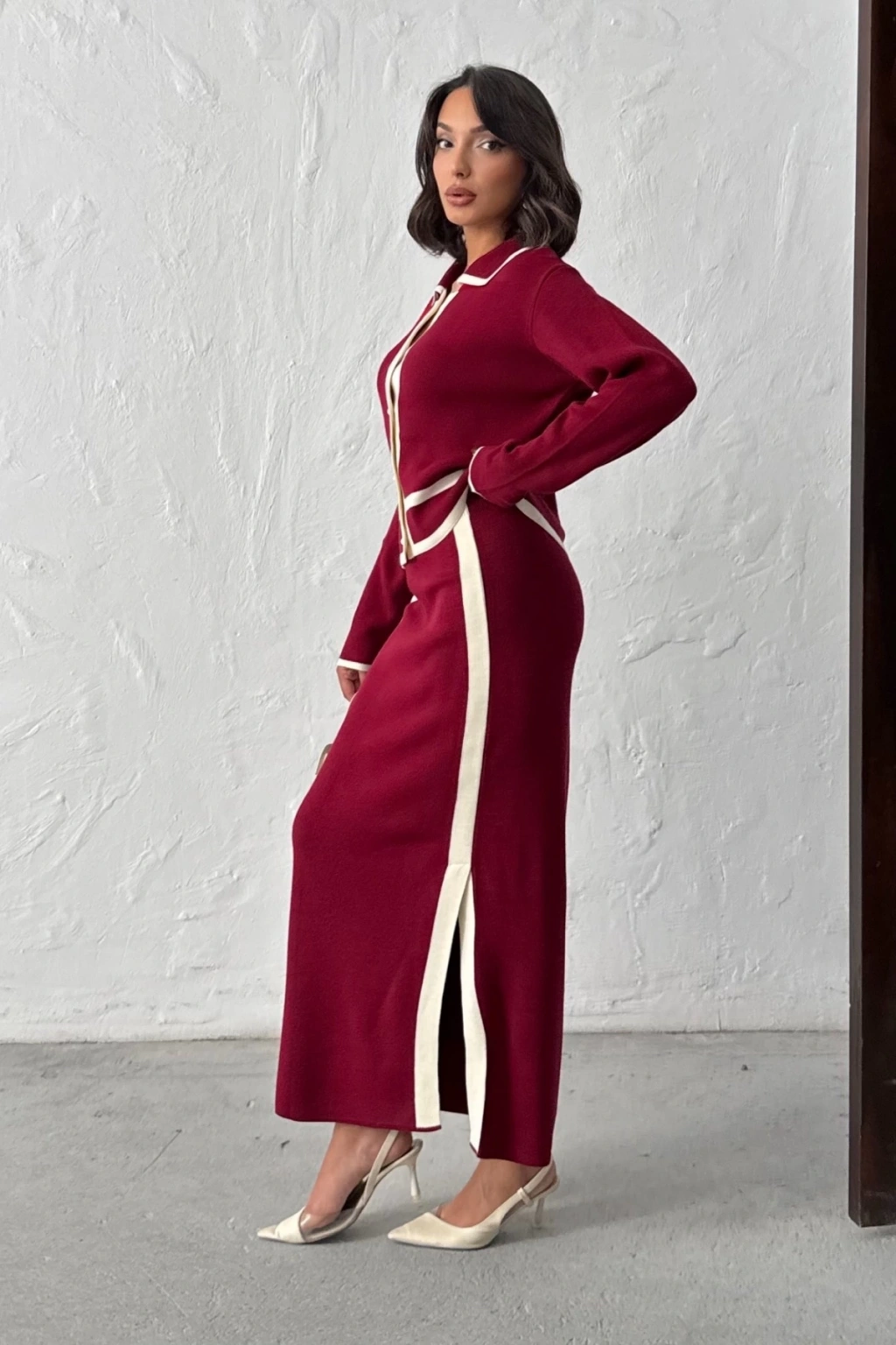 Kadın Bordo Şık Yaka Detaylı Kazak Pantolon Alt Üst İkili Triko Takım